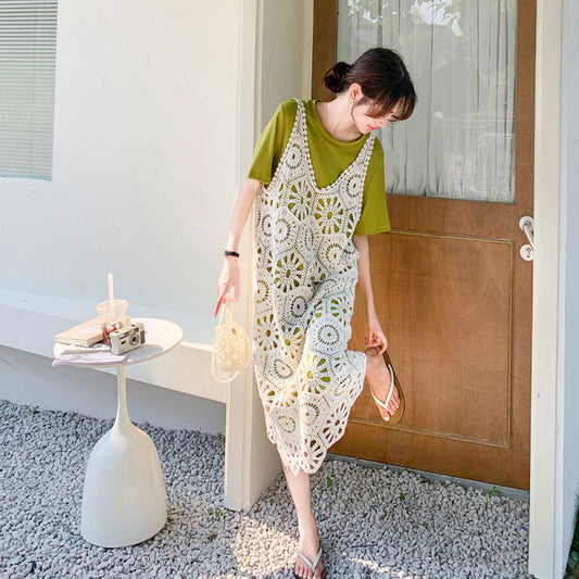 ASAYA3664 T-shirt dress with layer knitted suspender dress (two-piece suit)