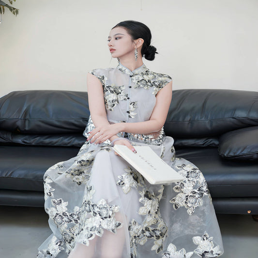 ASAYA3697 Moon and Stars Chinese Style Jacquard Beaded Embroidered Top Elastic Waist Skirt Set