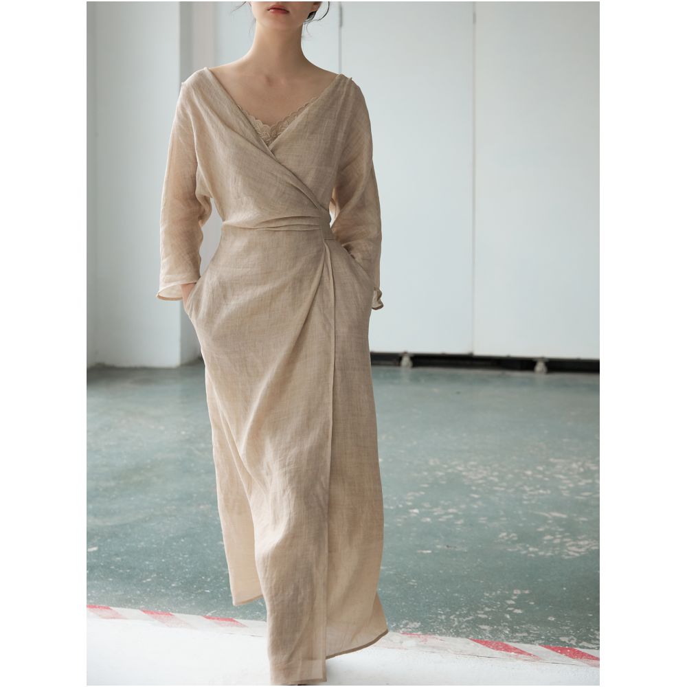Asaya2156 : Wrap-style tie design dress with V neck collar