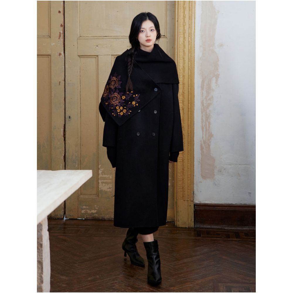 ASAYA2536 Designer hand-painted purple and gold embroidered scarf | Fully handmade double-sided woolen coat