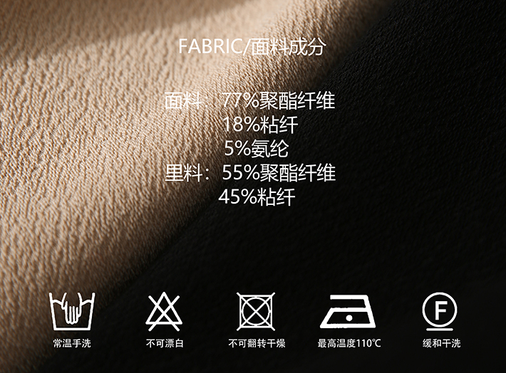 | Material composition | Polyester fiber 77% viscose fiber (viscose) 18% polyurethane elastic fiber (spandex) 5% |