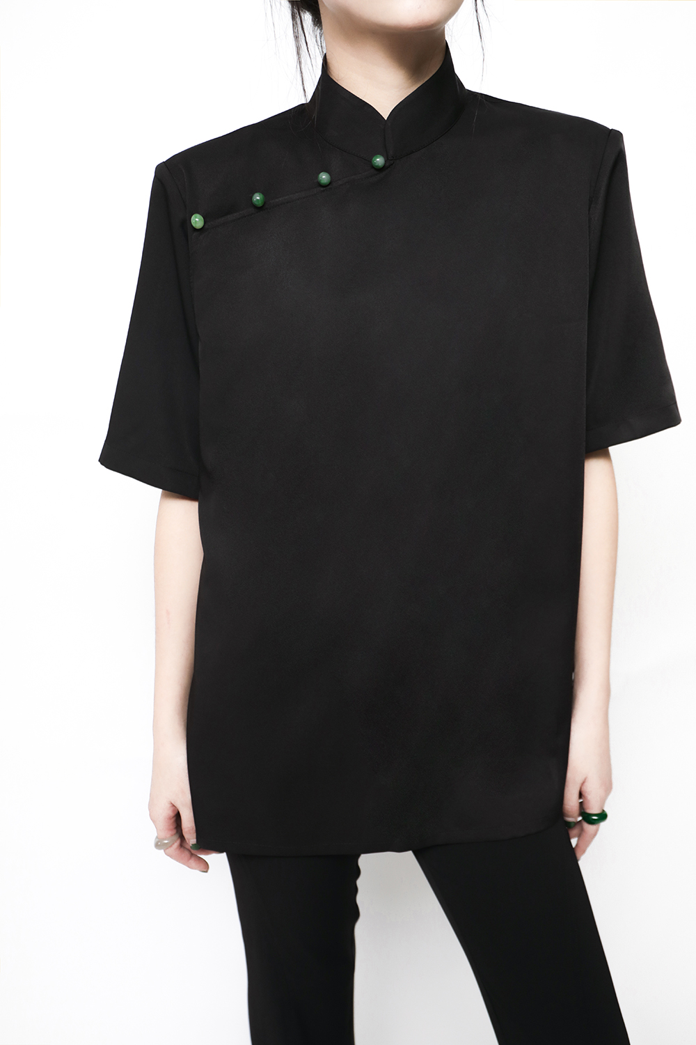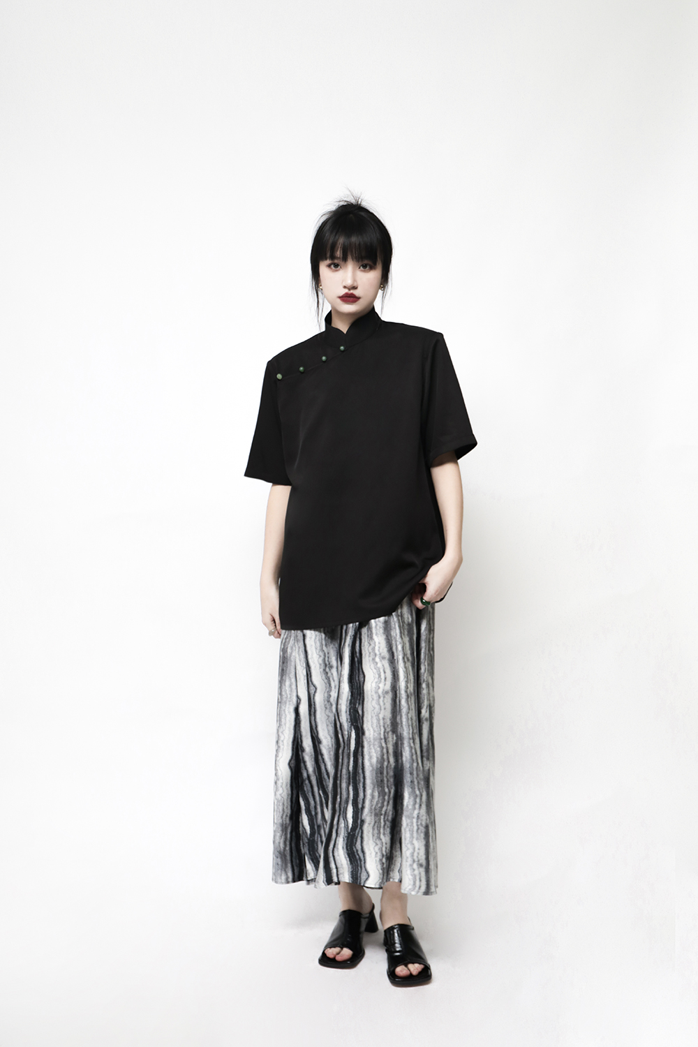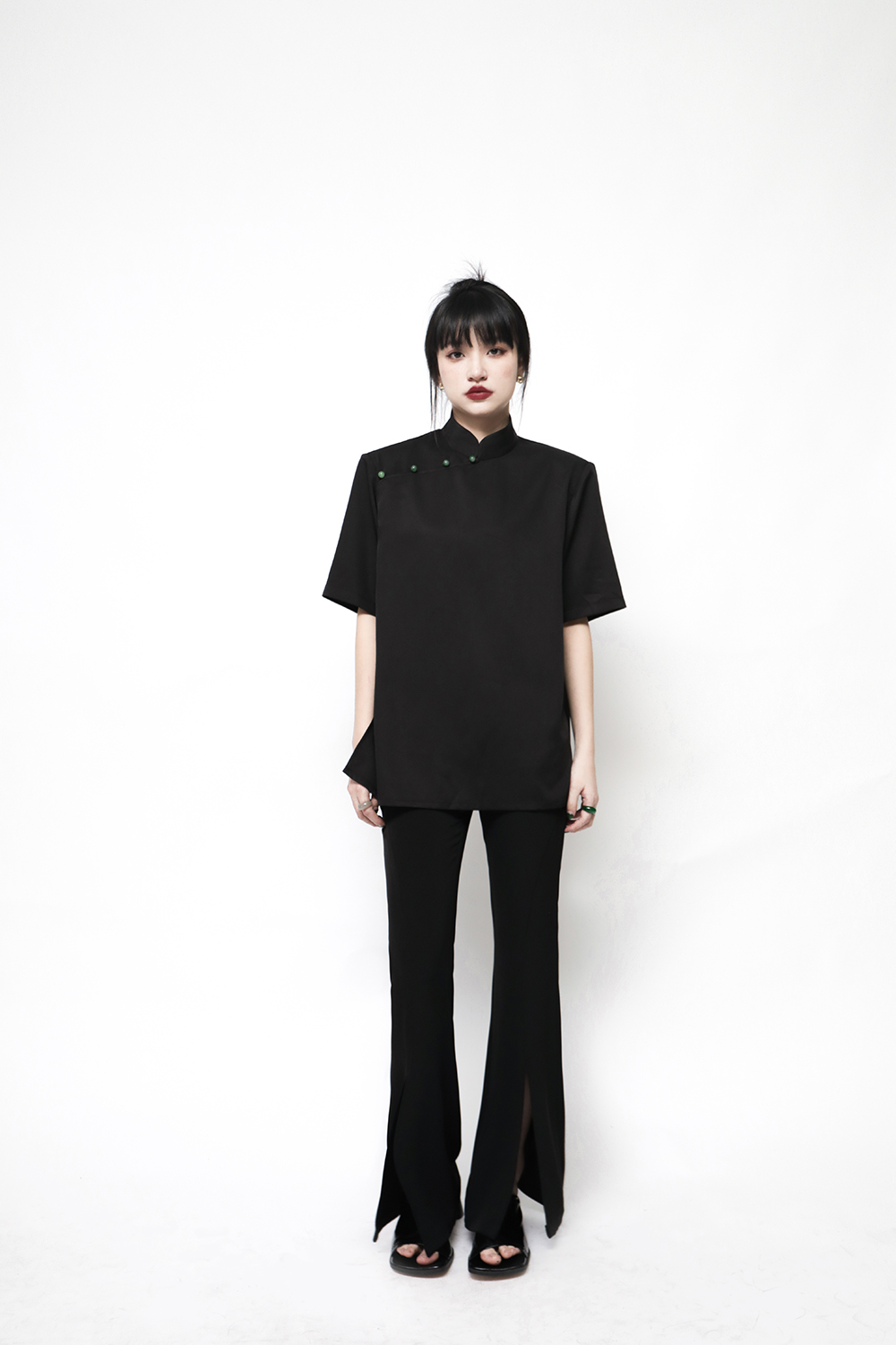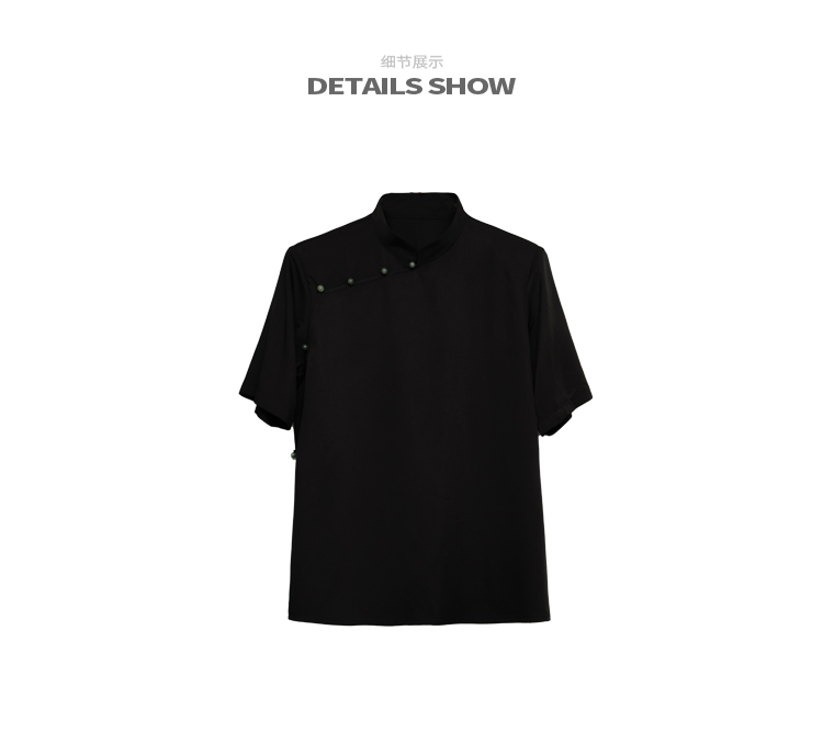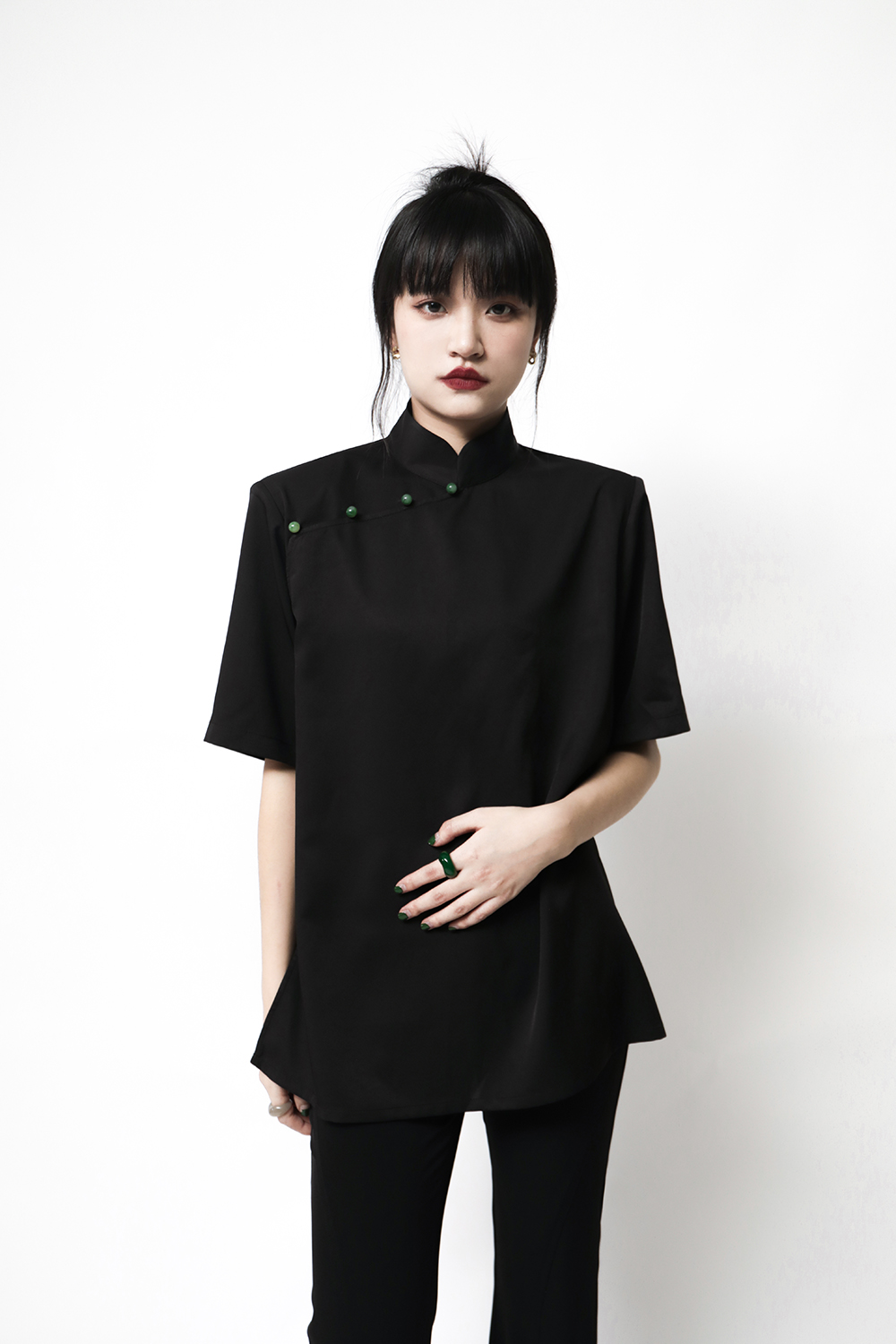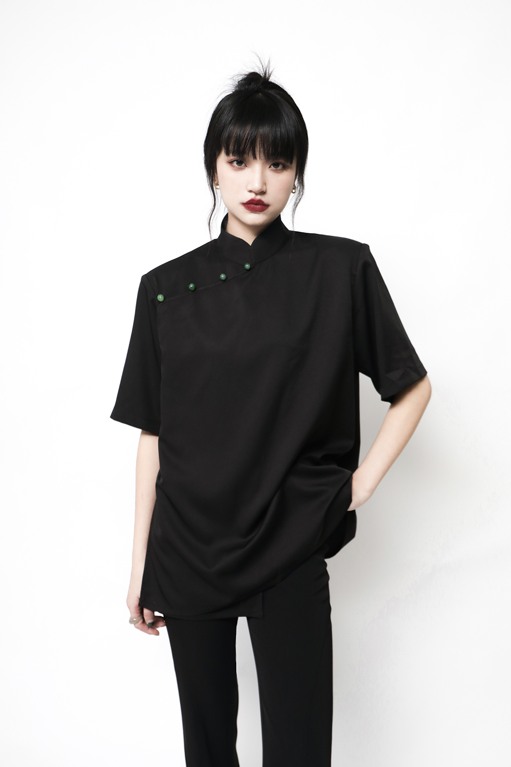 Asaya633 - APOZi Ink Stain Series Black New Chinese style Stand up Collar Shoulder Cushion Short Sleeve Shirt for Women with a Design Sense and a Small Interest Summer Top