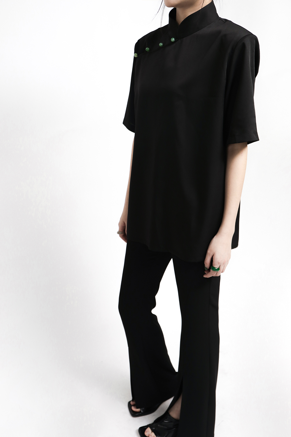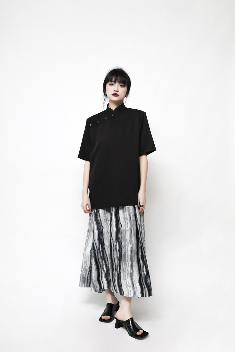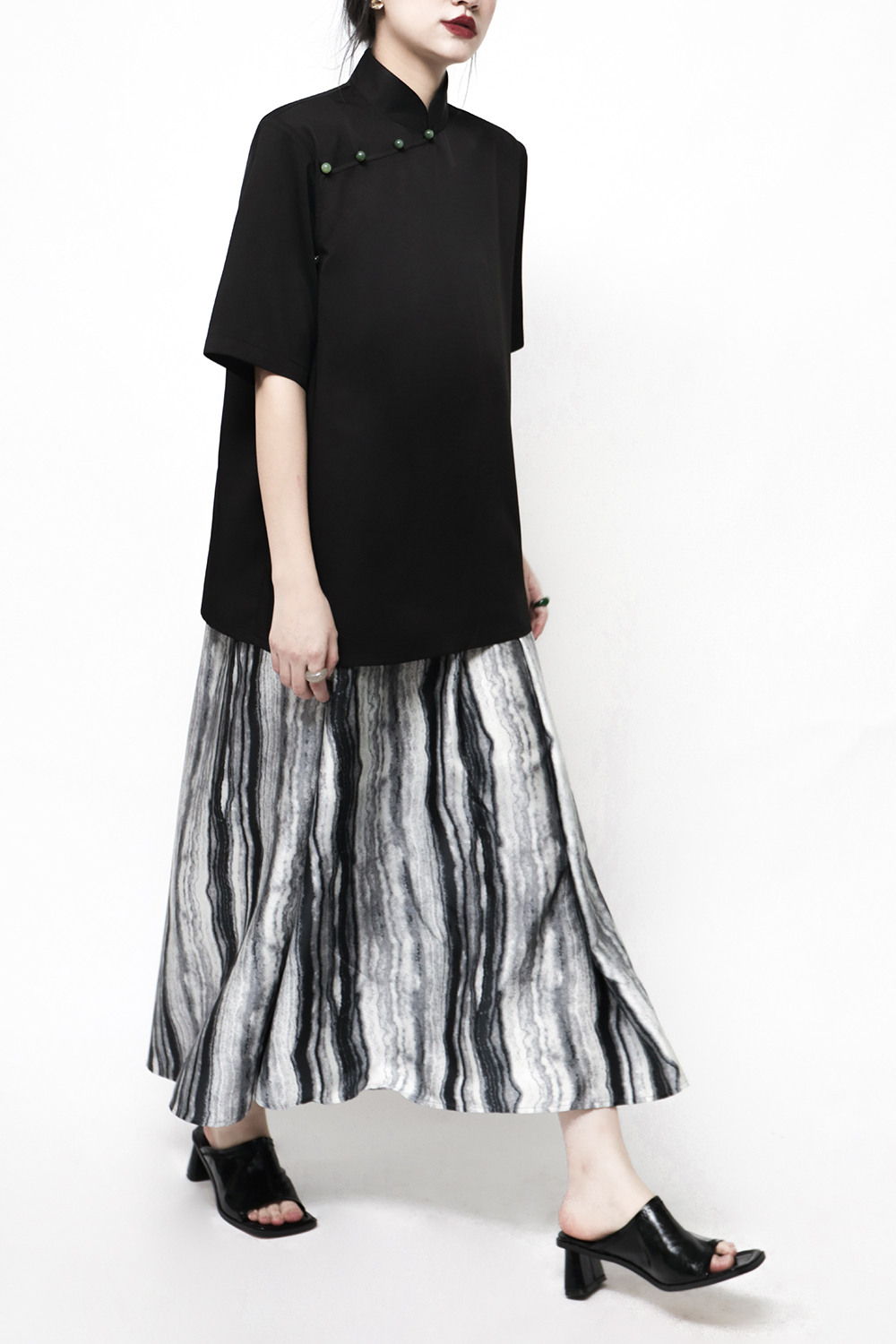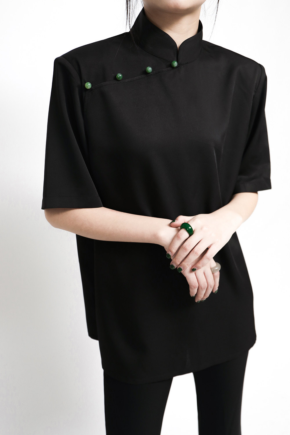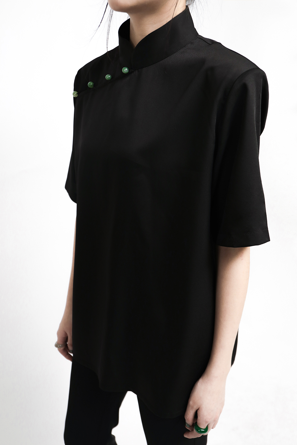Asaya633 - APOZi Ink Stain Series Black New Chinese style Stand up Collar Shoulder Cushion Short Sleeve Shirt for Women with a Design Sense and a Small Interest Summer Top