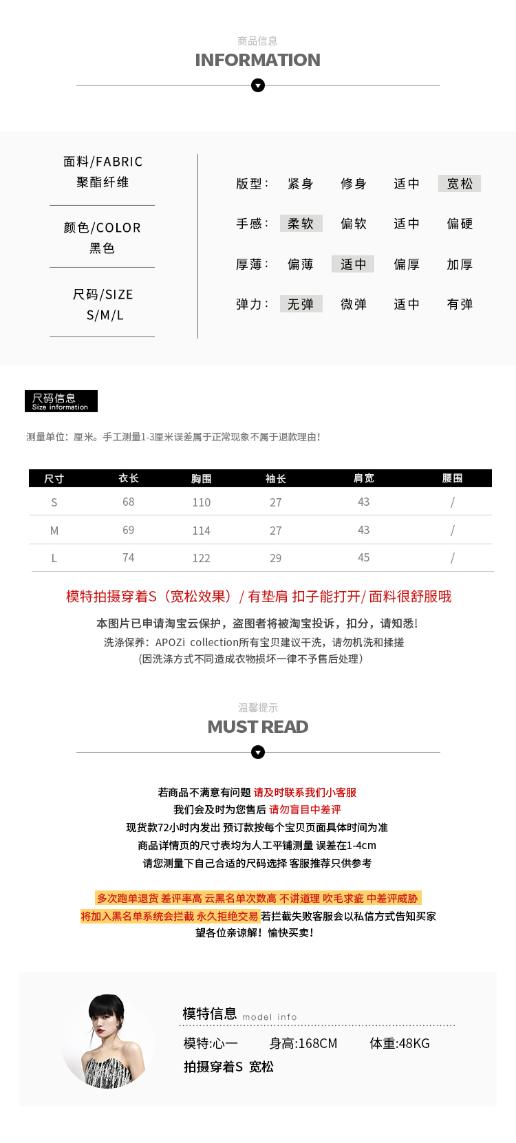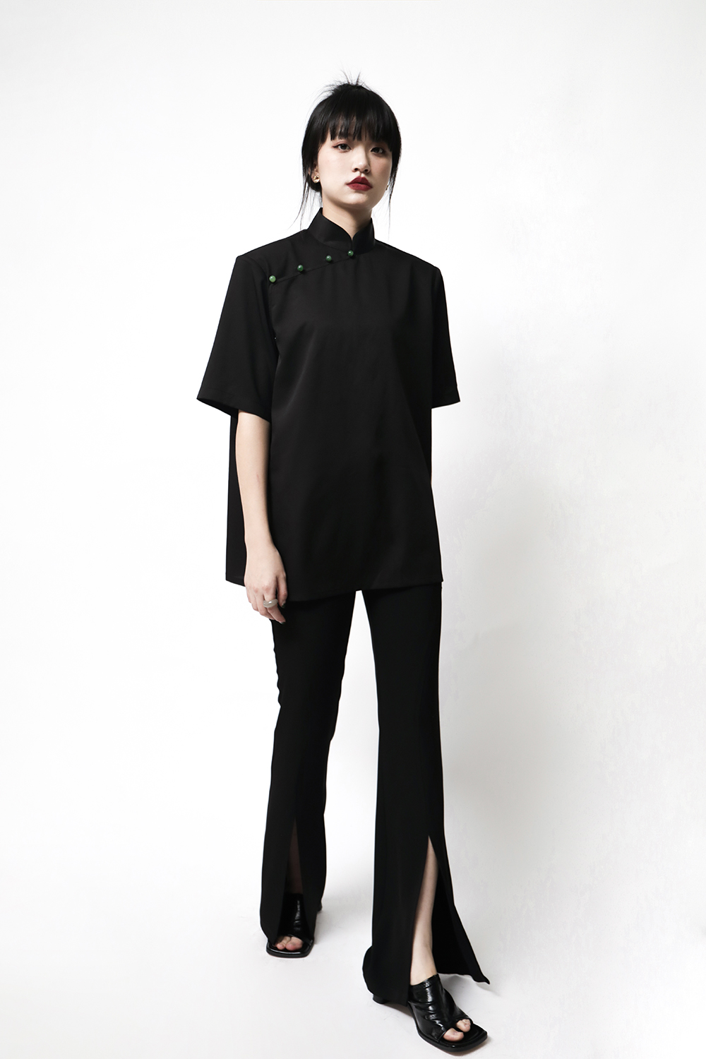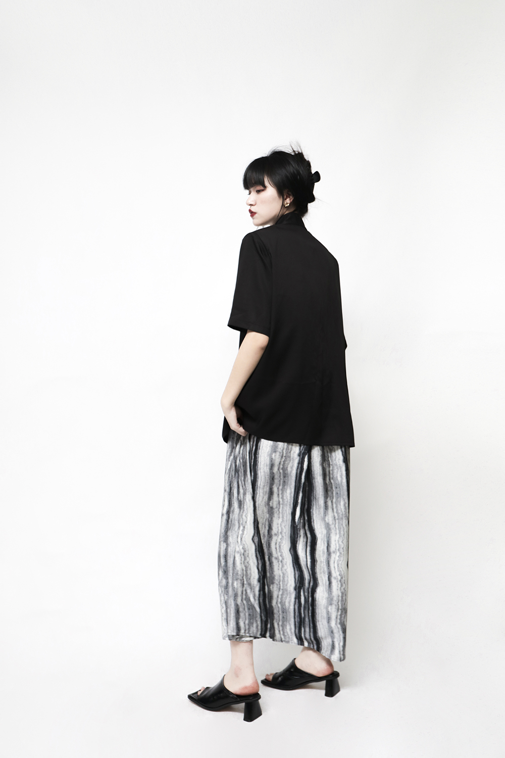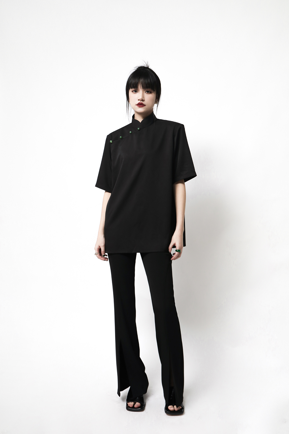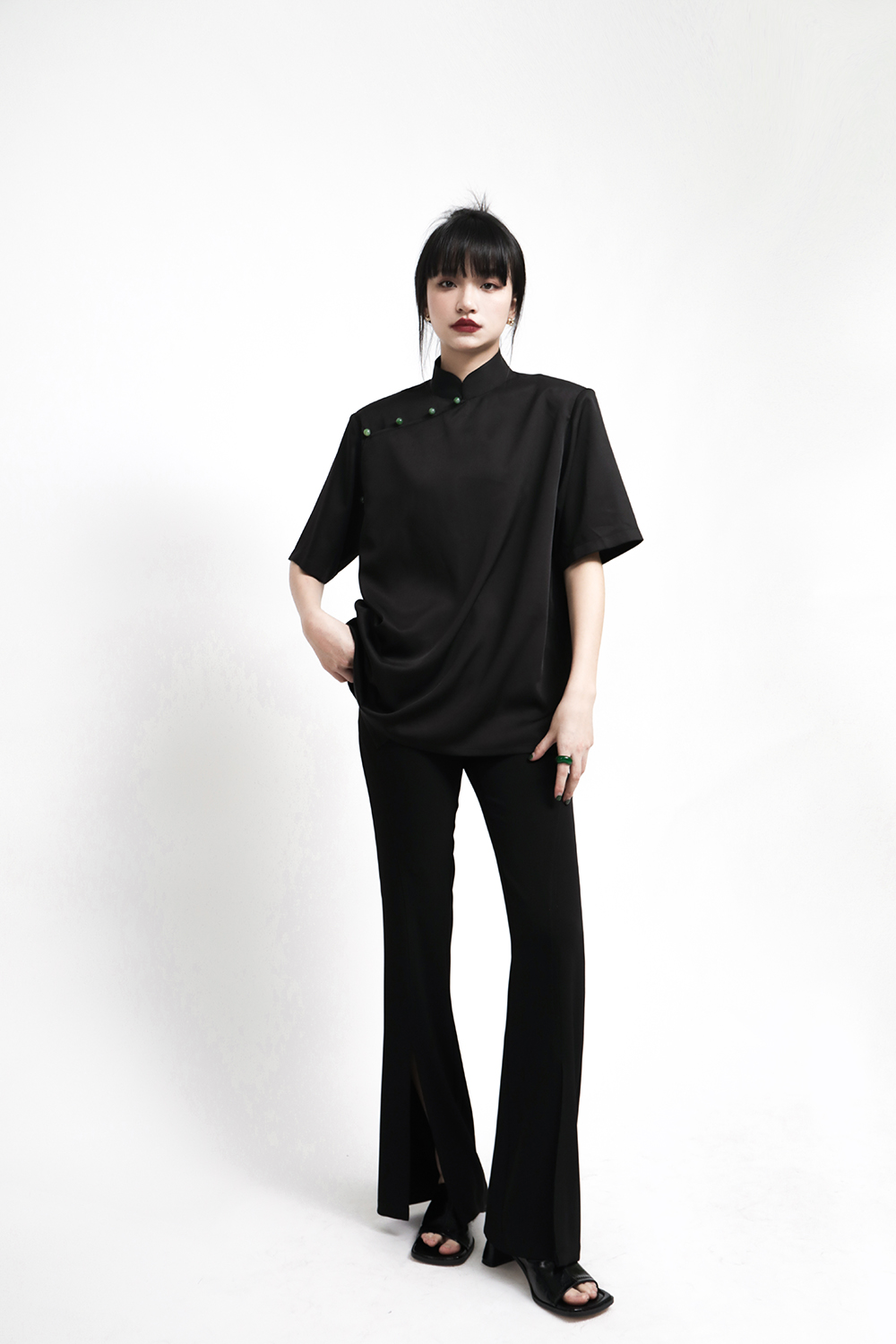 Asaya633 - APOZi Ink Stain Series Black New Chinese style Stand up Collar Shoulder Cushion Short Sleeve Shirt for Women with a Design Sense and a Small Interest Summer Top