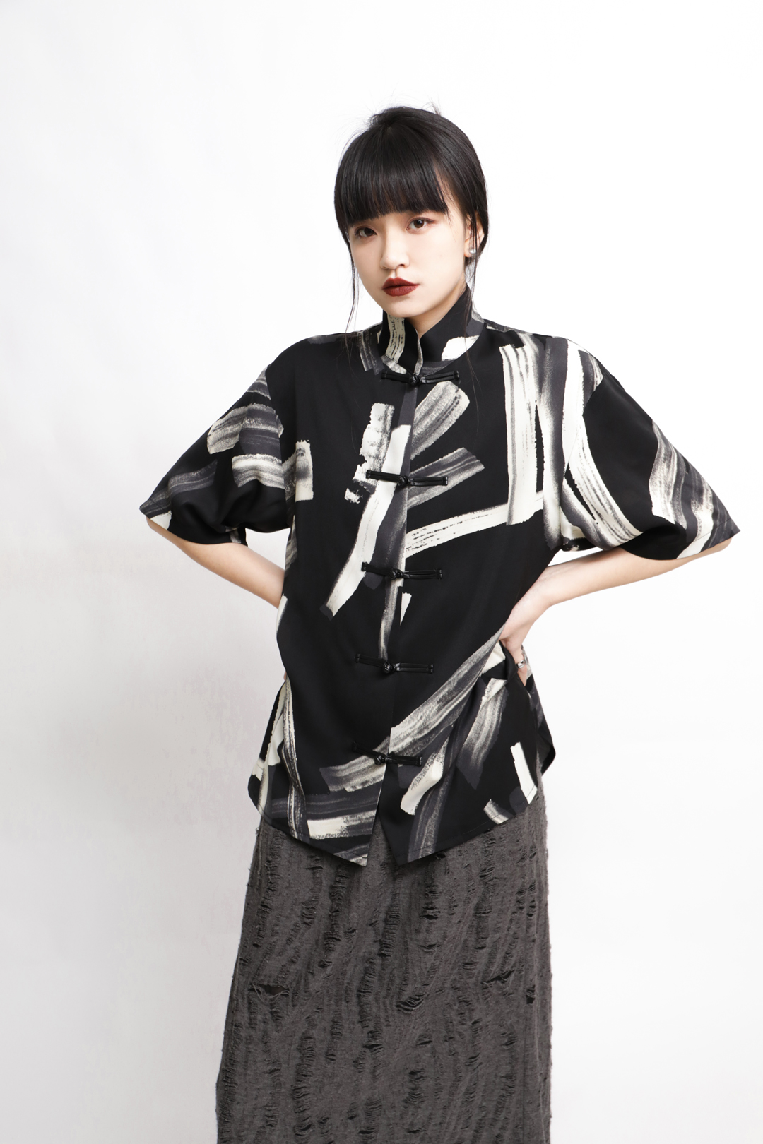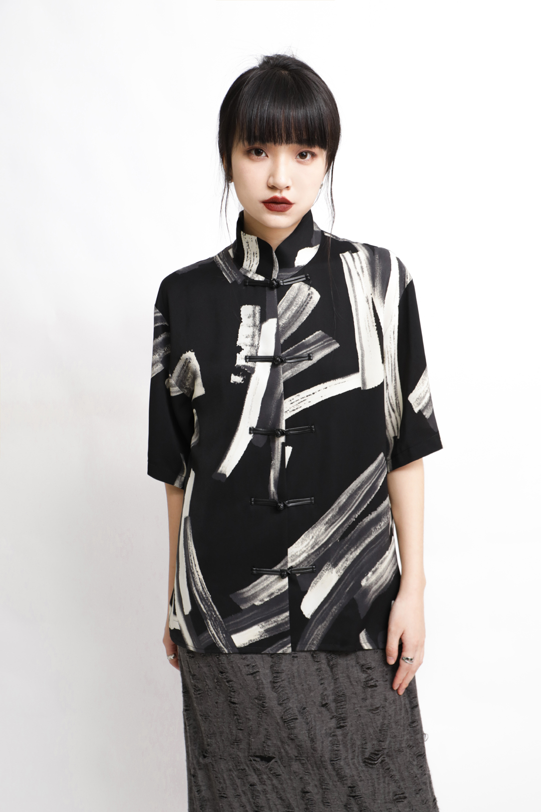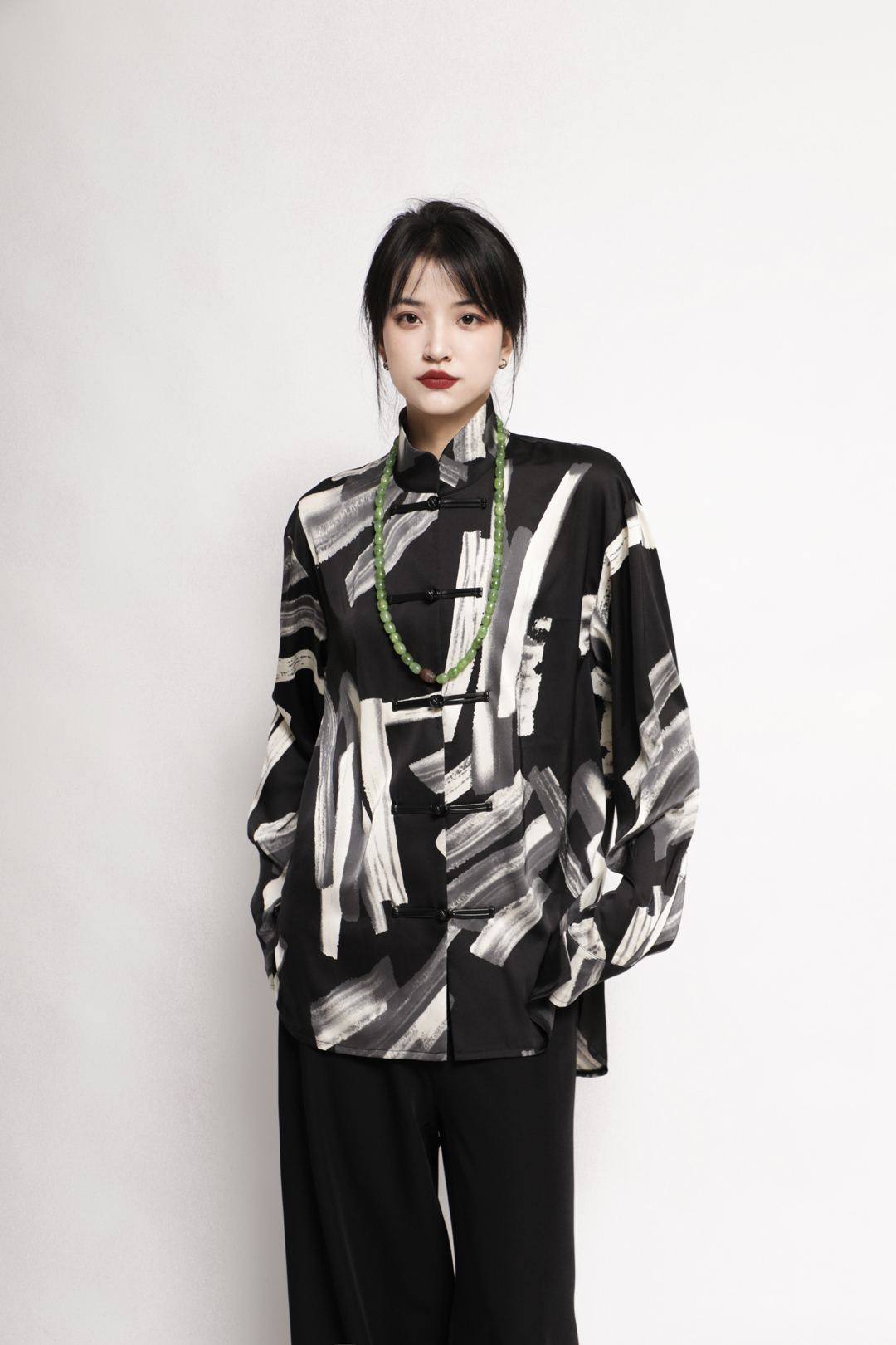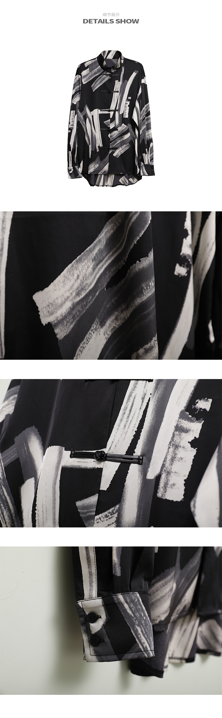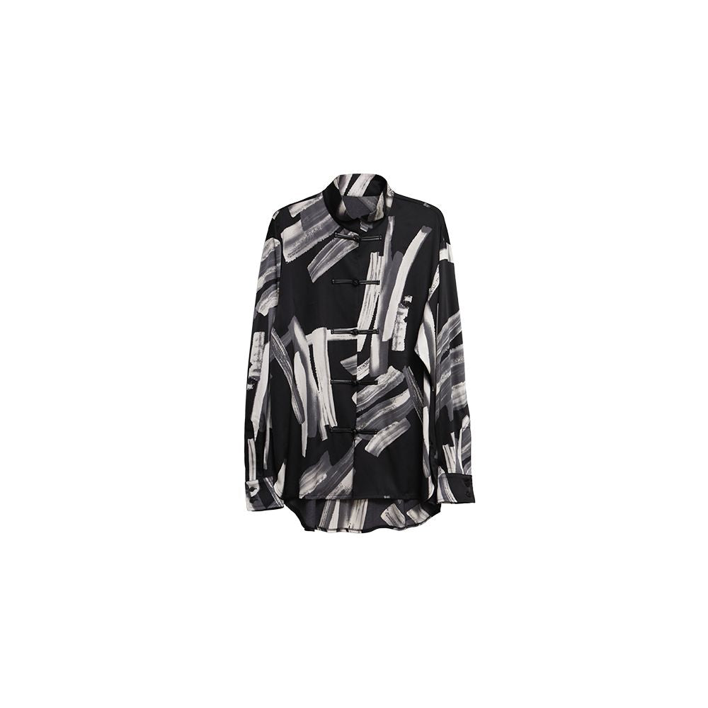 Asaya574 - APOZi textured series unisex new Chinese style printed stand up collar button up shirt for spring and autumn new vintage shirt