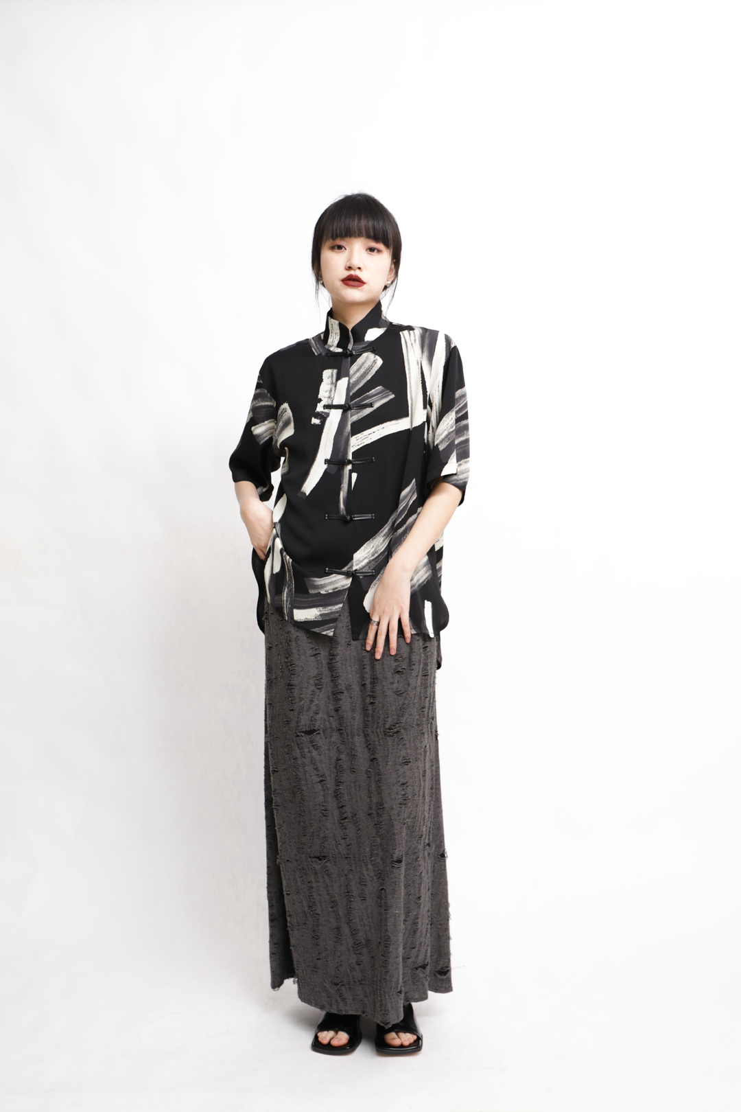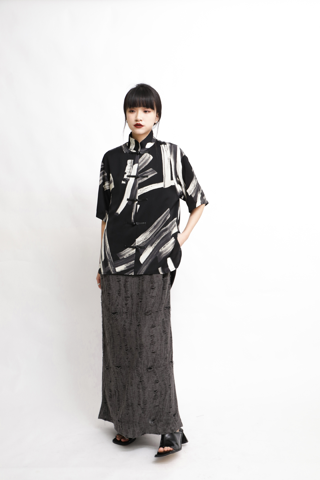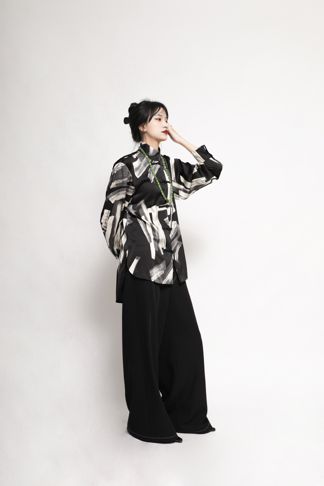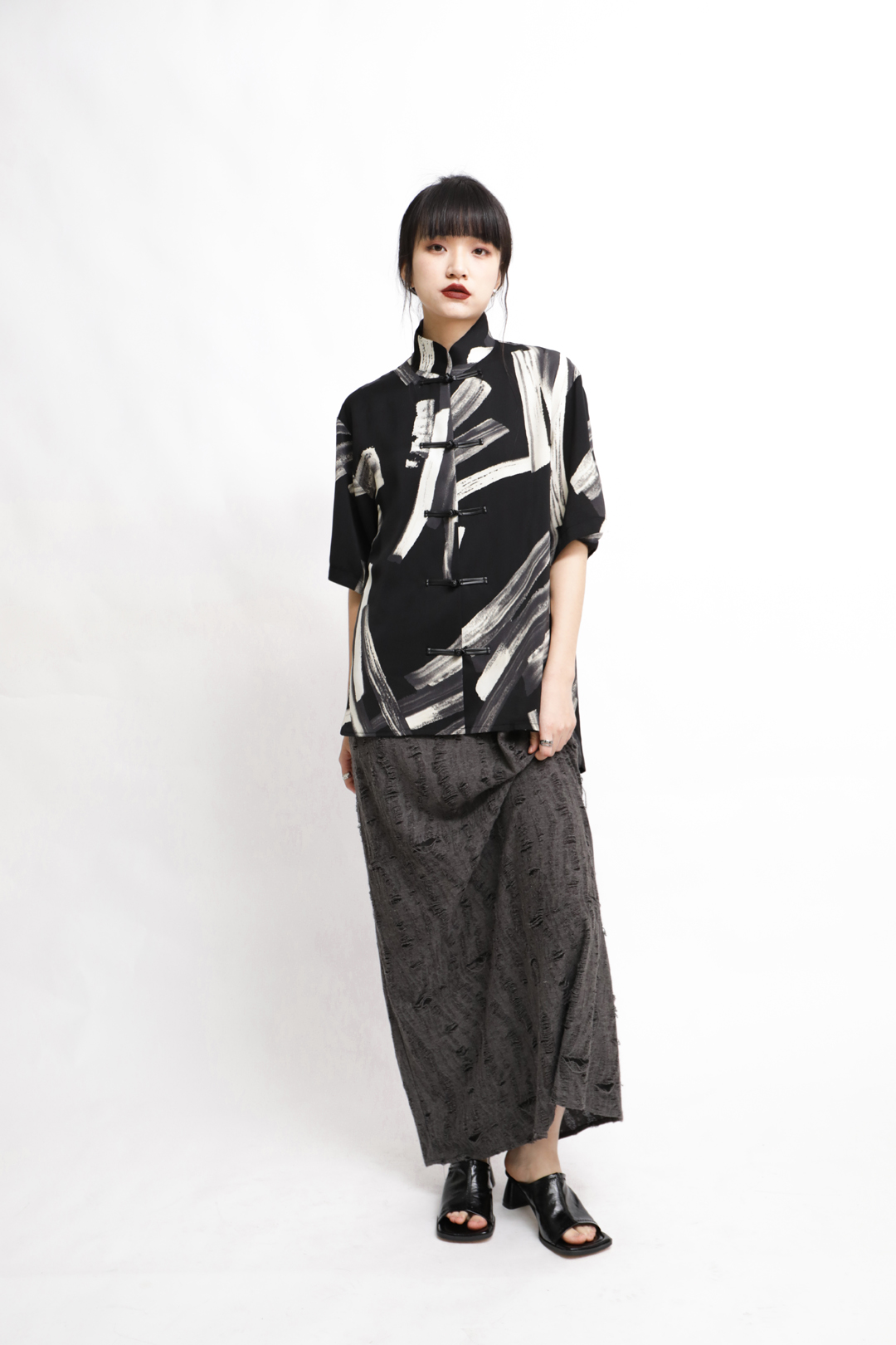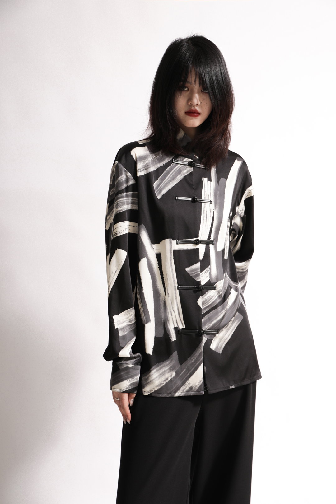 Asaya574 - APOZi textured series unisex new Chinese style printed stand up collar button up shirt for spring and autumn new vintage shirt