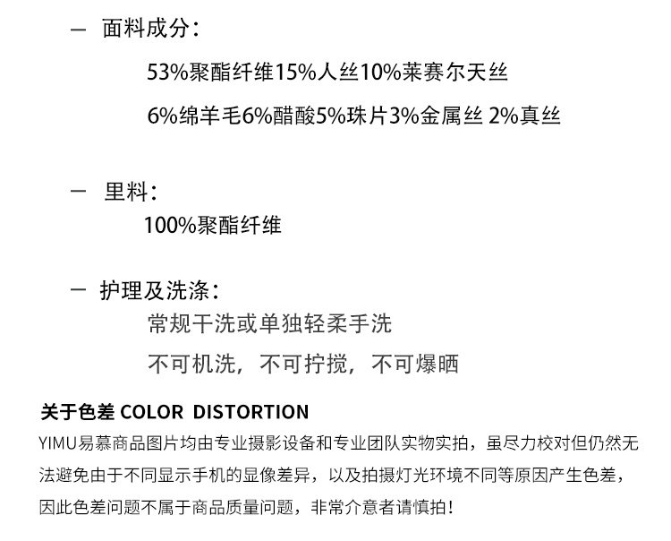 | Material composition | Polyester fiber 53% Other materials 30% Wool 6% Acetate fiber (acetate fiber) 6% Metal fiber 3% Mulberry silk 2% |