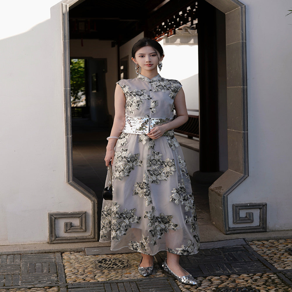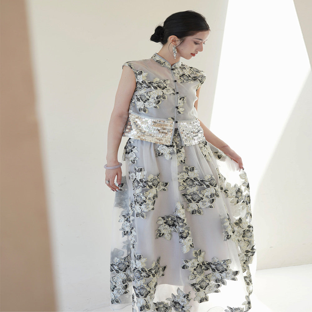 ASAYA3697 Moon and Stars Chinese Style Jacquard Beaded Embroidered Top Elastic Waist Skirt Set
