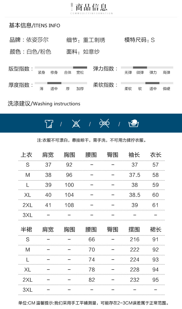 | color classification | Pink top, white top, pink half skirt, white half skirt, pink set, white set |