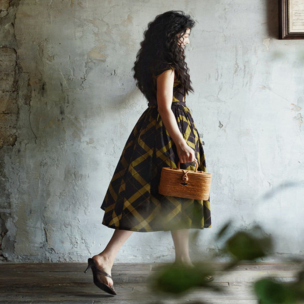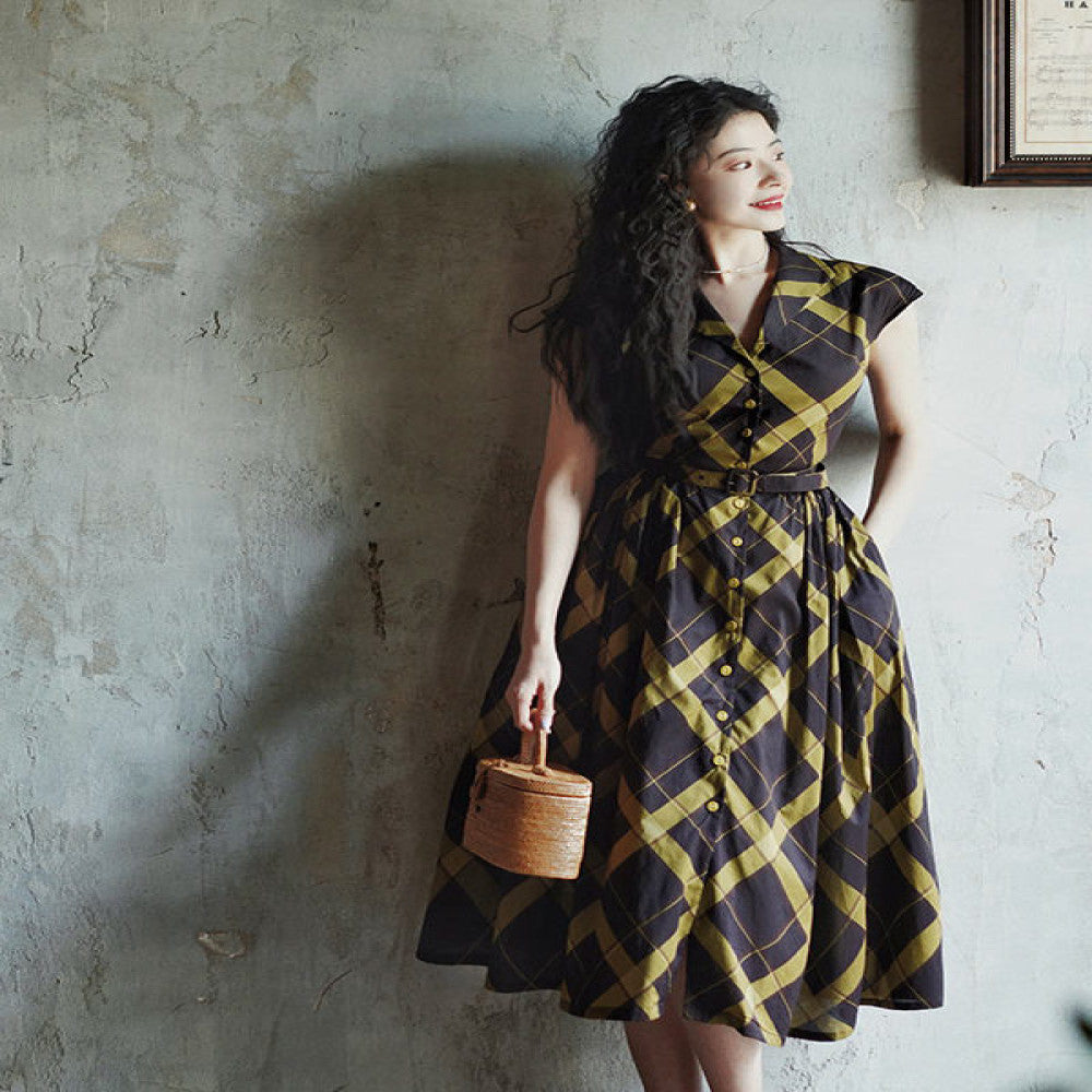 ASAYA4629 – Retro Elegance Plaid Dress 💛🖤