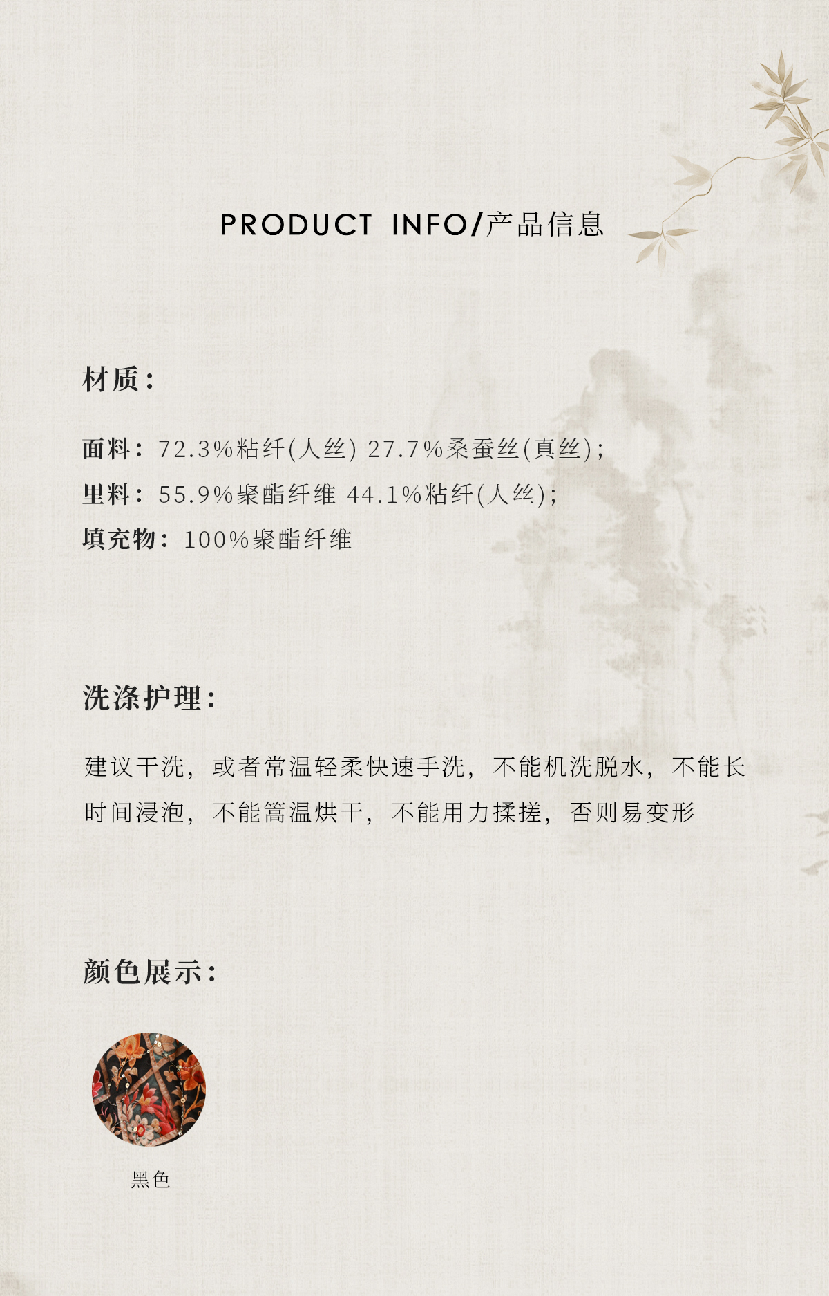 | Material composition | Viscose fiber (72.3%), silk 27.7% |