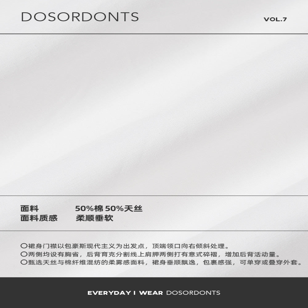 裙身门襟以包豪斯现代主义为出发点,顶端领口向右倾斜处理。两侧均设有胸省,后背育克分割线上肩胛两侧打有意式碎褶,增加后背活动量。甄选天丝与棉纤维混纺的柔雾感面料,裙身垂顺飘逸,包裹感强,可单穿或叠穿外套。