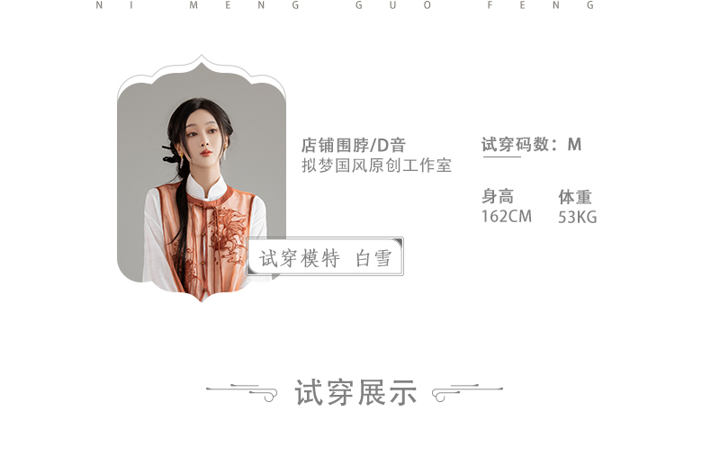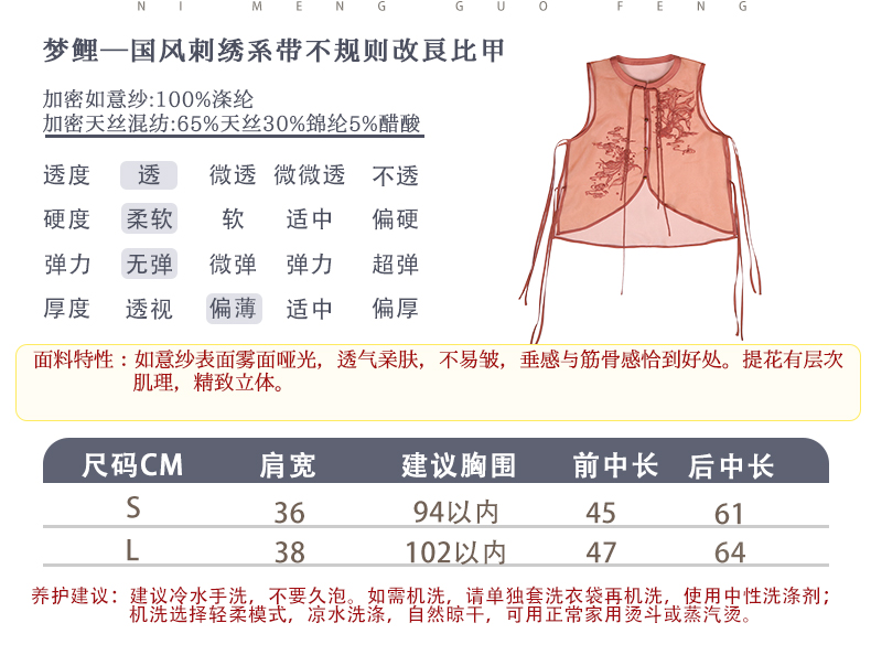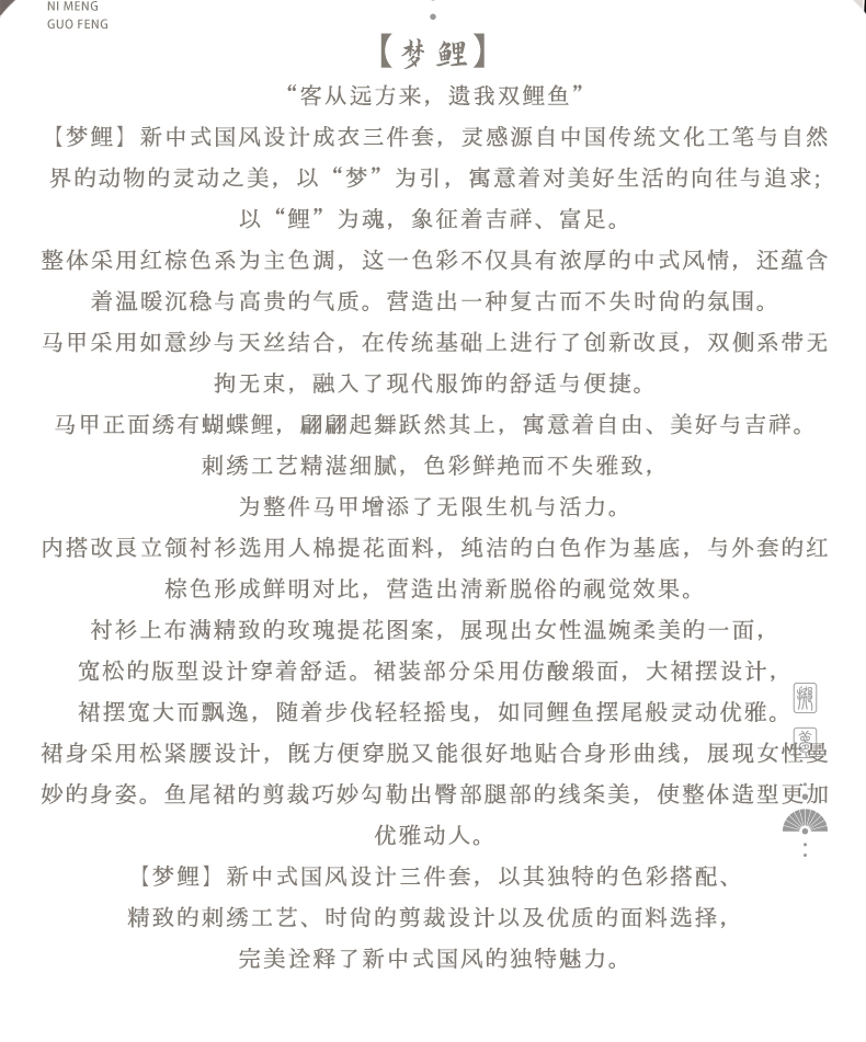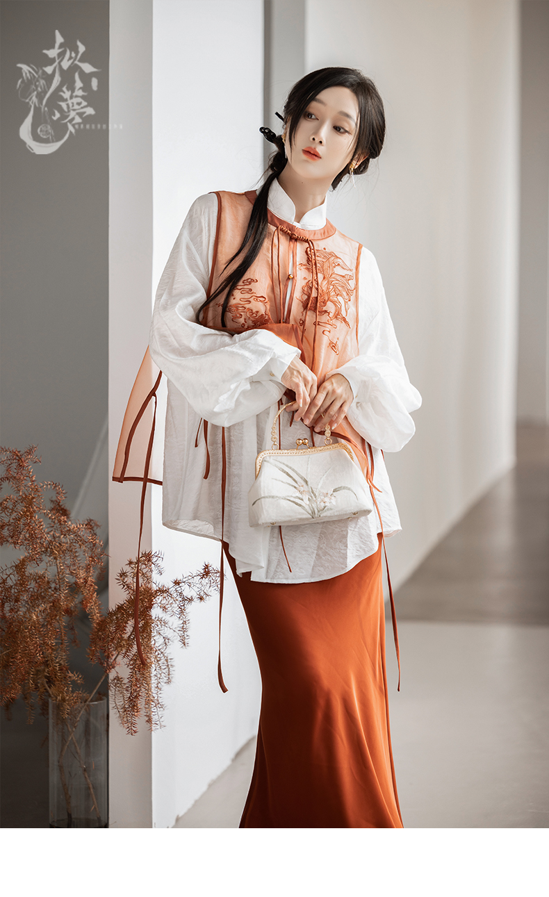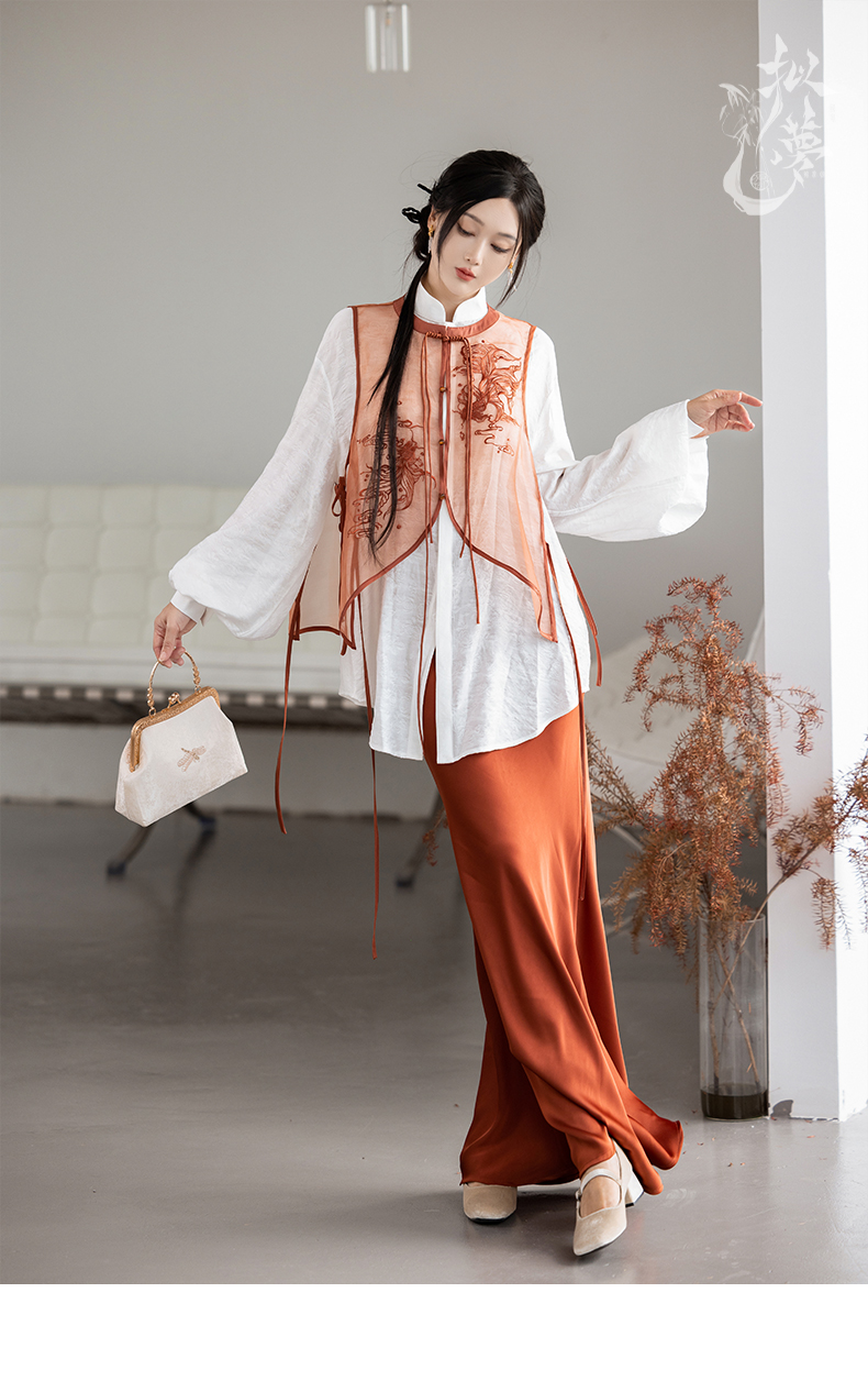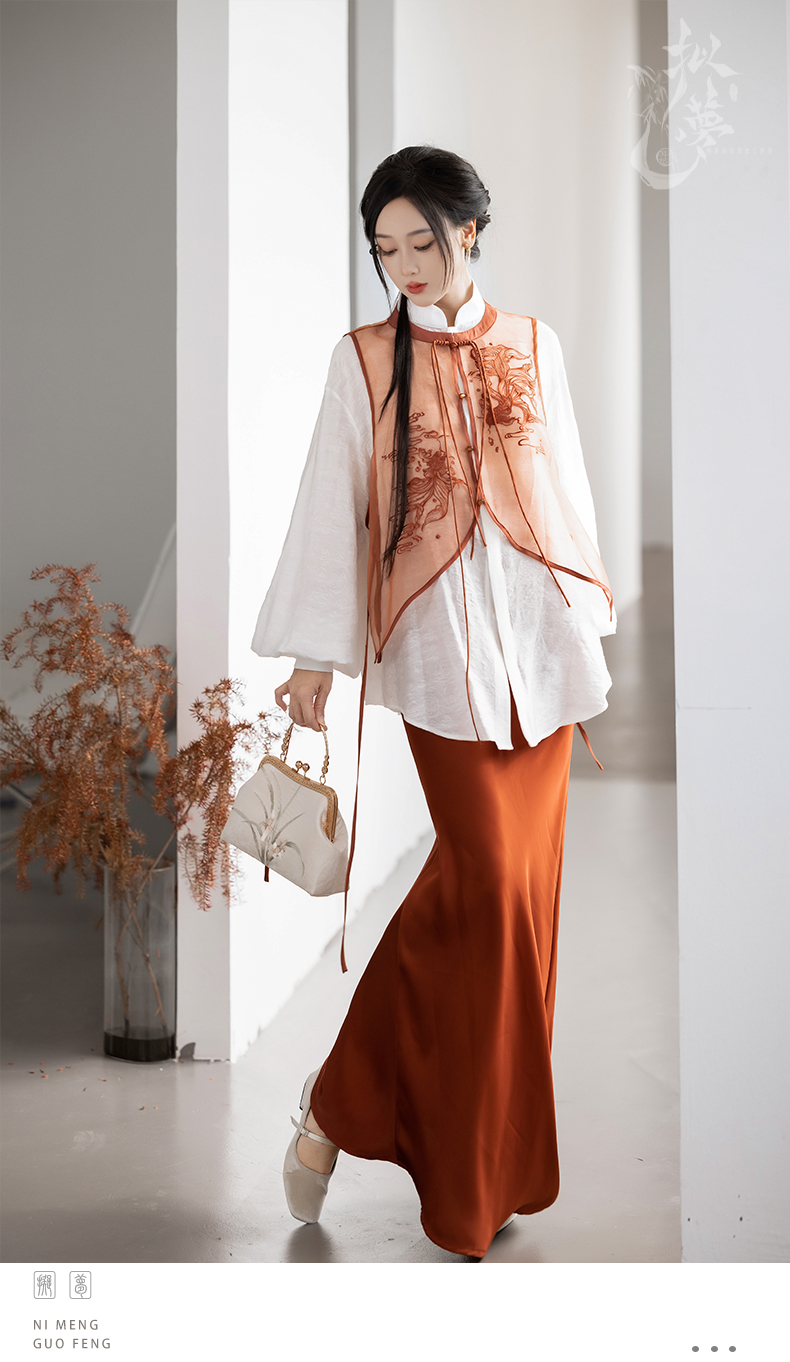 | Color classification | New Chinese style loose and breathable jacquard Tencel stand up collar shirt, Chinese style embroidered lace up irregular improved vest, orange red new Chinese style oblique cut fish tail skirt, Dream Carp three piece set |