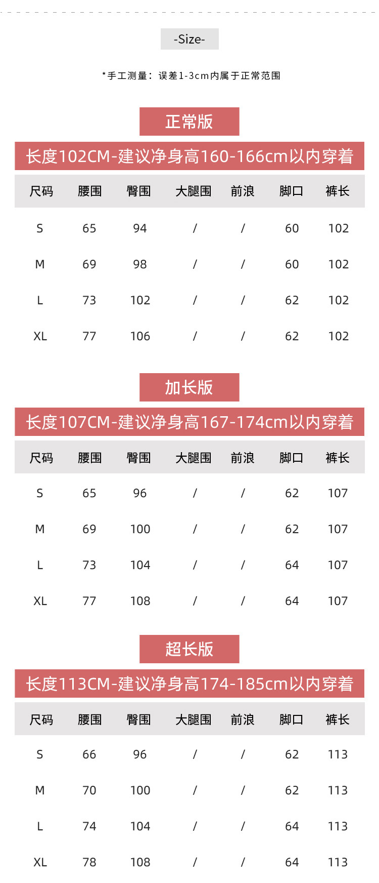| Color classification | Beige regular version pants length 102cm, beige extra-long version pants length 107cm, beige super long version pants length 113cm |
