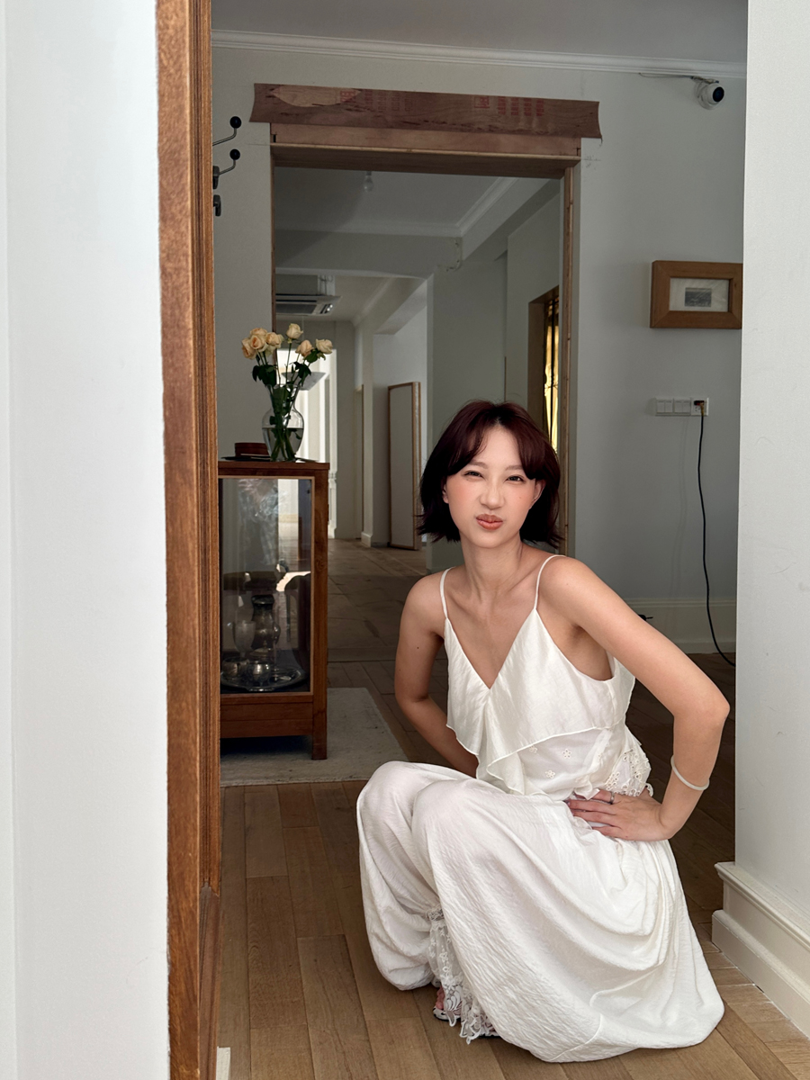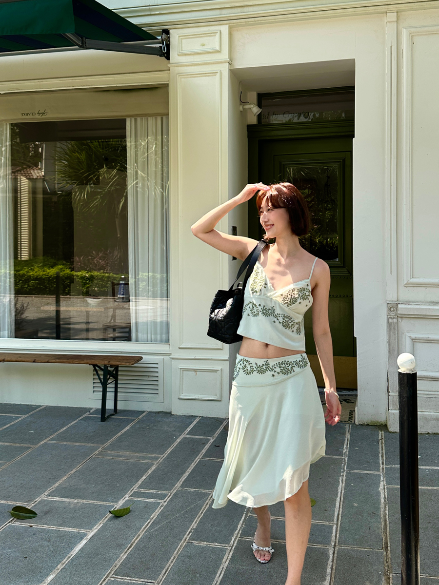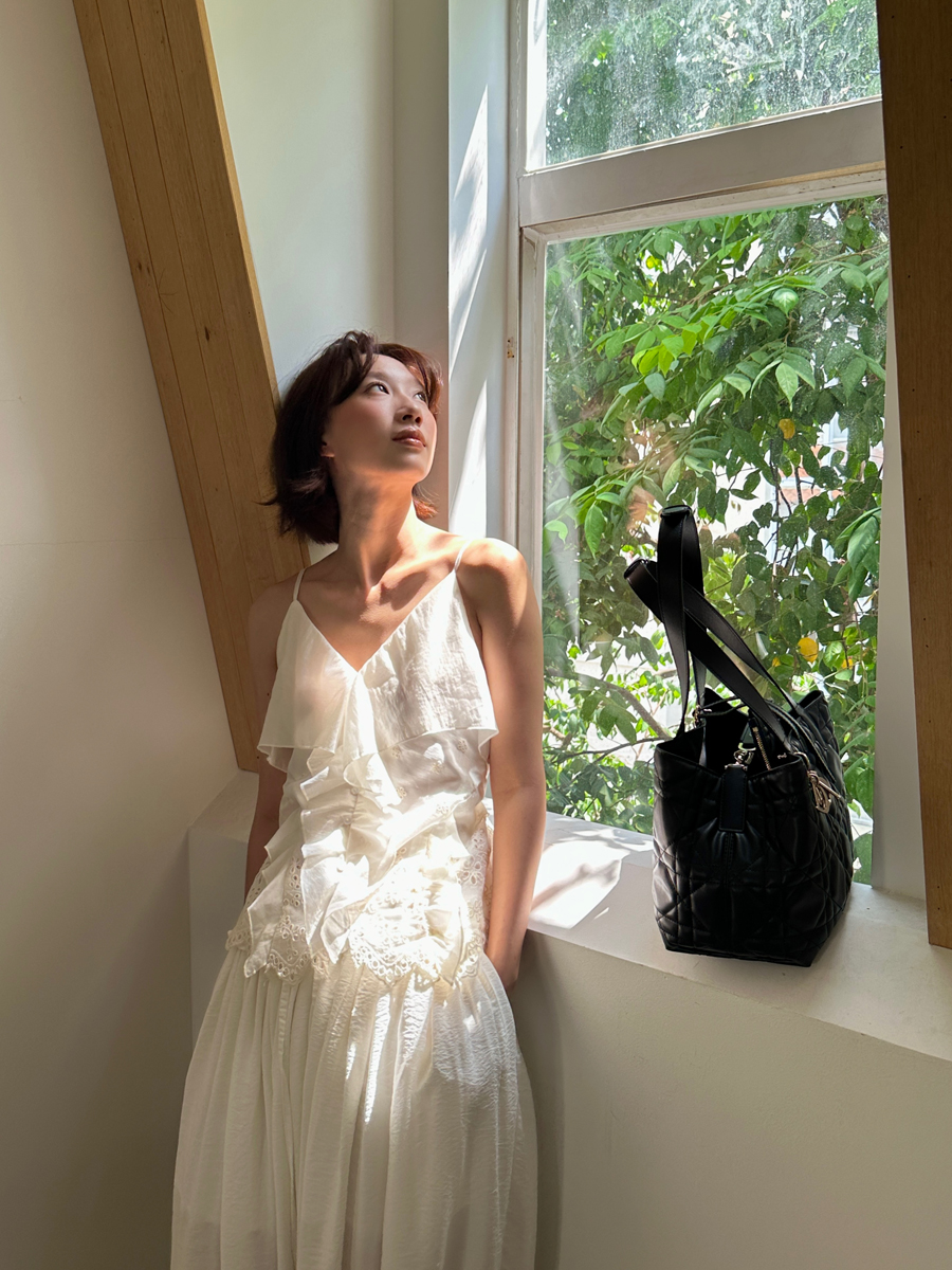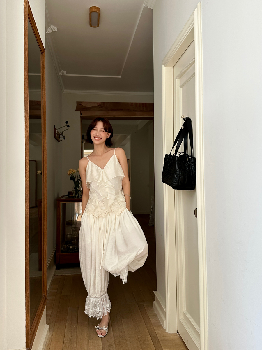 产品概述:以个人主观的角度描述商品(有点宽松的小吊带,V领搭配立体荷叶边,法式设计感,面料定制立体镂空刺绣面料,面料精致感满满,侧腰做了绑带可以绑带收腰,里层有内衬,贴身穿舒适透气)