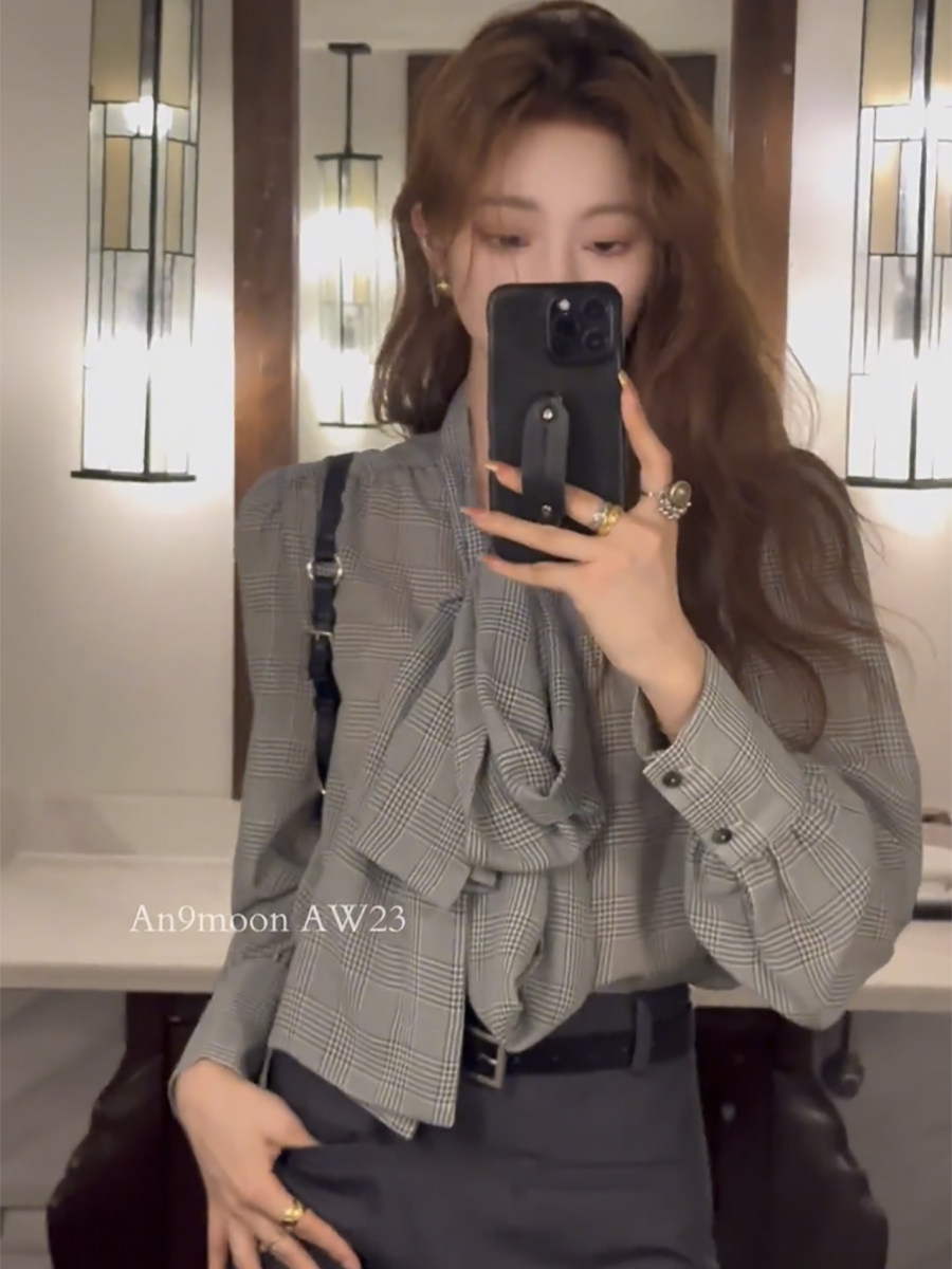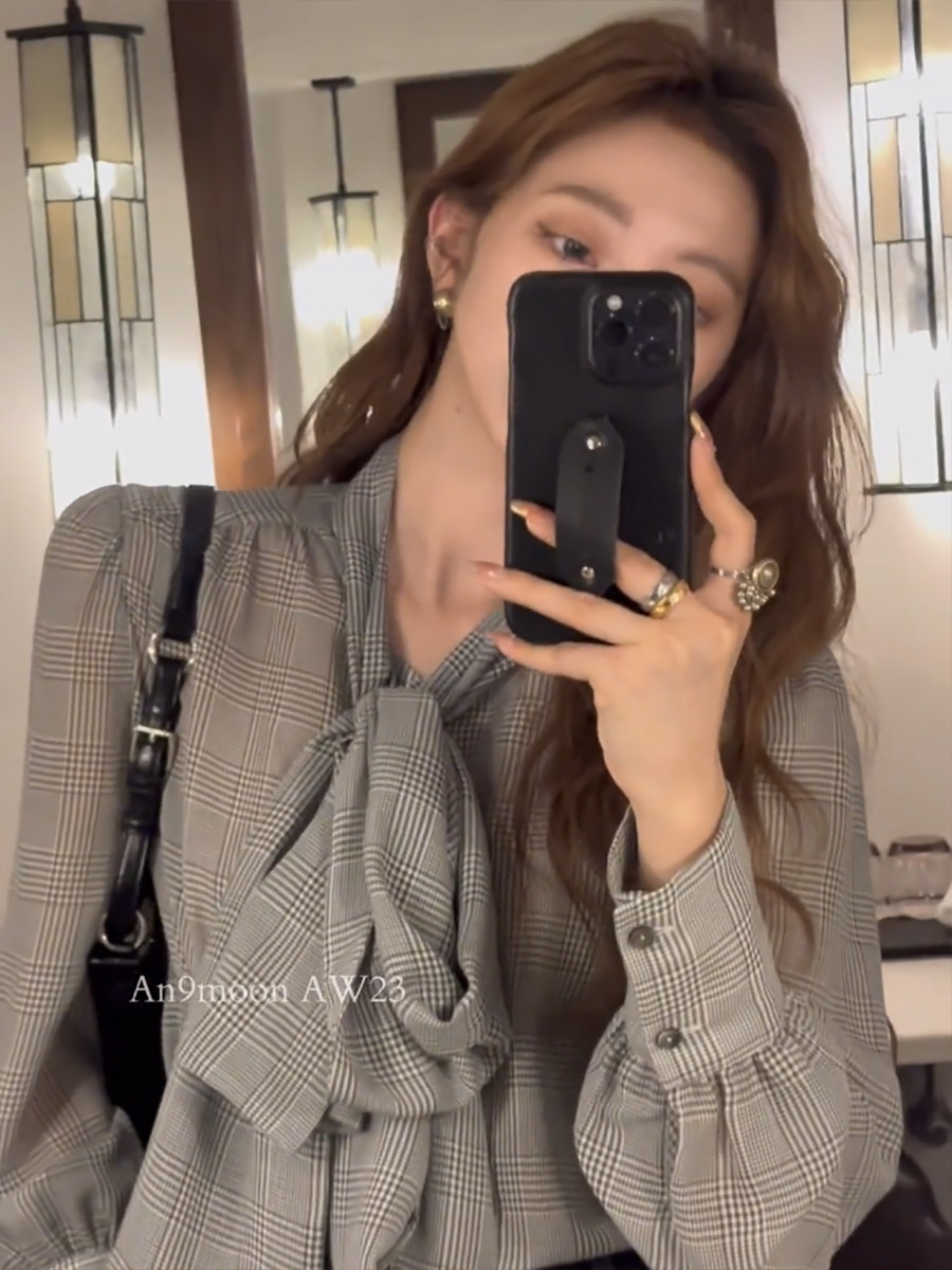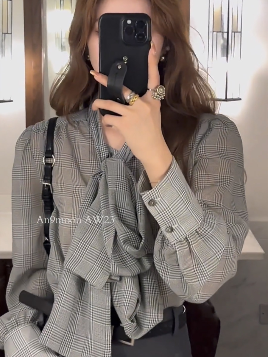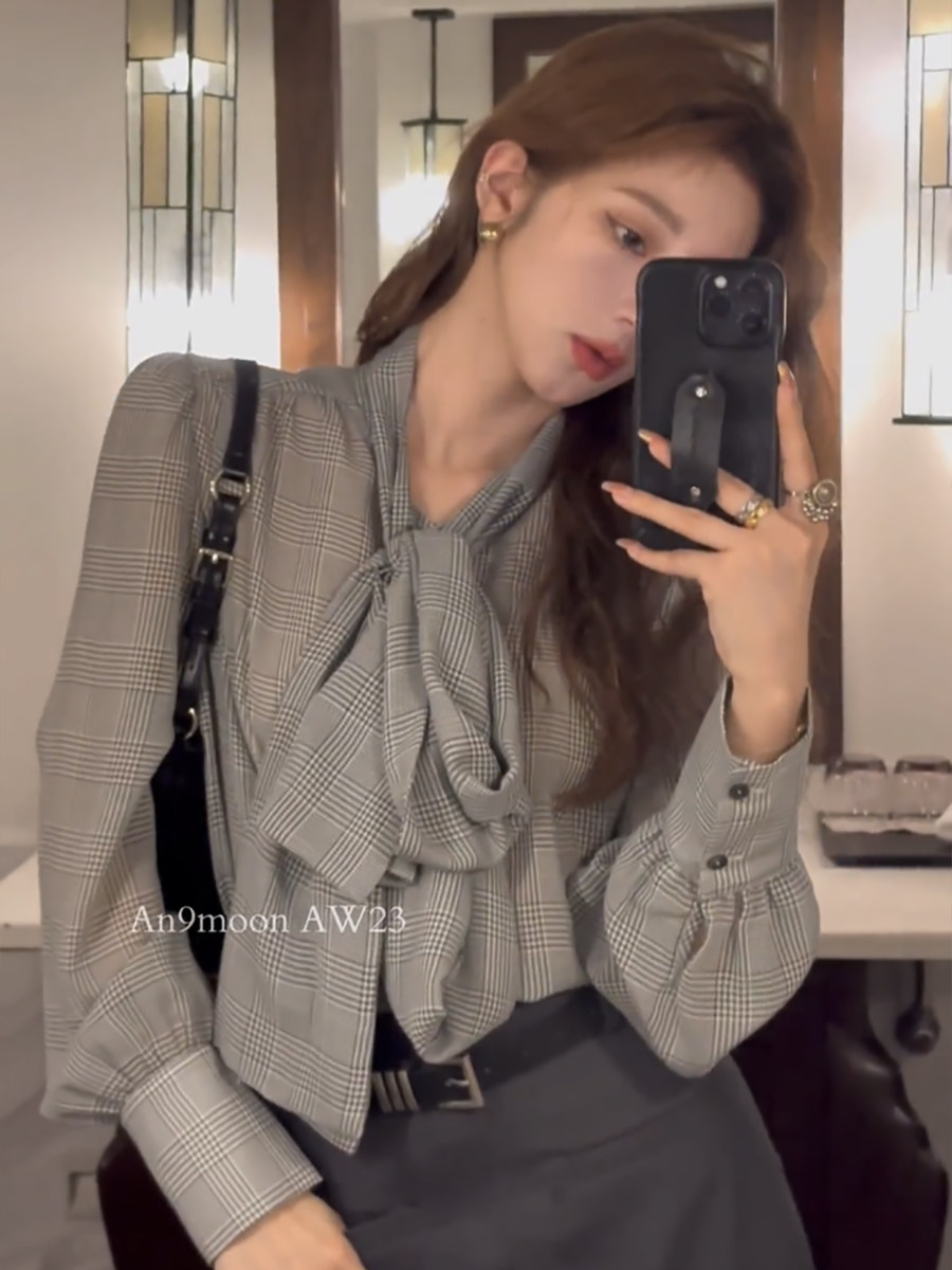 ASAYA5130 – Glen Check Bow Blouse 🩶✨