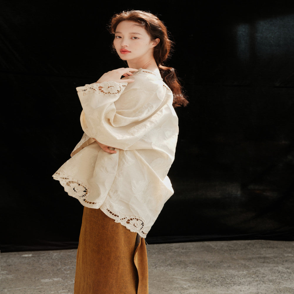ASAYA3723 Gold Tulip Jacquard Jacket with Hollow Laser Embroidery | Retro Palace-Inspired Long Sleeve
