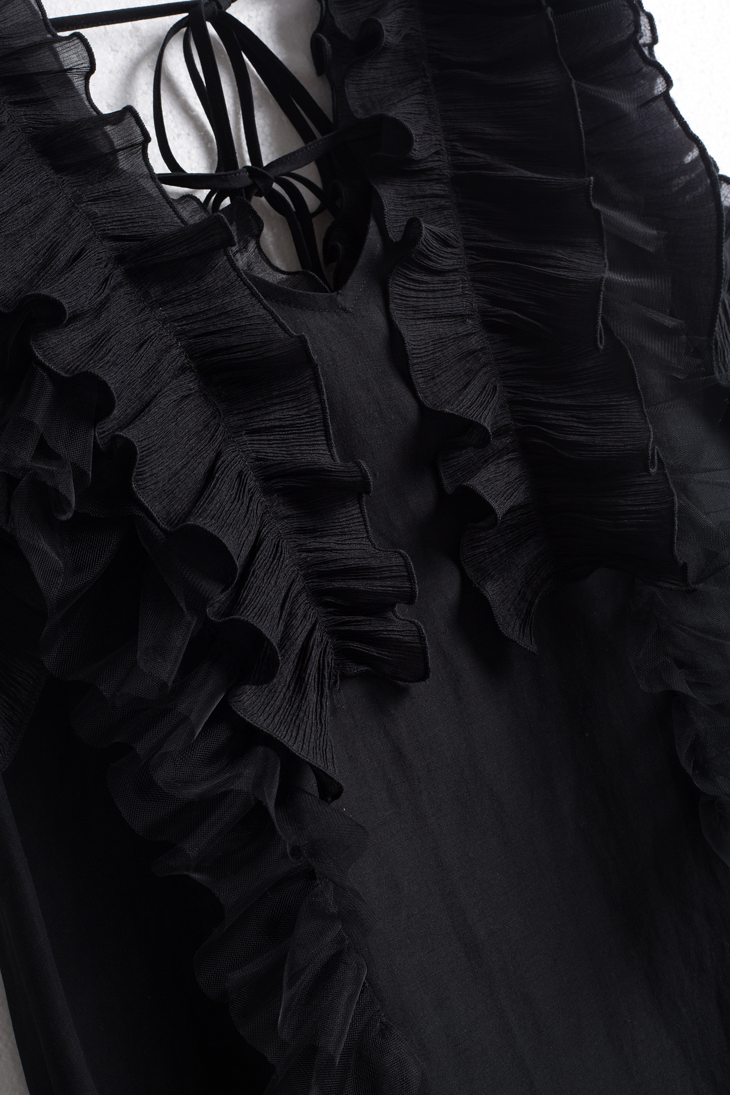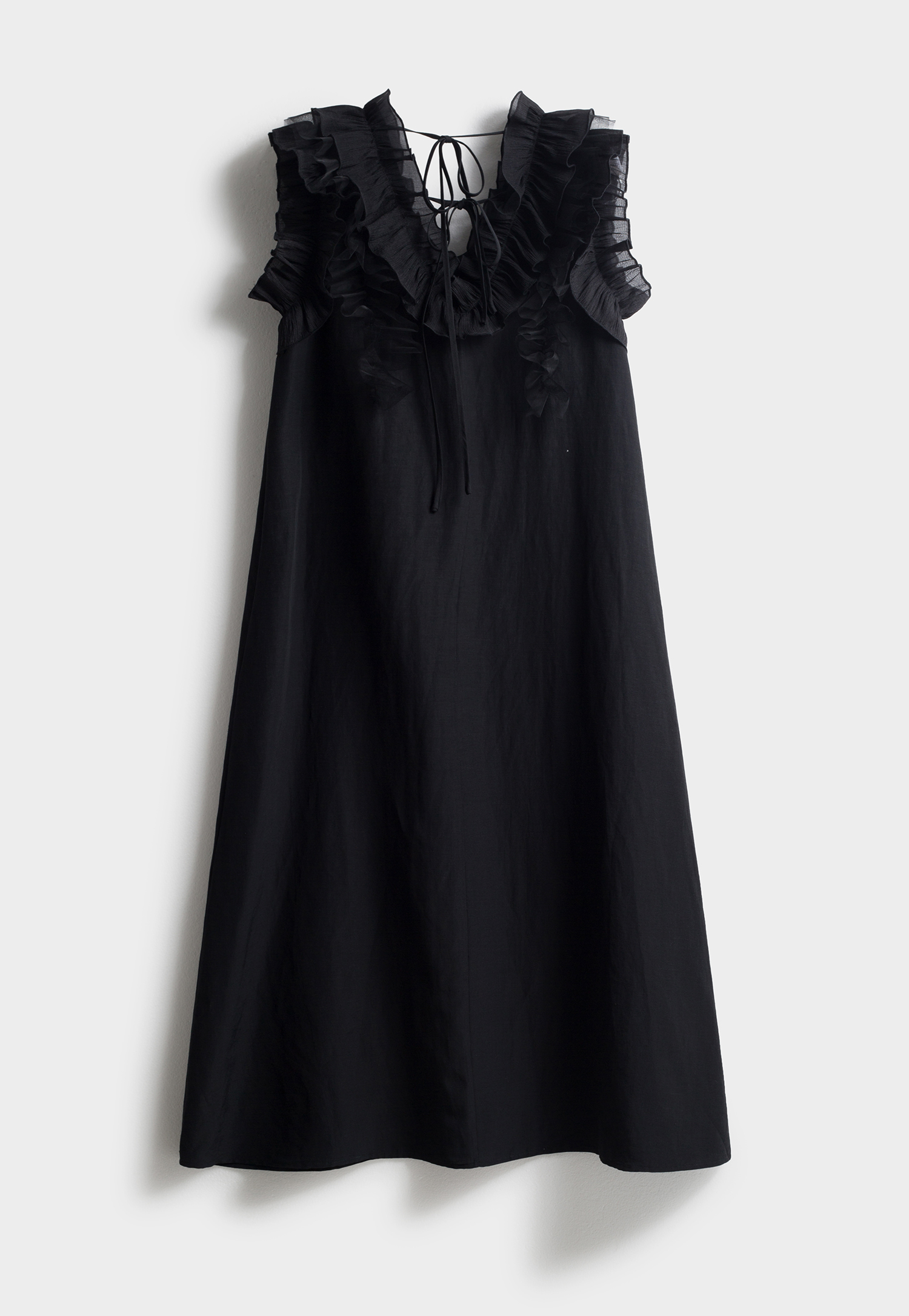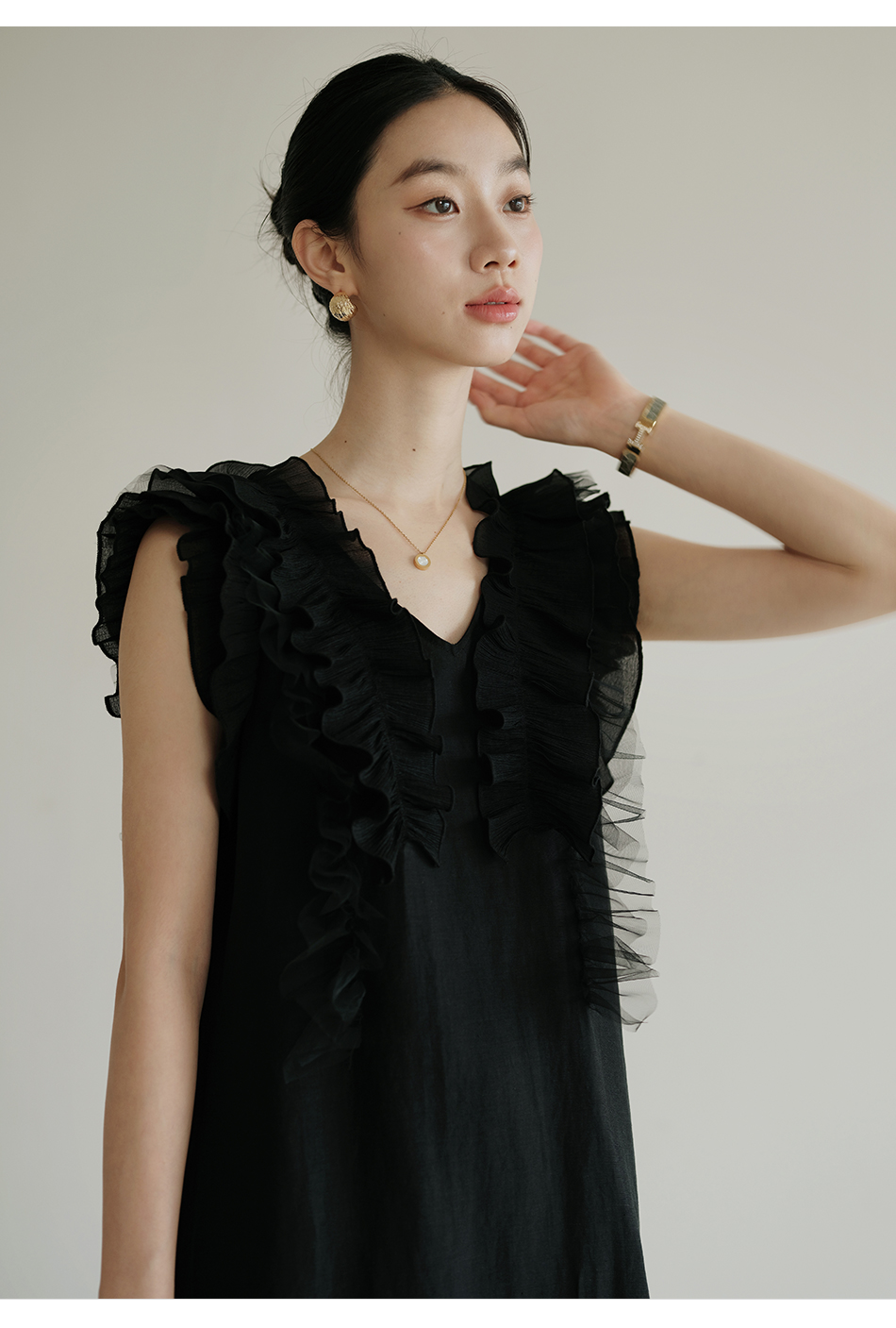 无袖设计,肩部运用压褶荷叶大花边设计,真的很有层次美感,又有点小慵懒