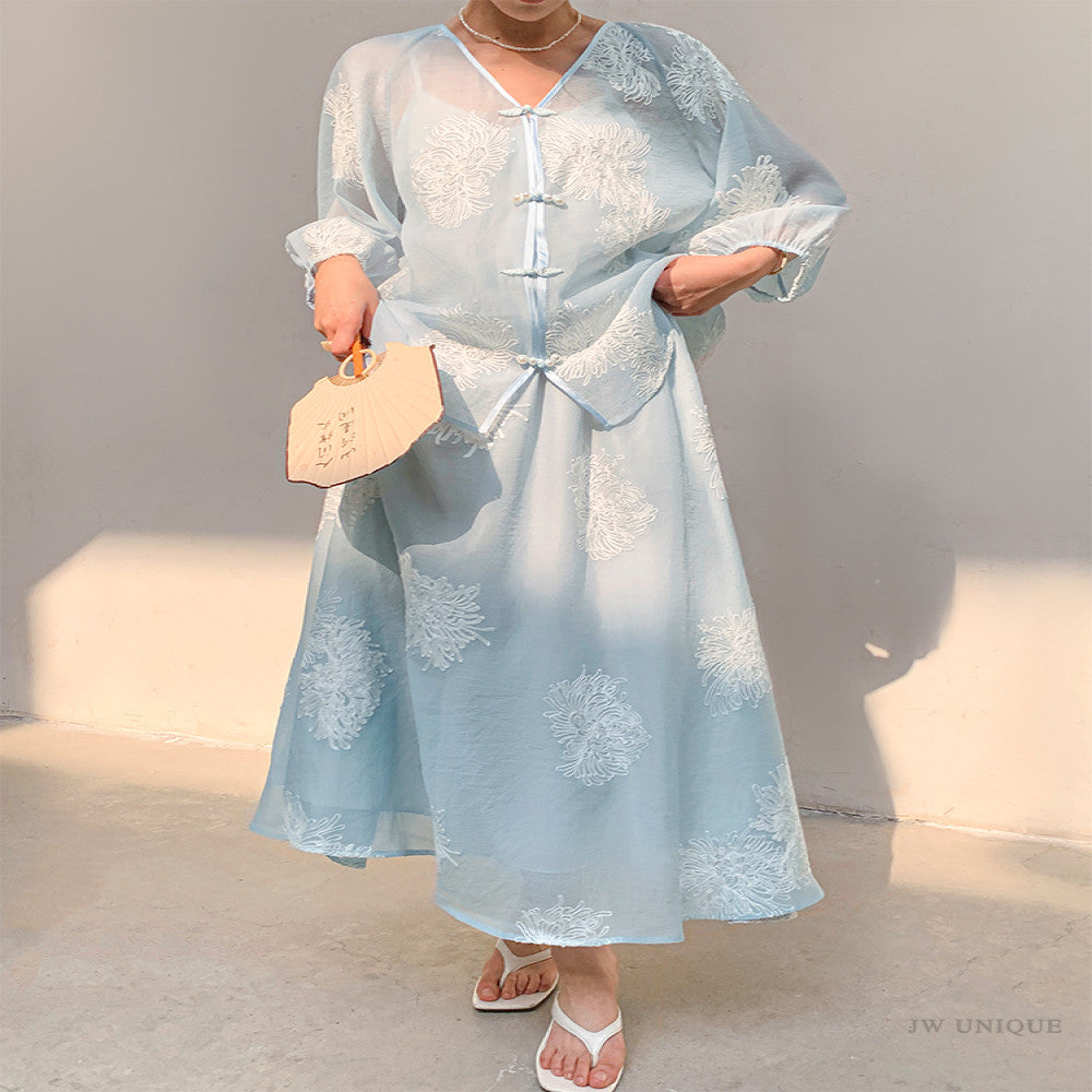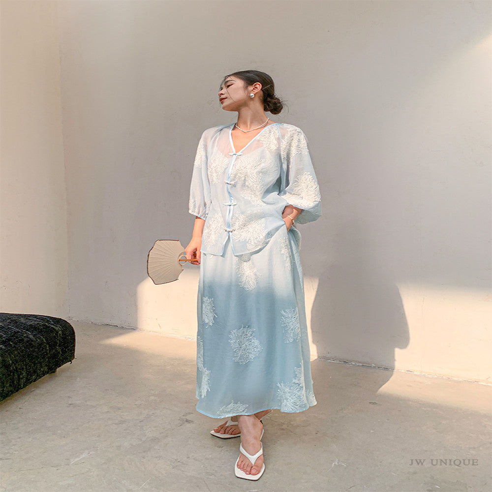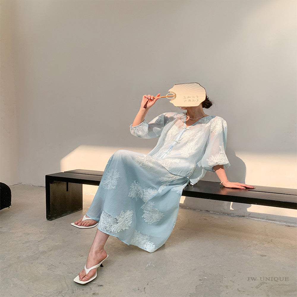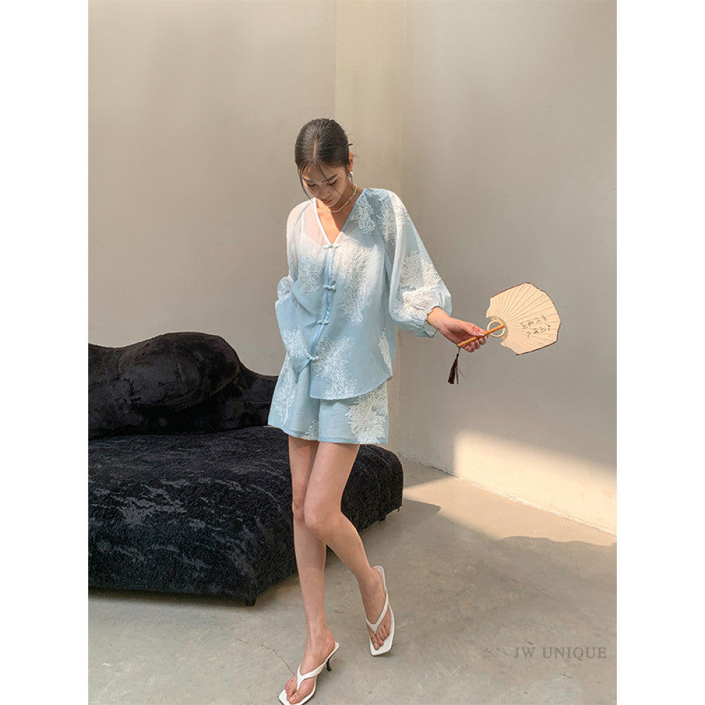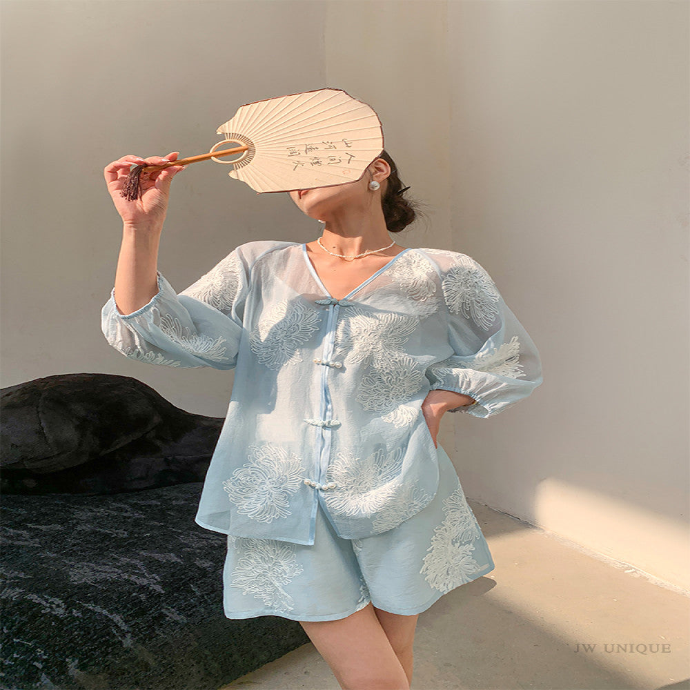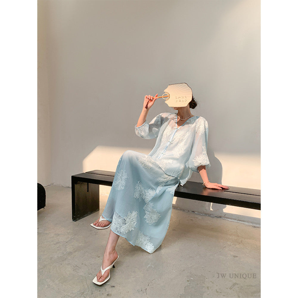 ASAYA3493 BLUE NEW CHINESE STYLE TWO-PIECE SUIT WOMEN'S SUMMER 2024 SHIRT, TOP, SKIRT, SHORTS