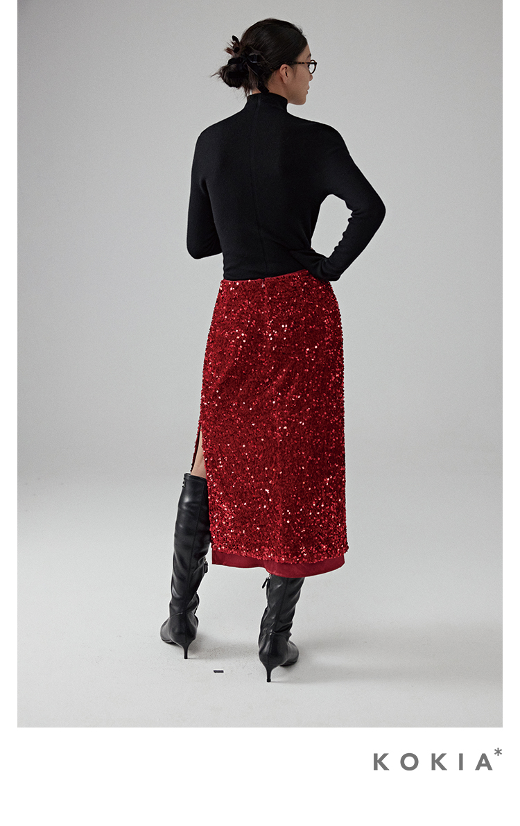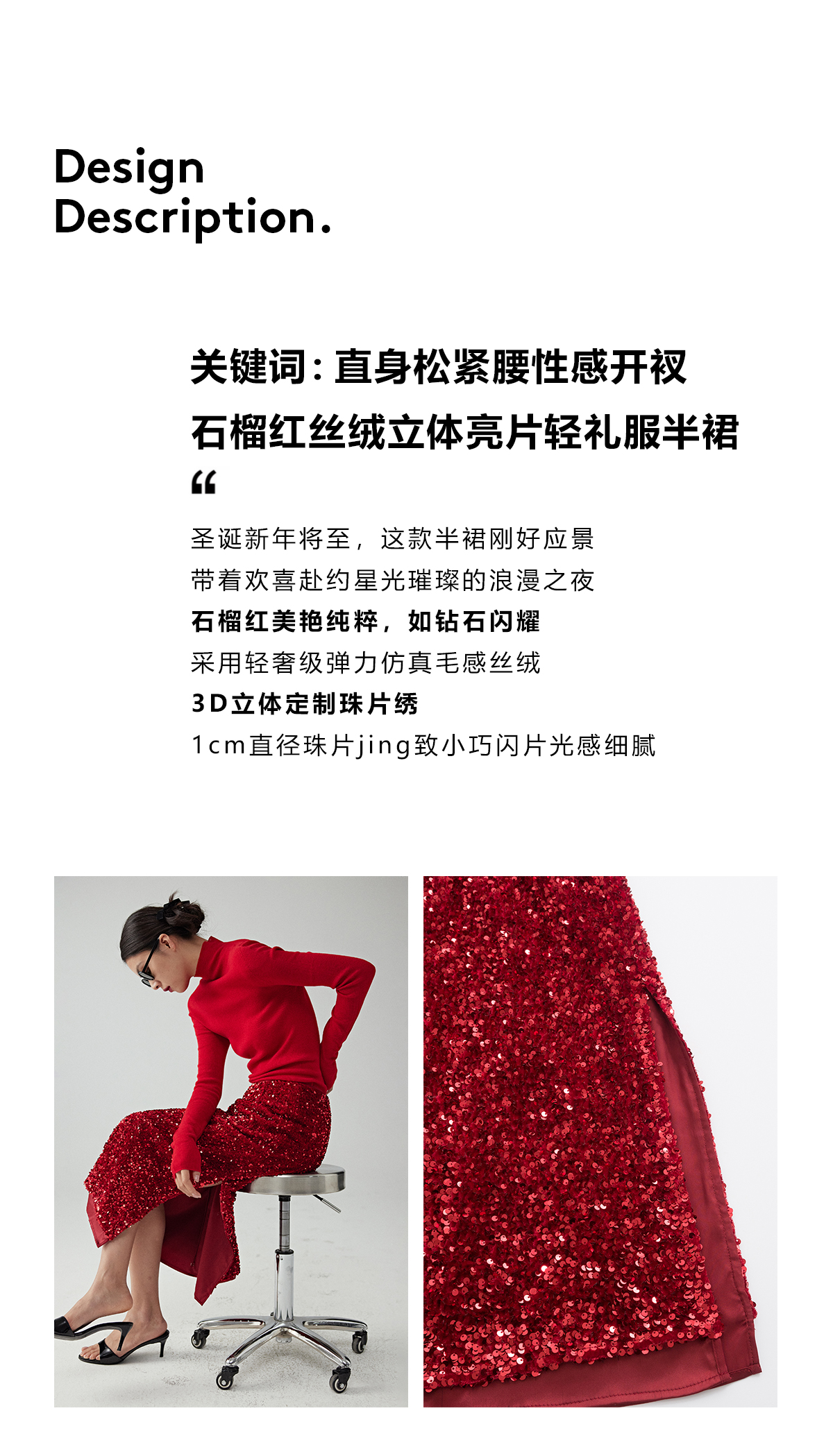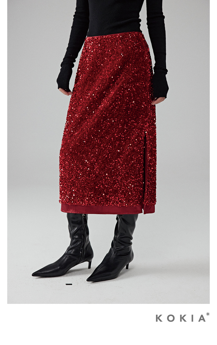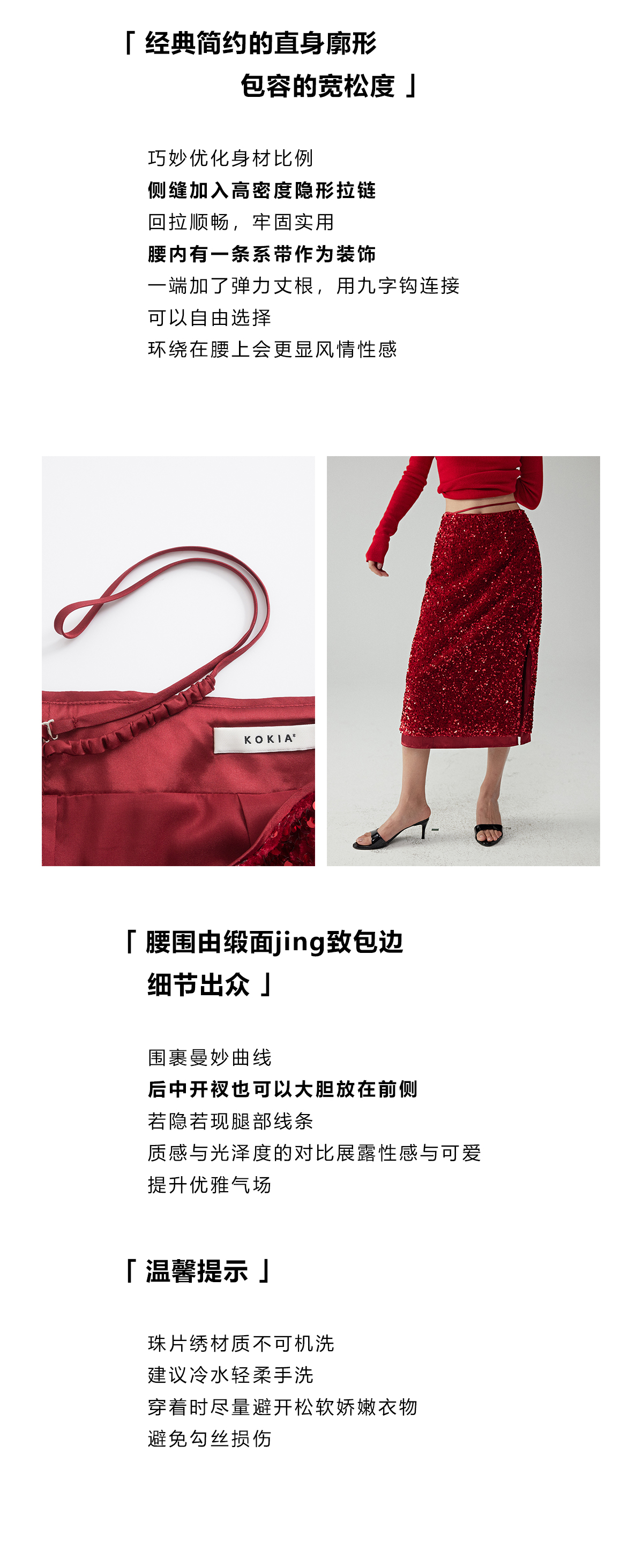 ASAYA2787 Pomegranate red velvet three-dimensional sequin light dress straight slit double layer skirt