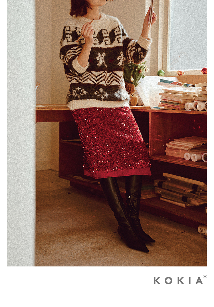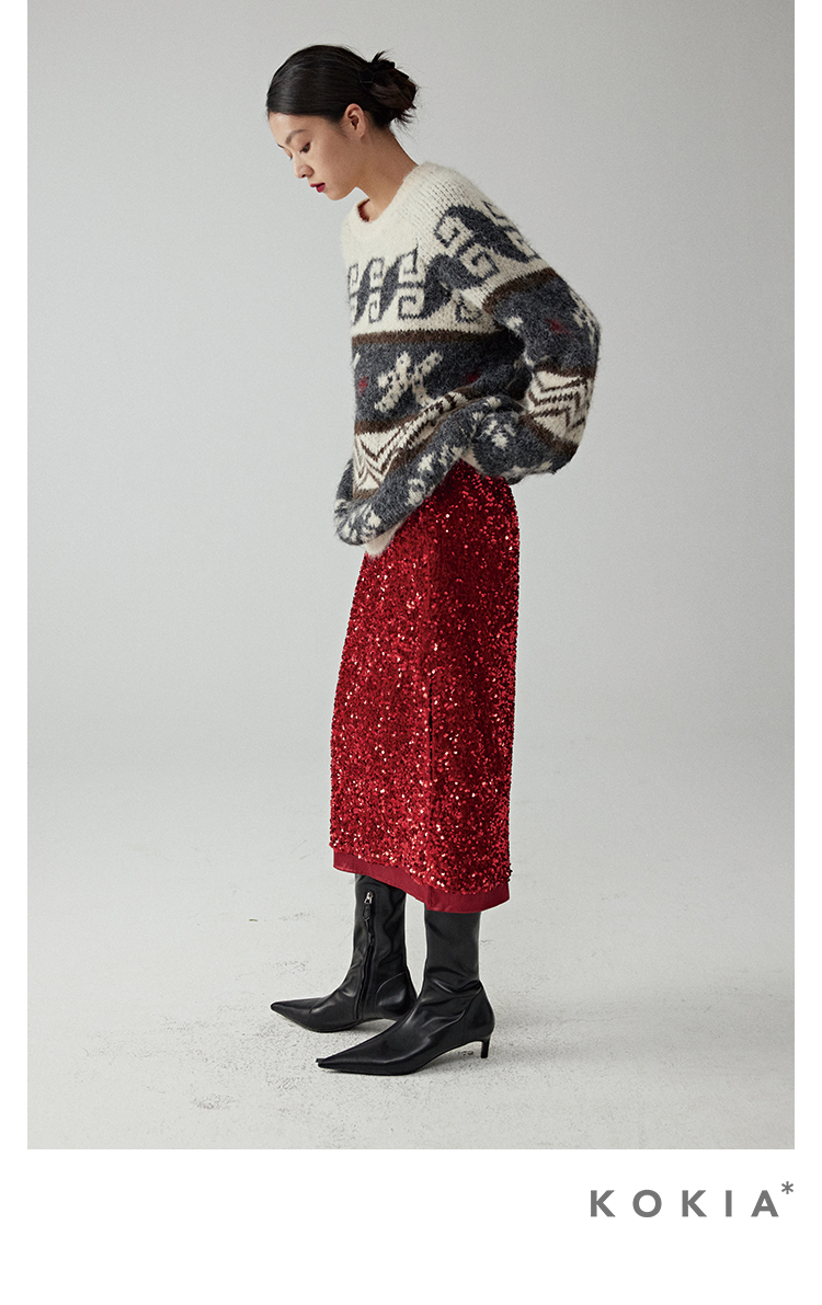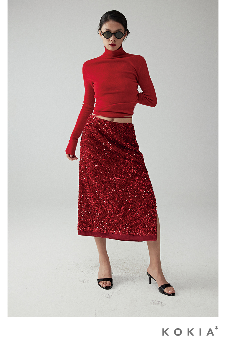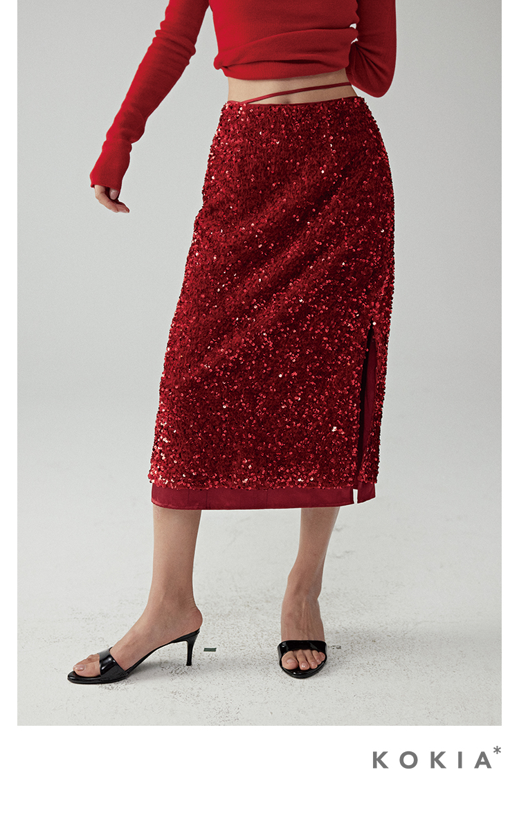 ASAYA2787 Pomegranate red velvet three-dimensional sequin light dress straight slit double layer skirt
