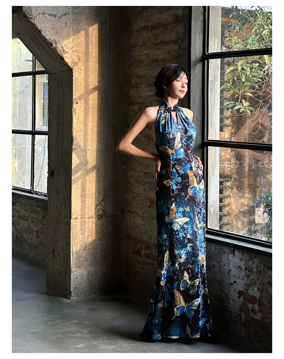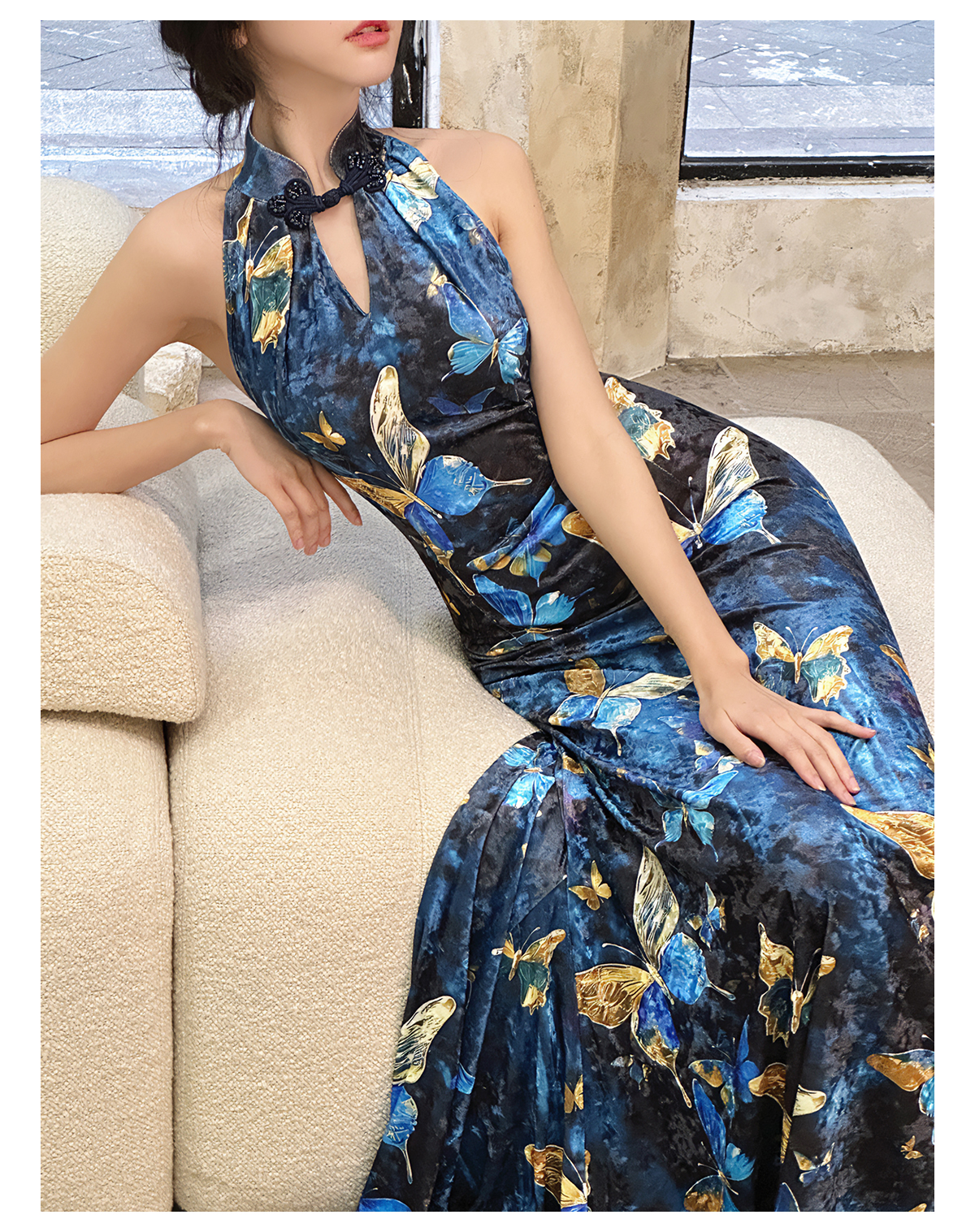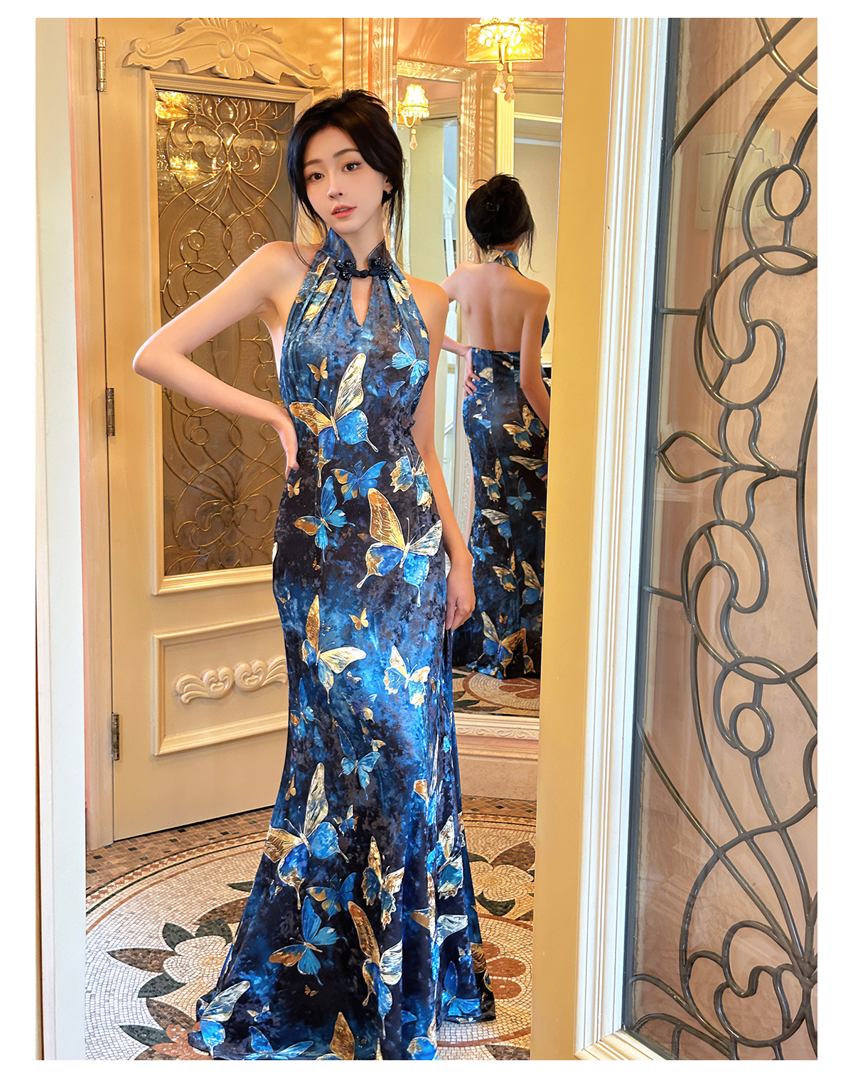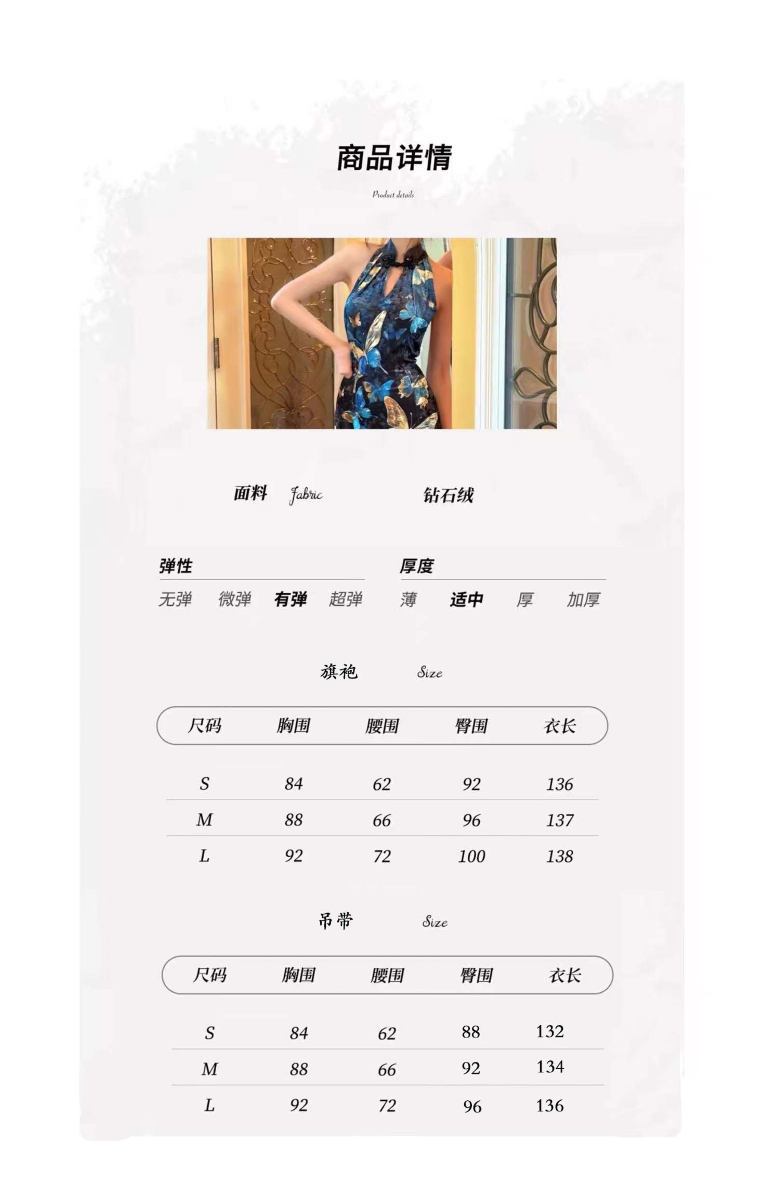 | Color classification | Blue Cheongsam Skirt (backless version) # Blue Cheongsam Skirt (backless version) Blue Swinging Collar Strap |