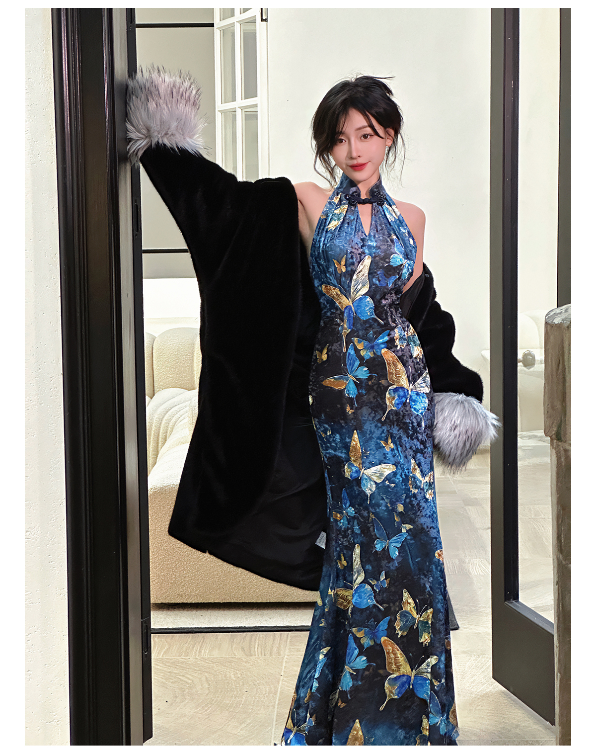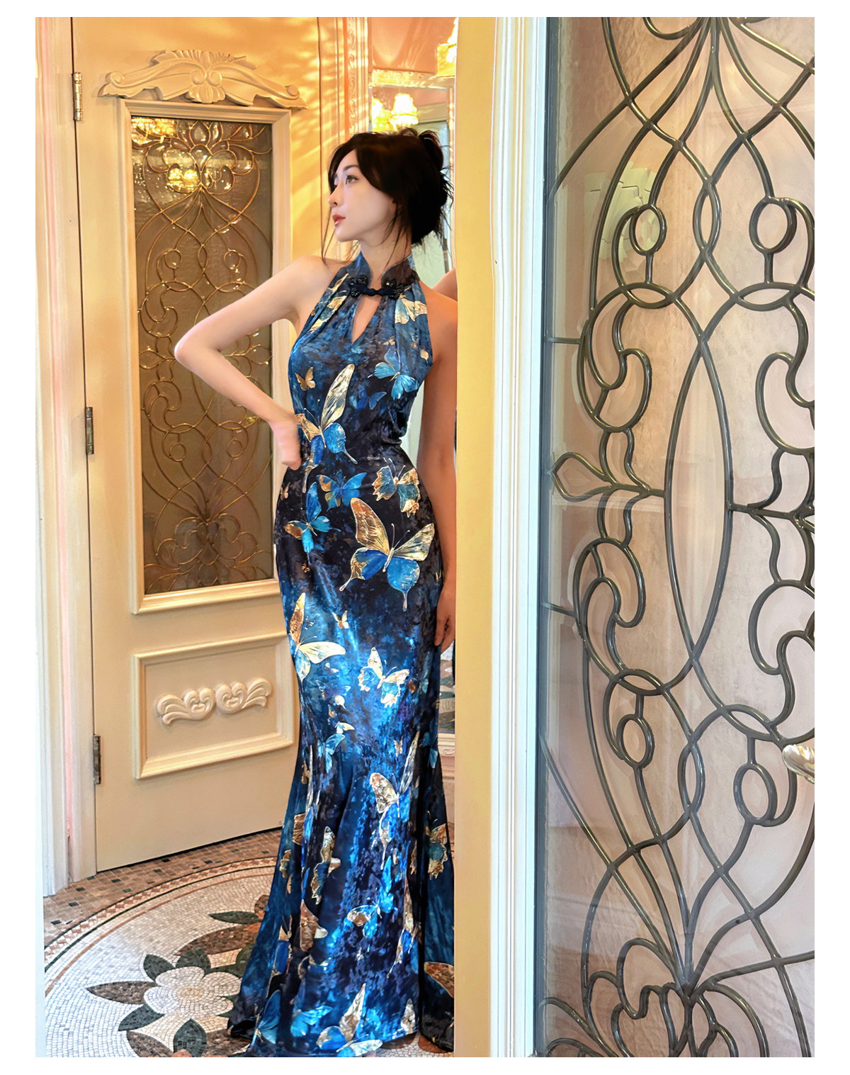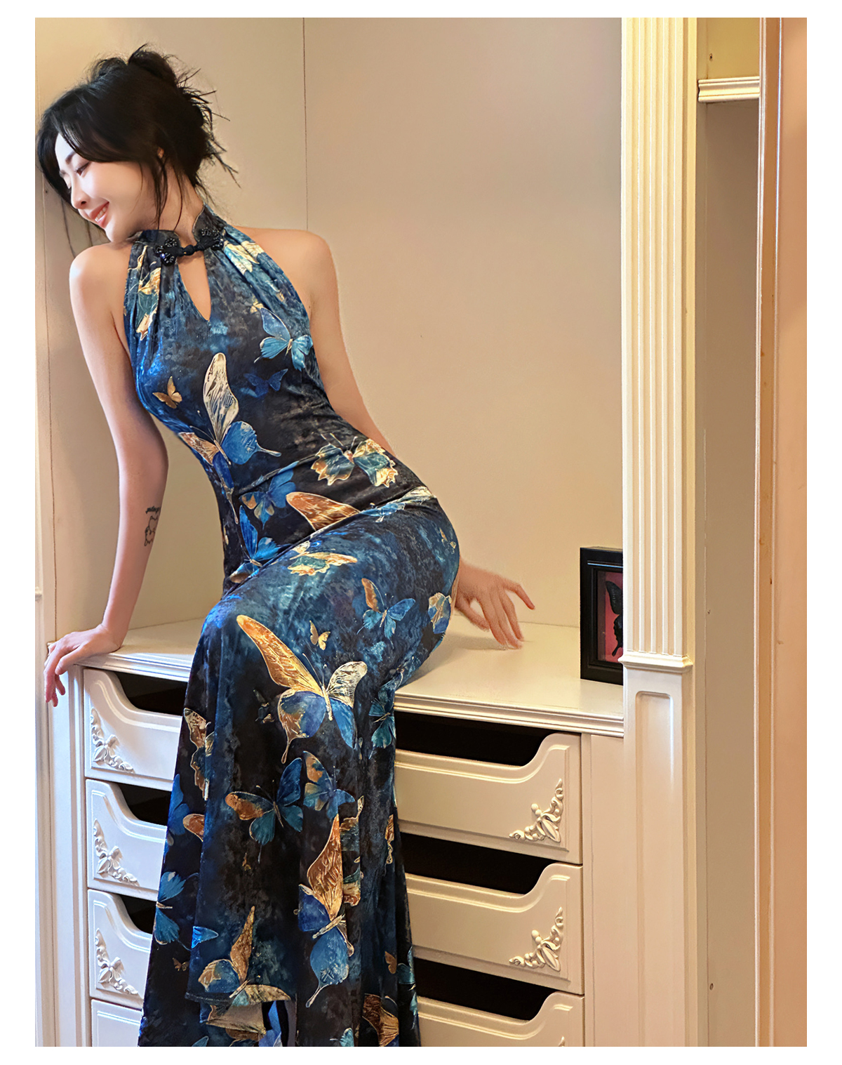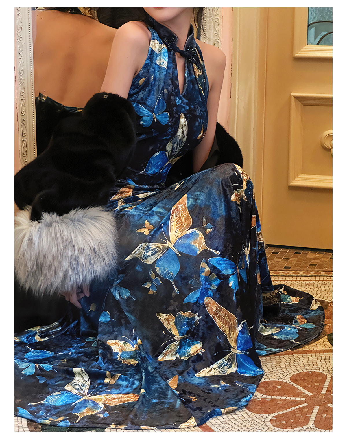 ASAYA3133 Gold velvet butterfly new Chinese style improved cheongsam dress