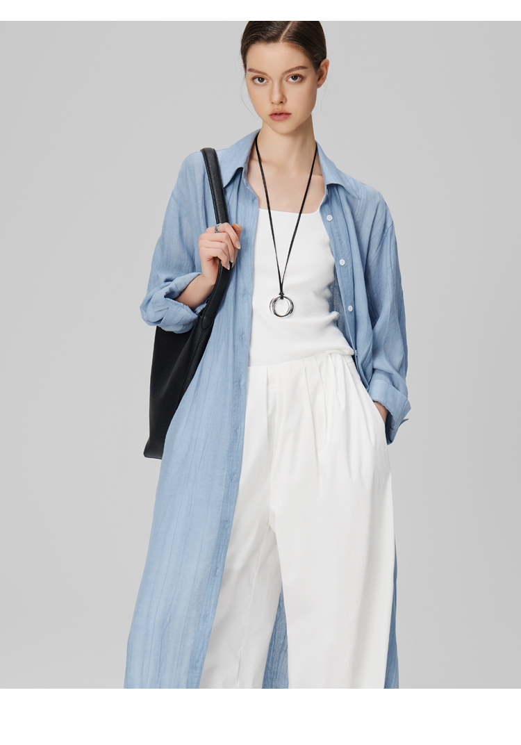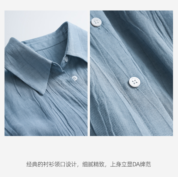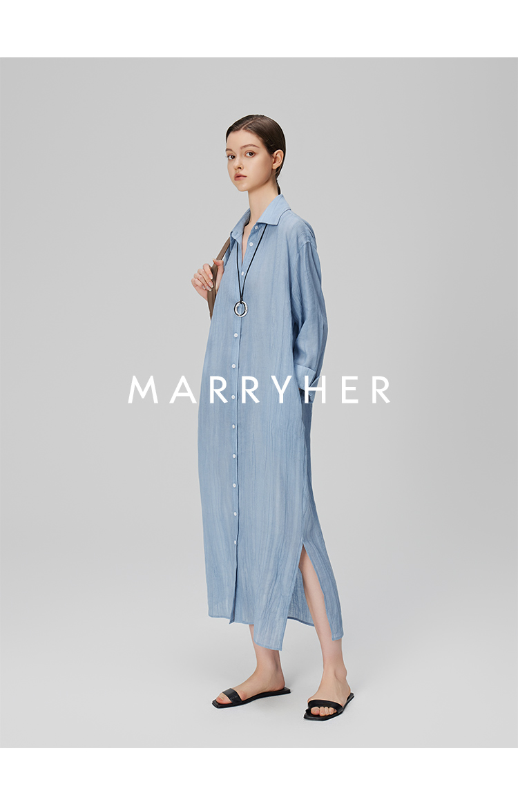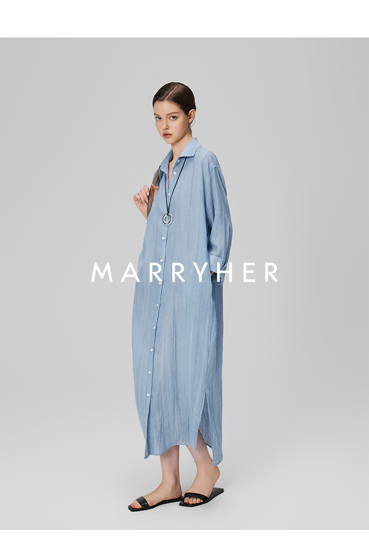 ASAYA3627 Wheat and Grape lazy and casual minimalist pleated ramie long skirt light blue shirt-style dres