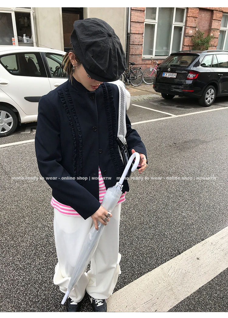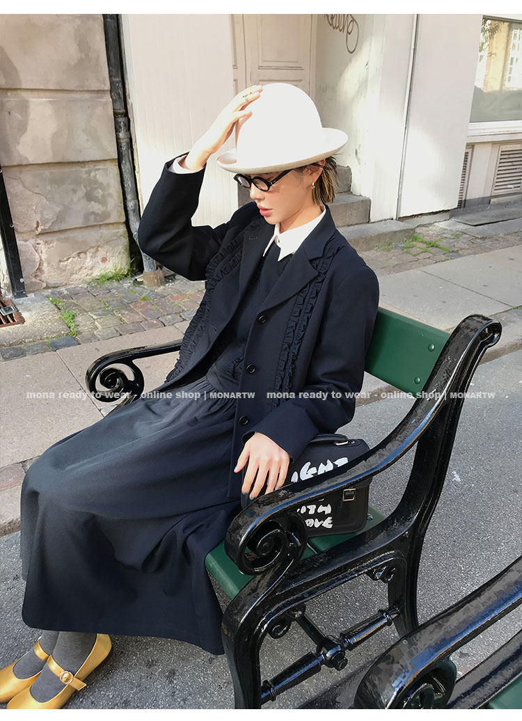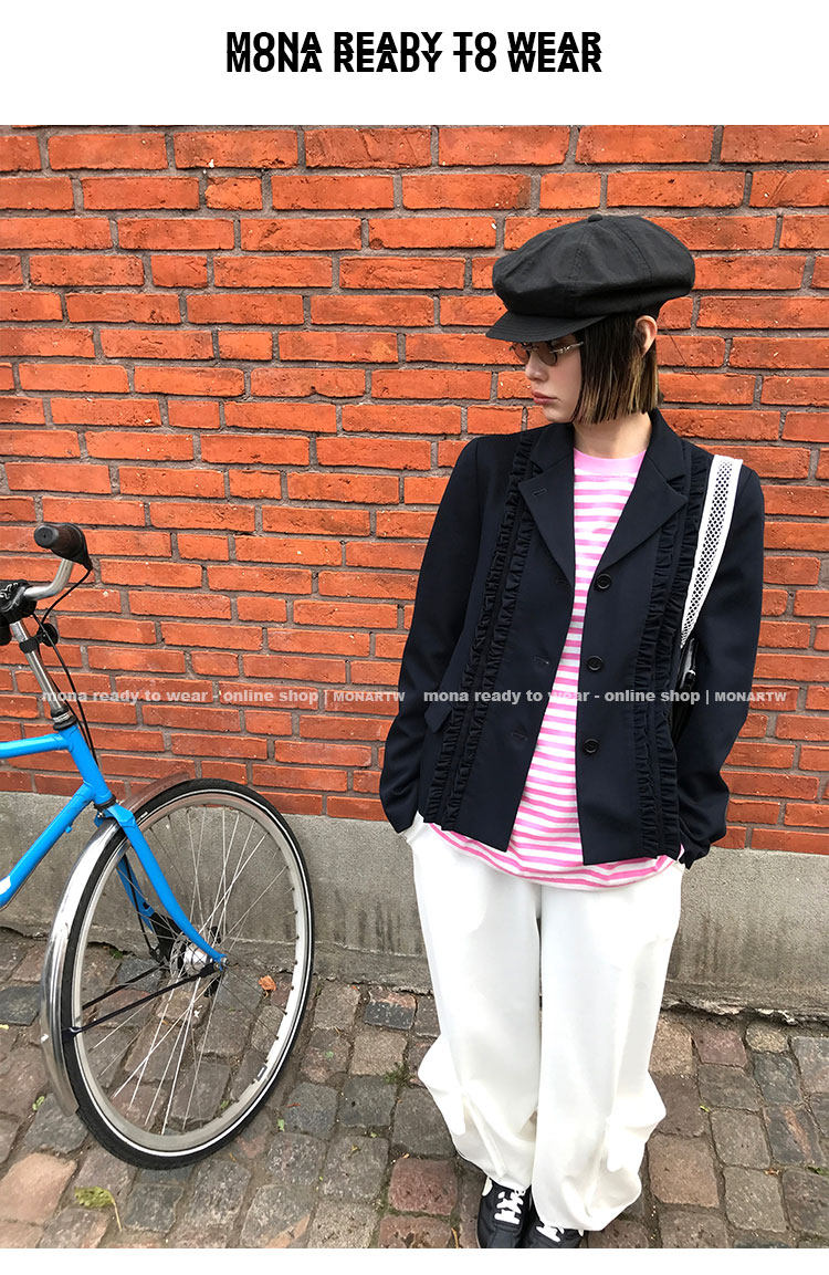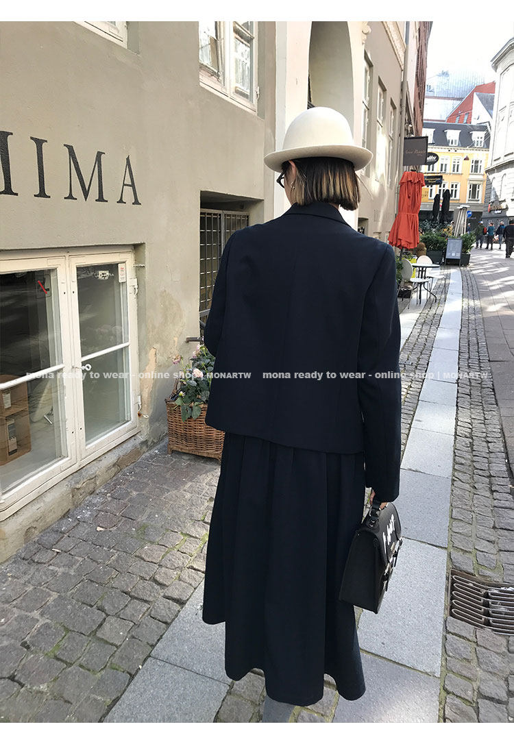外套围度偏合身有余量,正面为线条利落的偏H版型