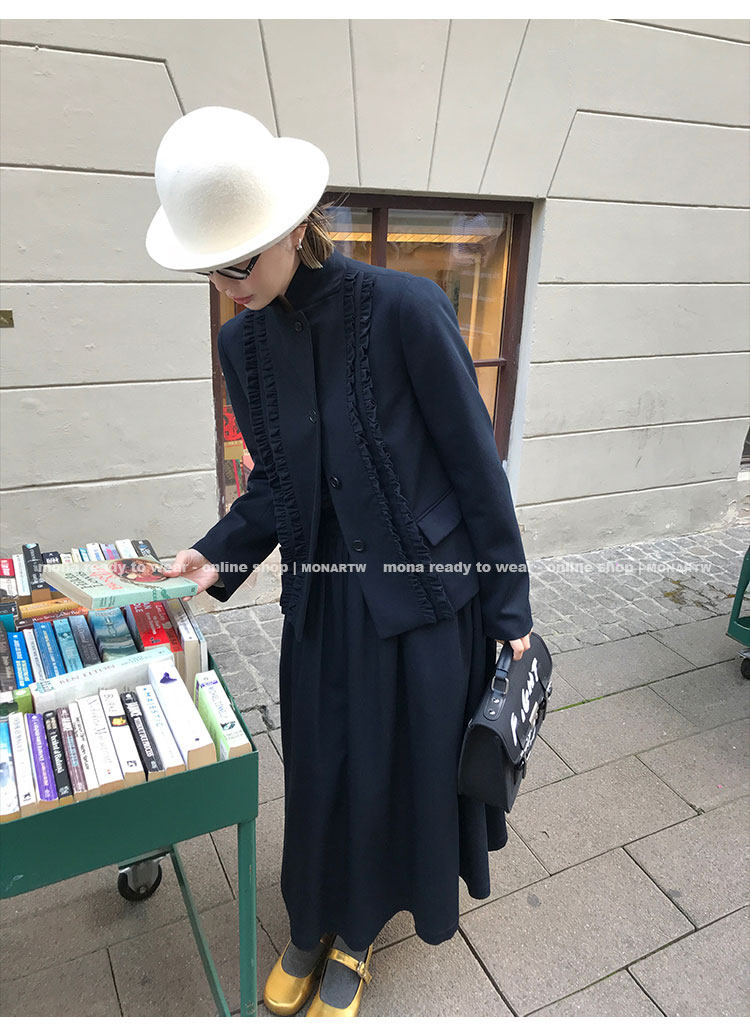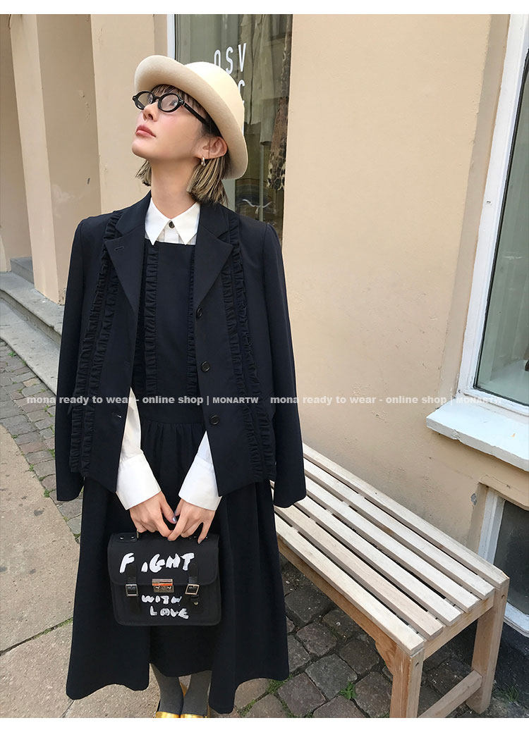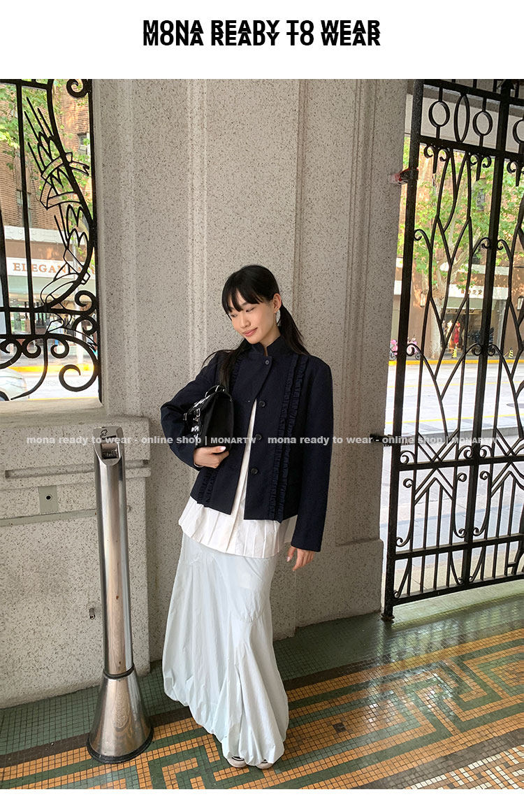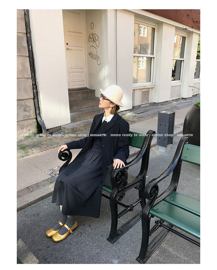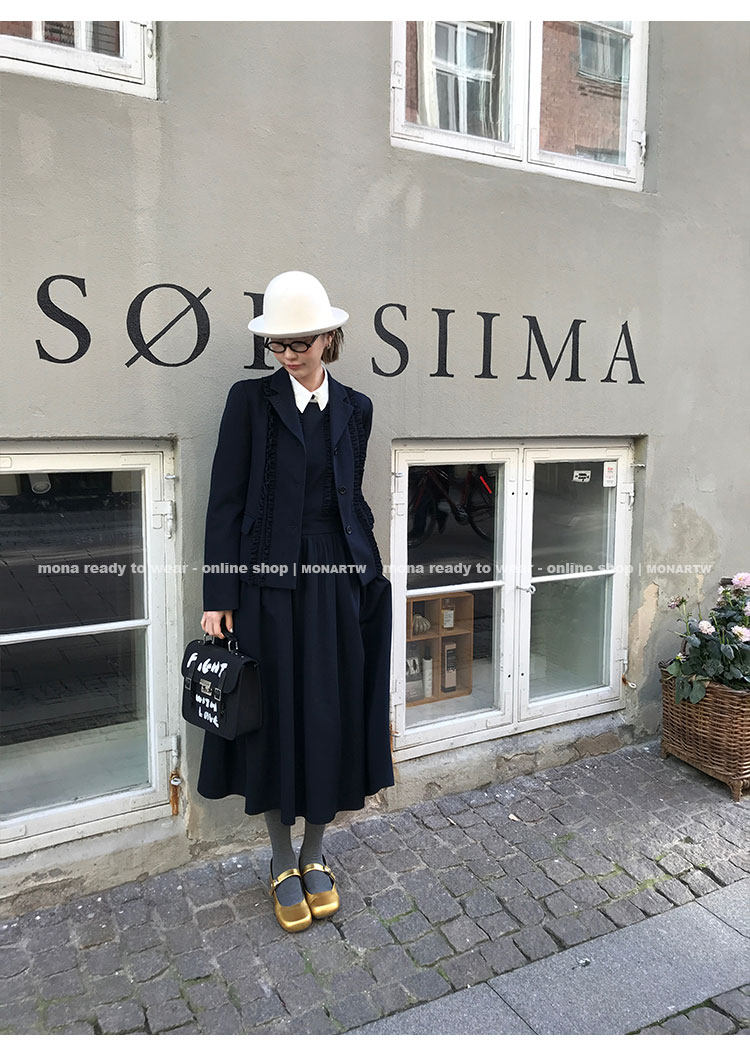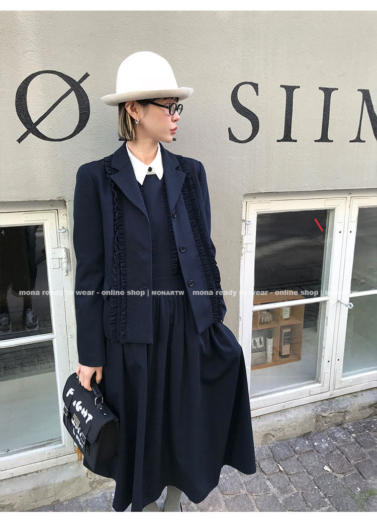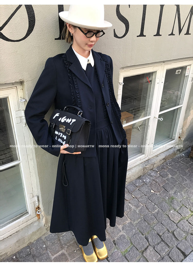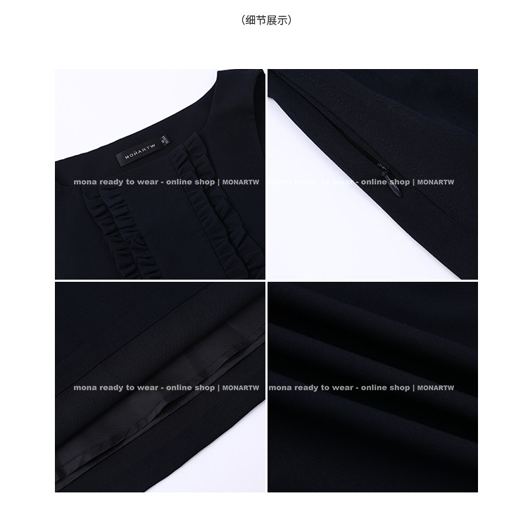 恰到好处的小U领,胸前做了抽褶双层木耳边