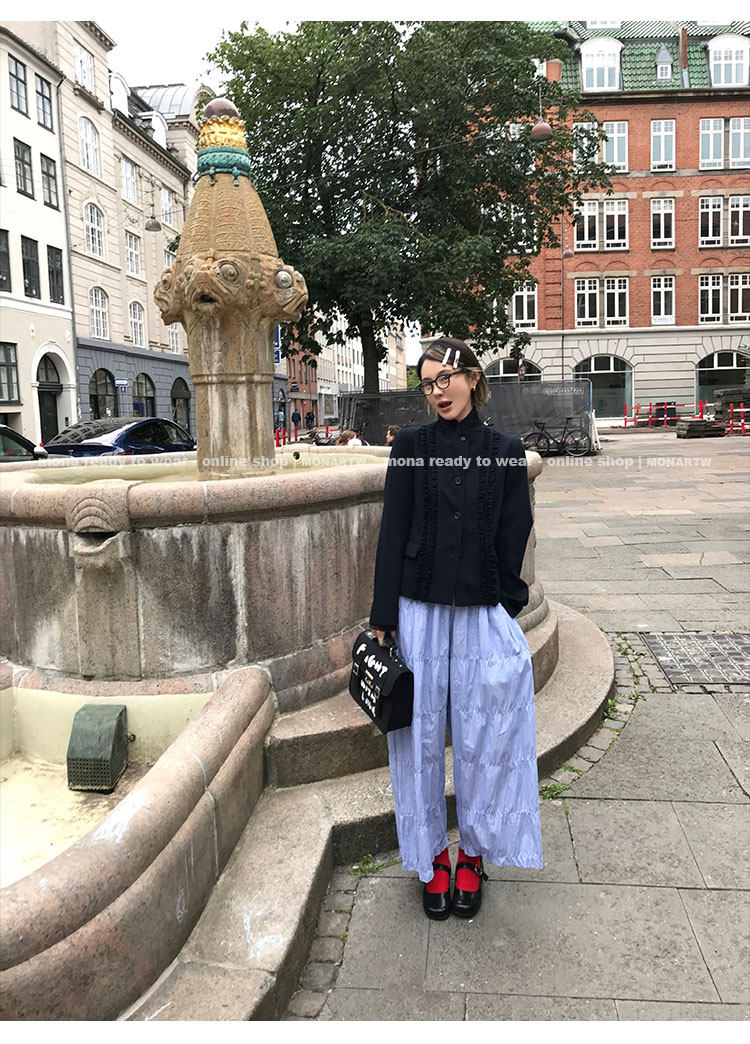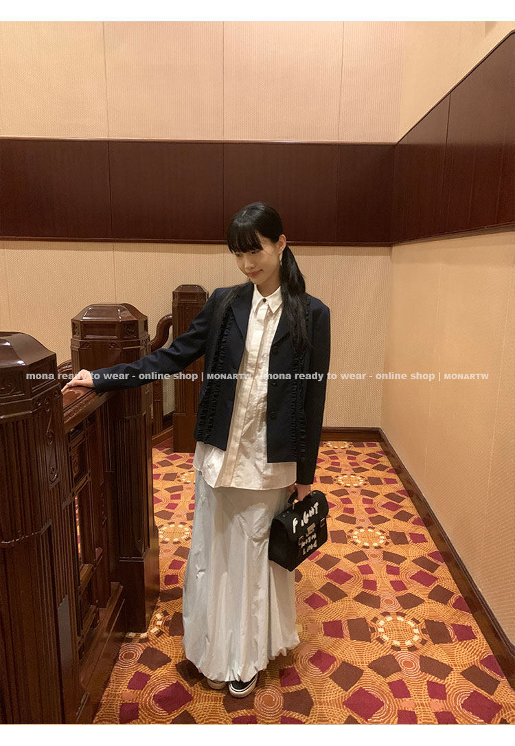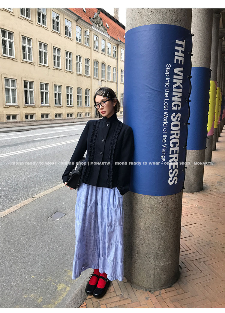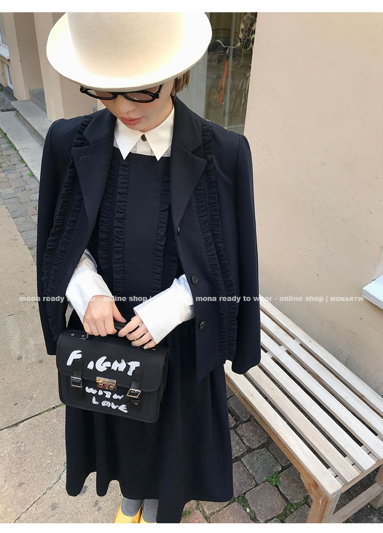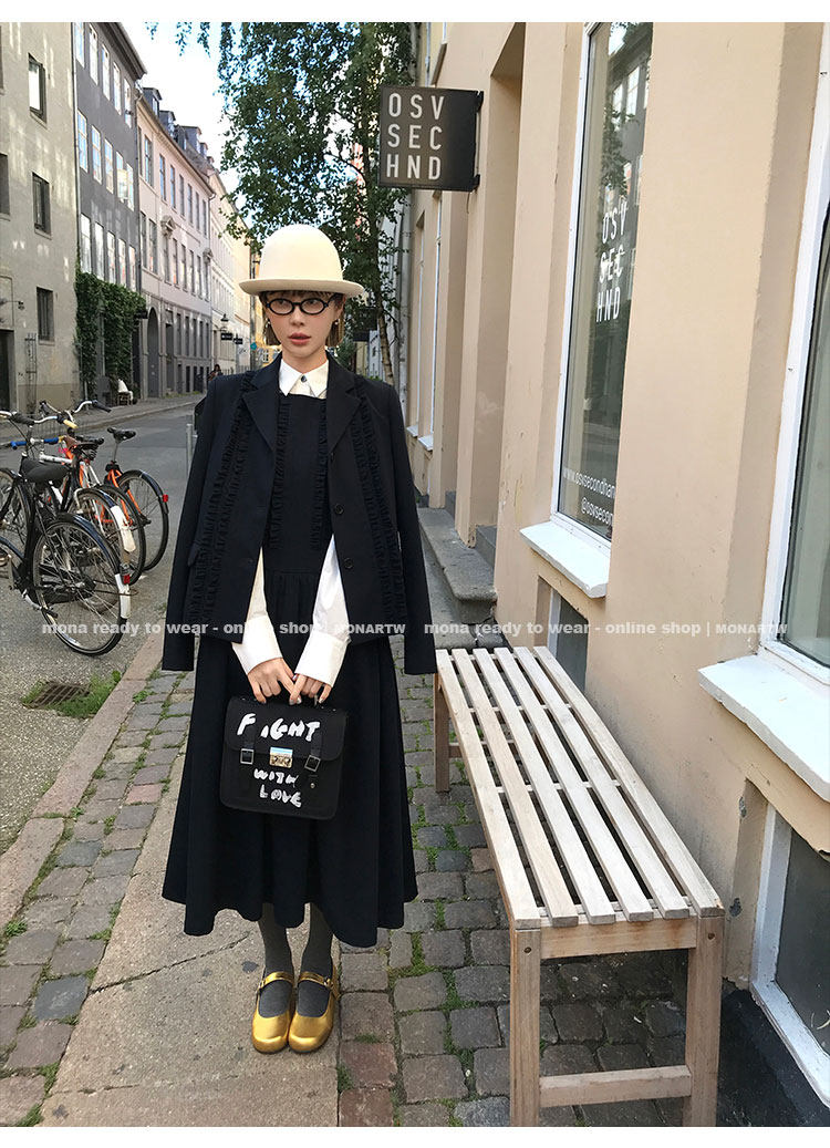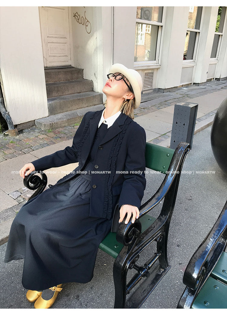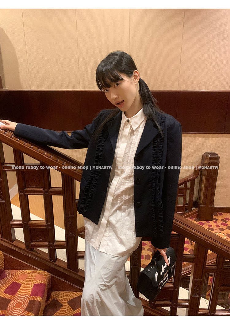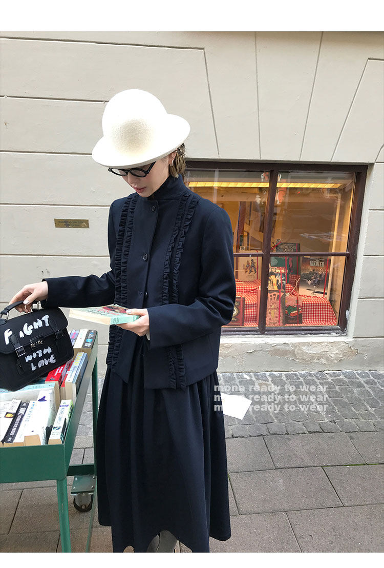 恰到好处的小U领,胸前做了抽褶双层木耳边