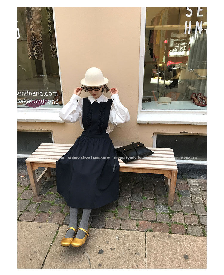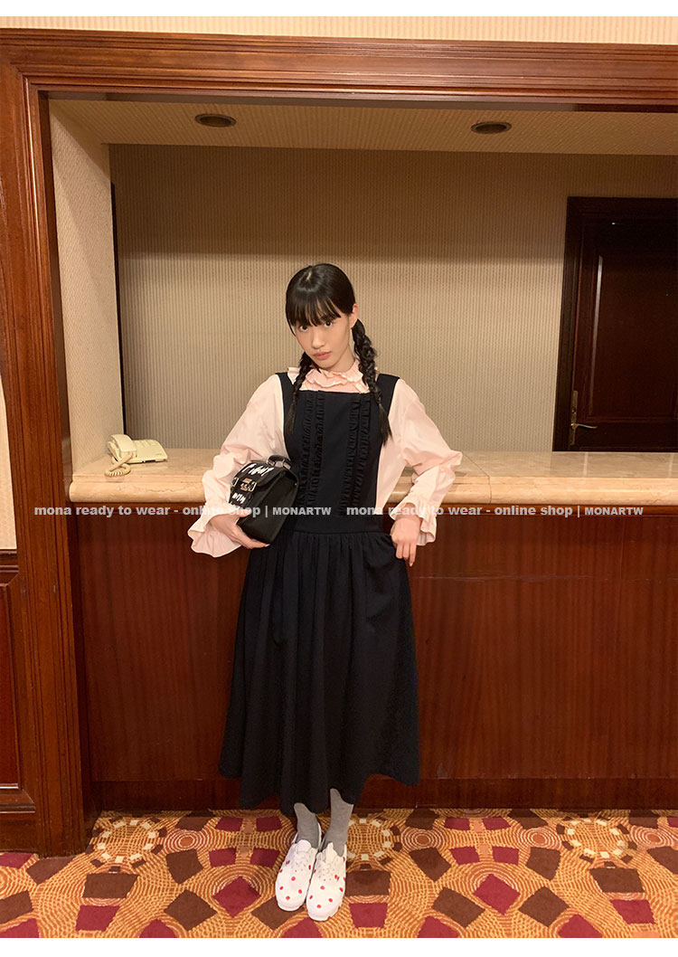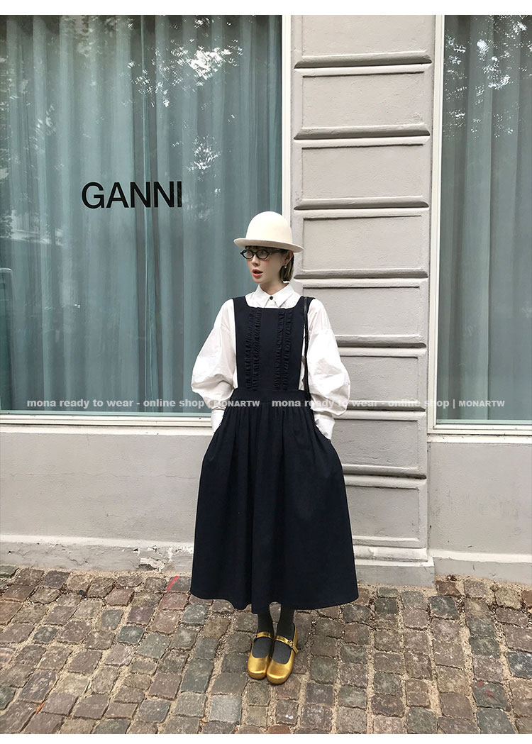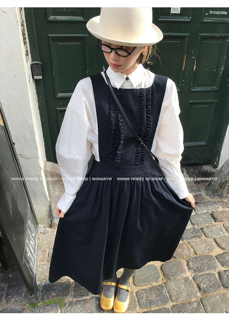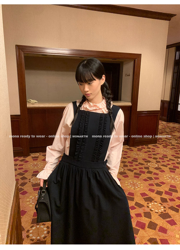 背带裙上半部分结合复合工艺,注入结构感,平顺不臃肿