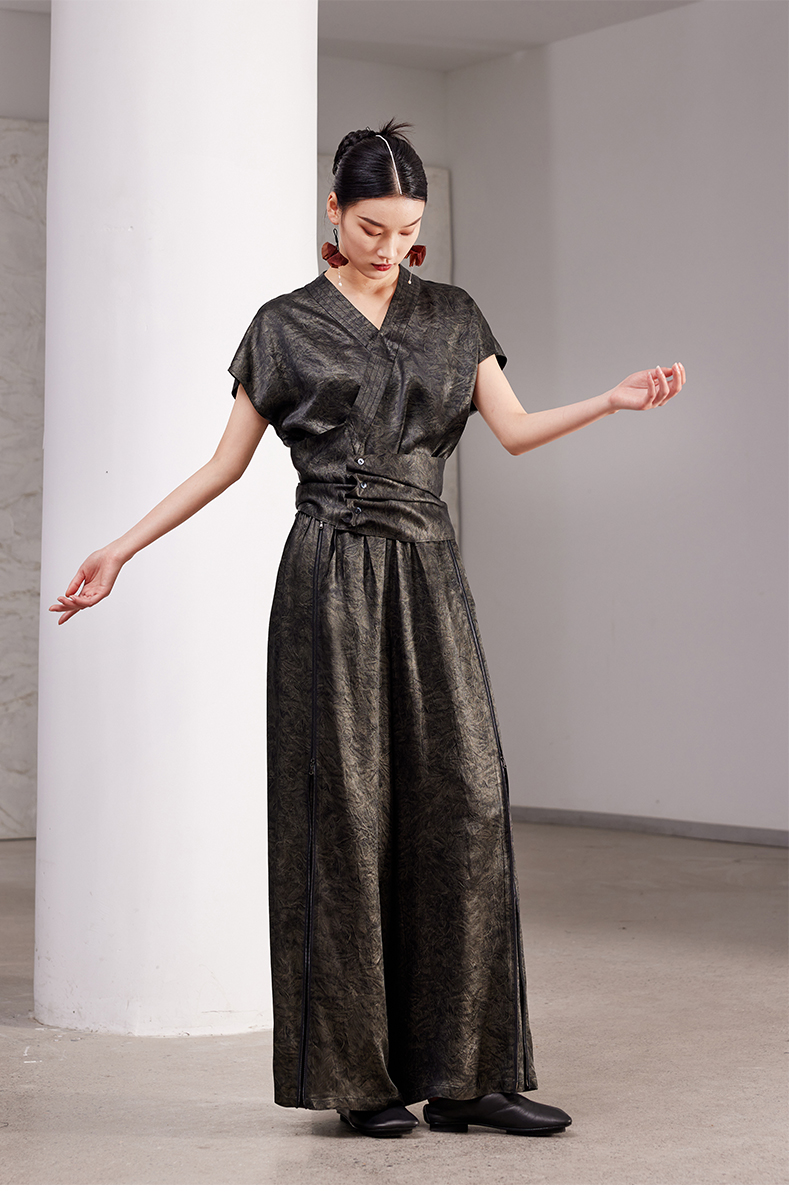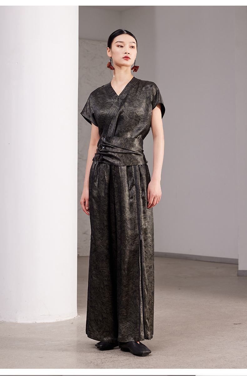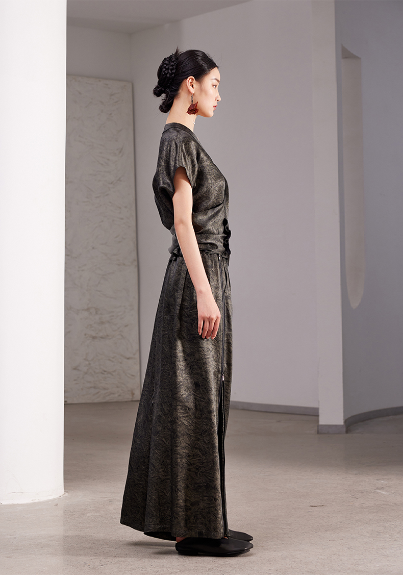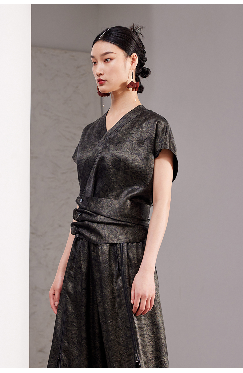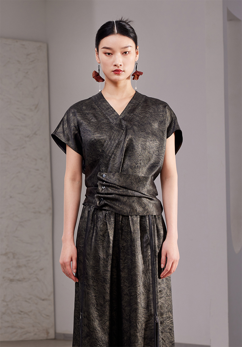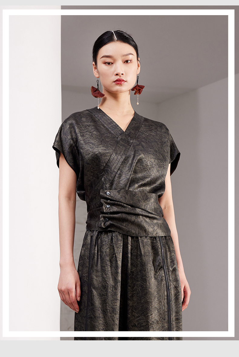| Style details | Distressed buttons, printed pleats, asymmetric |