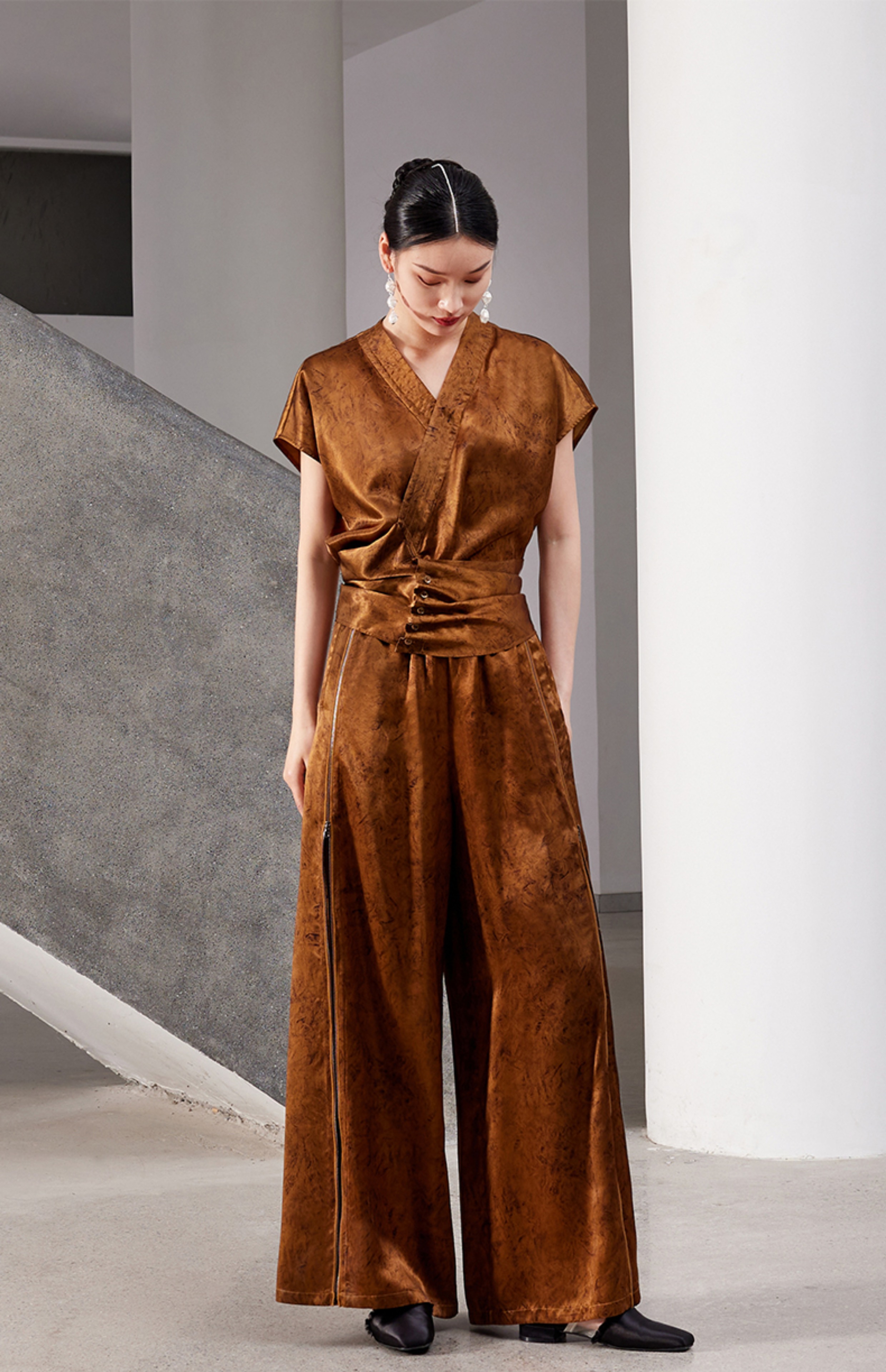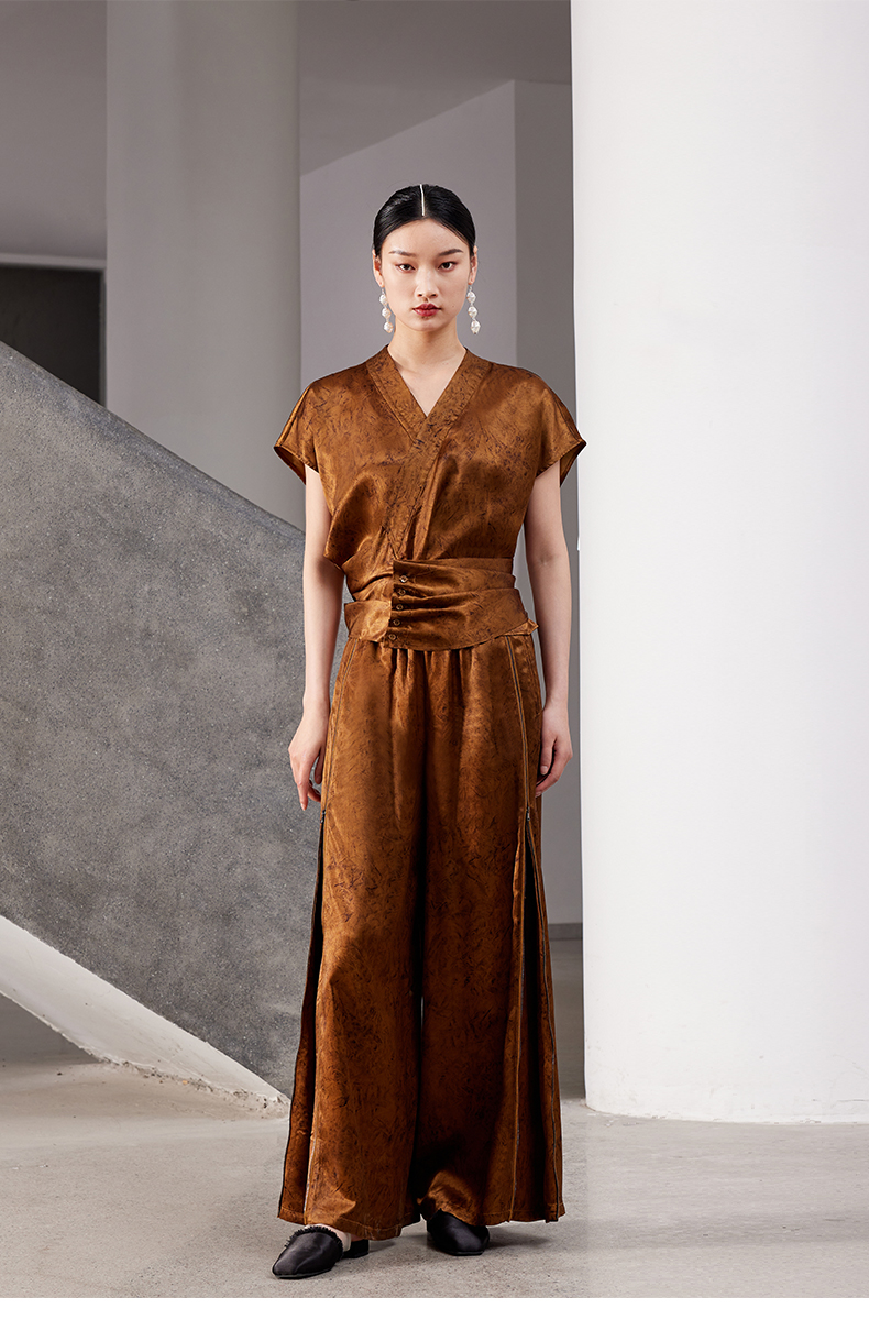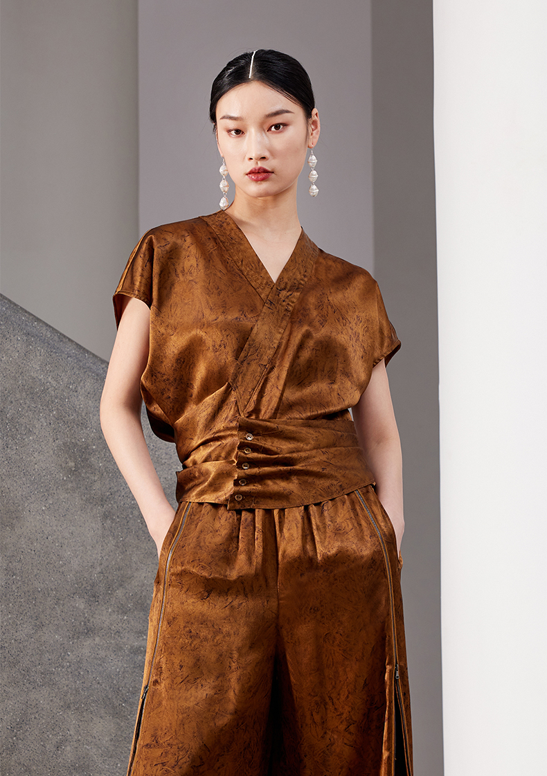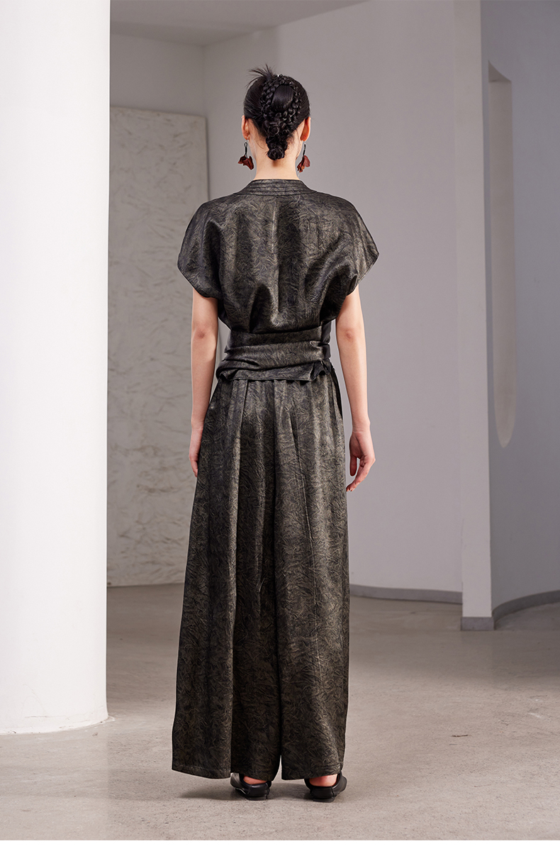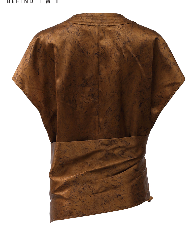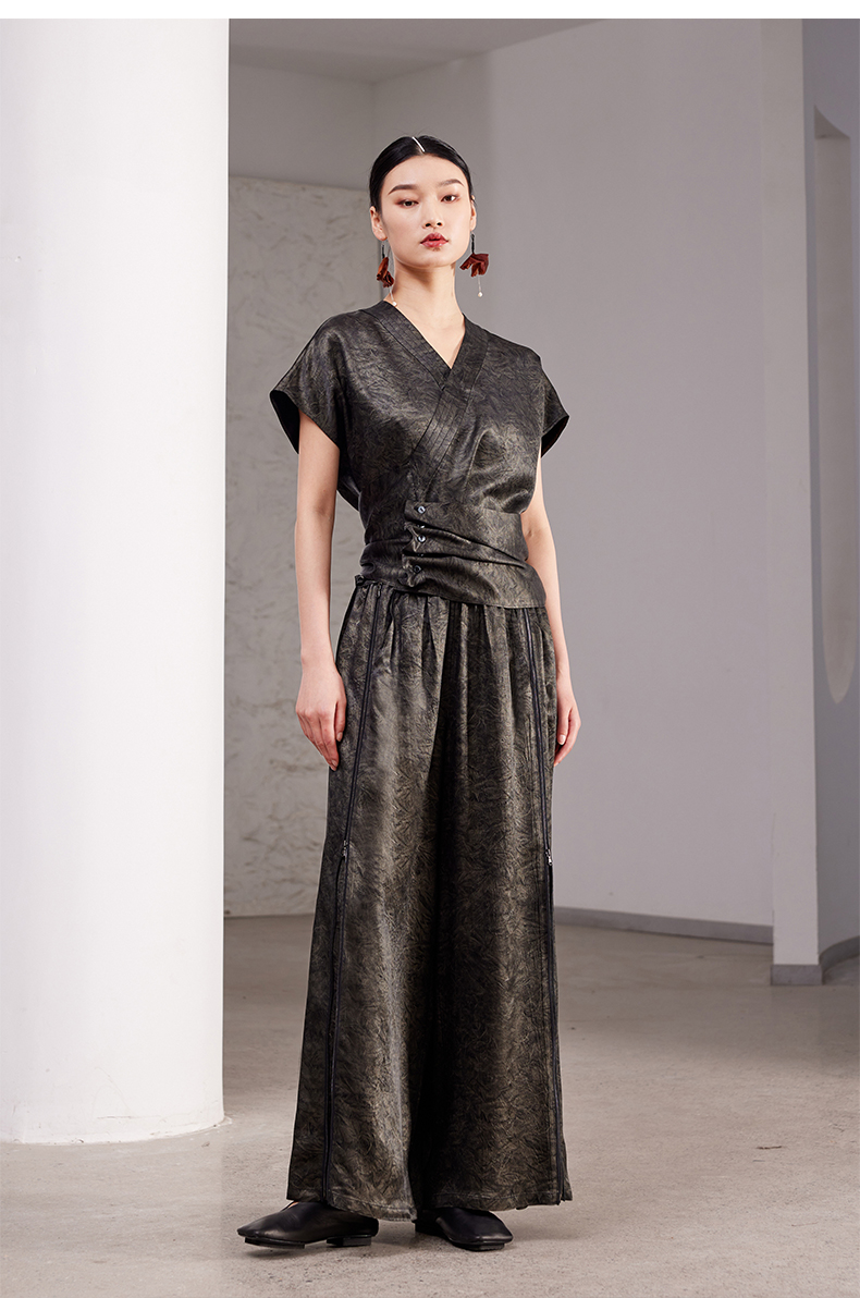 | Style details | Distressed buttons, printed pleats, asymmetric |