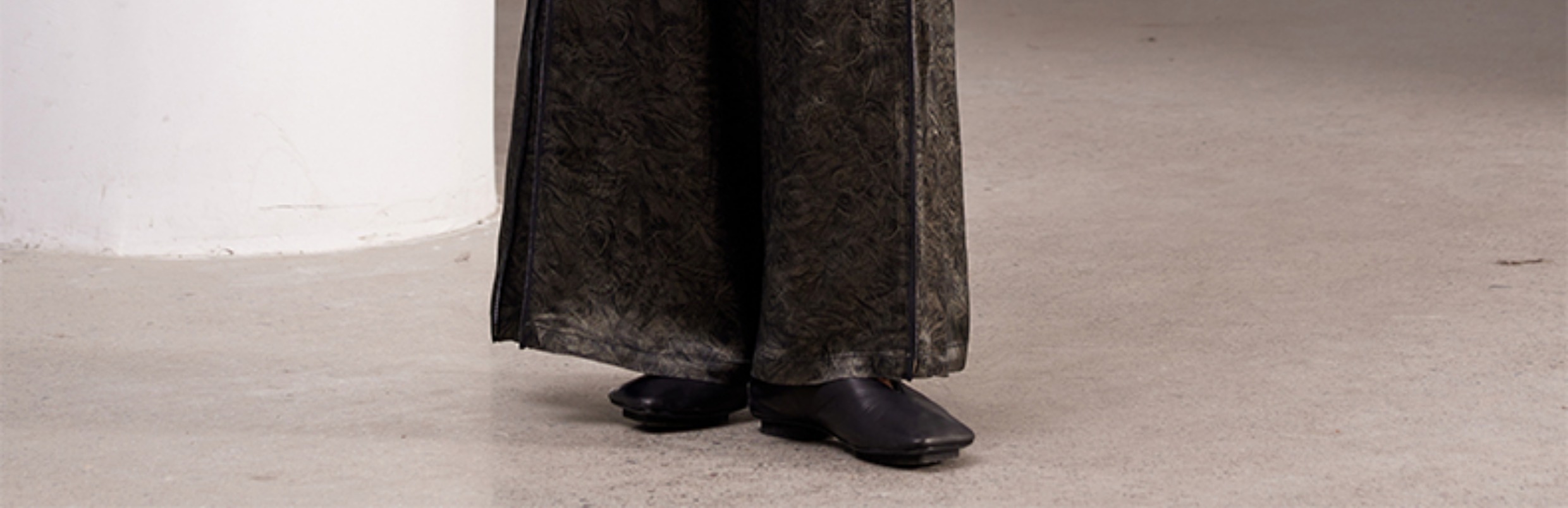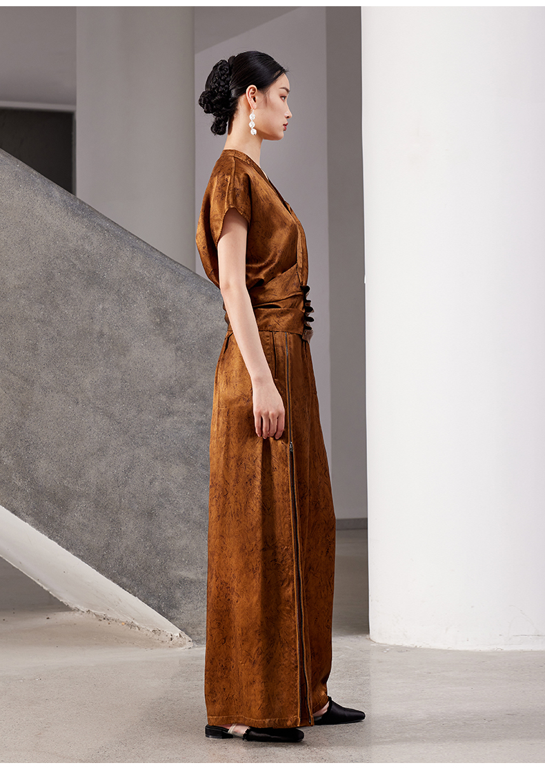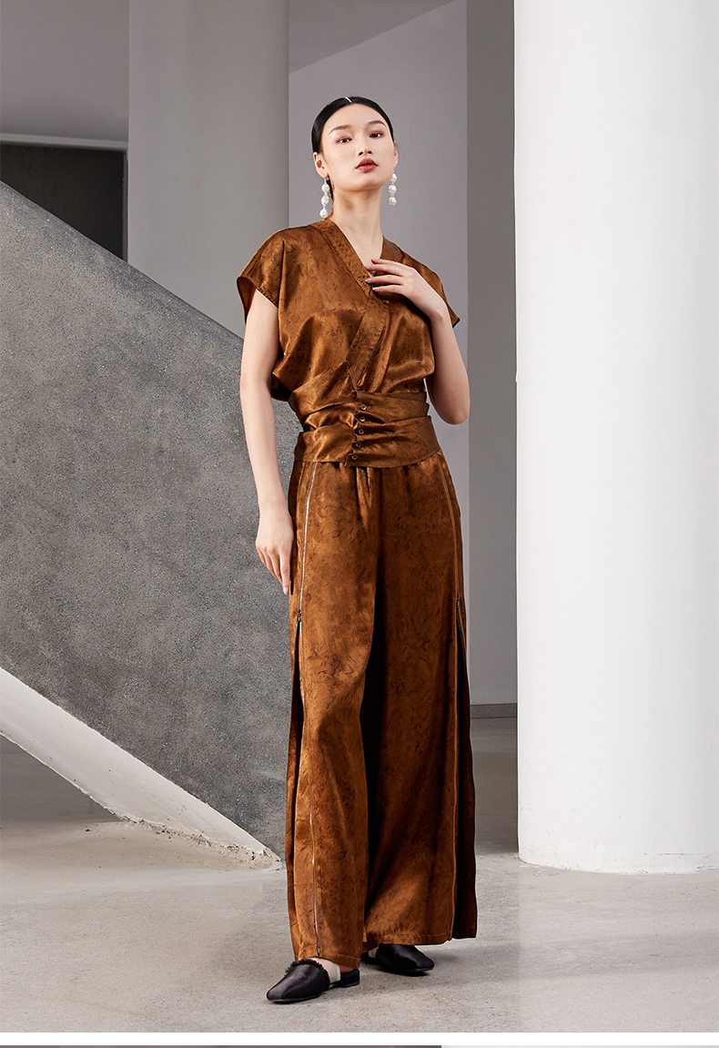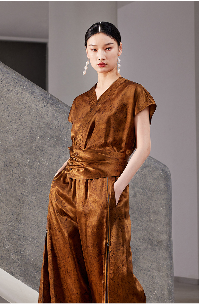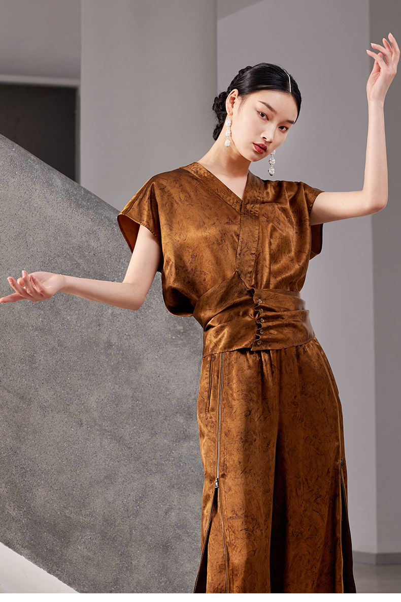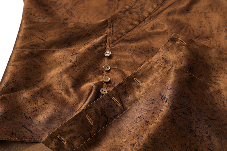 | Style details | Distressed buttons, printed pleats, asymmetric |