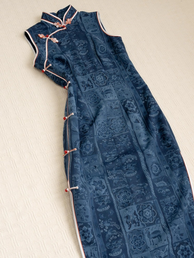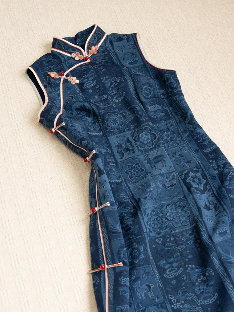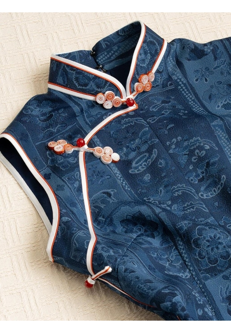 | color classification | Blue stand up collar contrasting color oblique placket buckle jacquard sleeveless cheongsam |