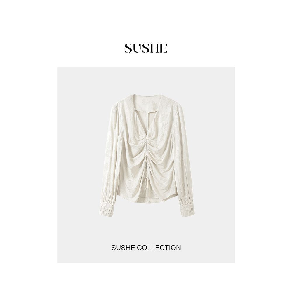 ASAYA2386 Oriental Dancer New Chinese Style Women’s V-neck White Dark Pattern Design Slim Shirt