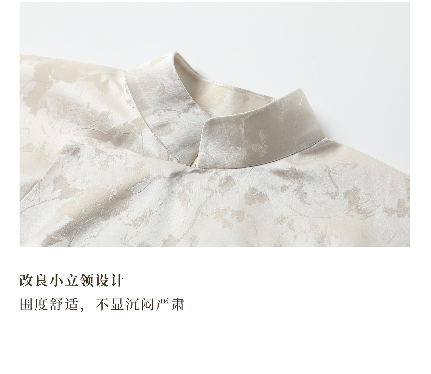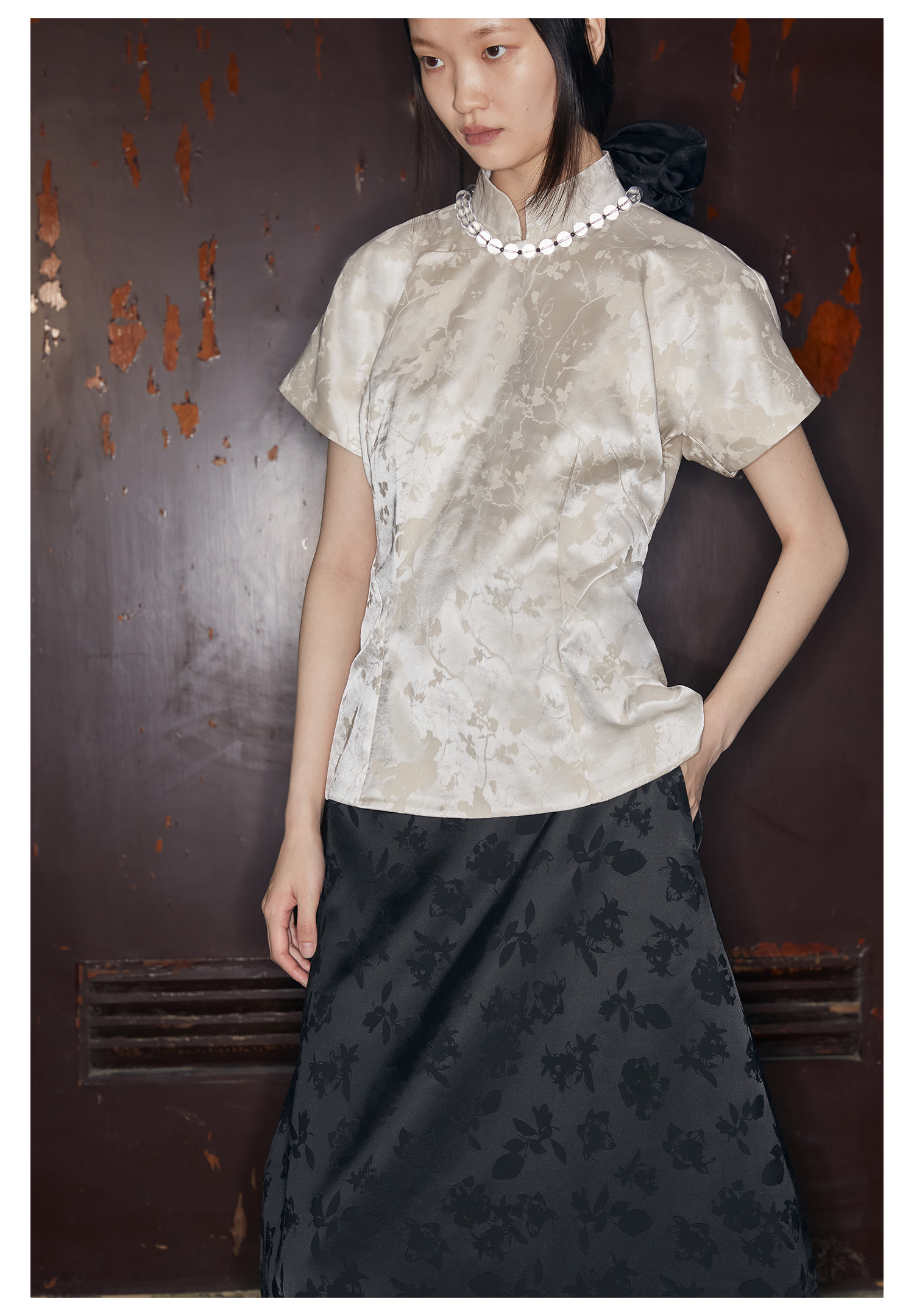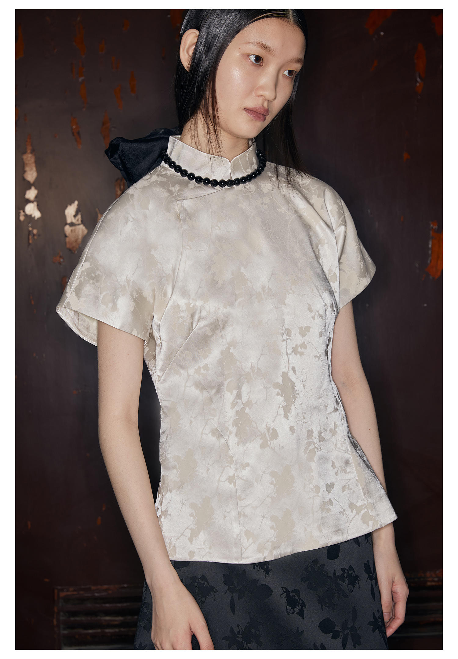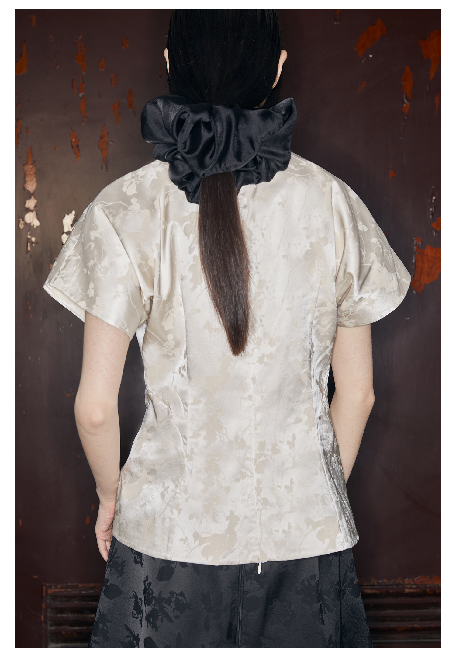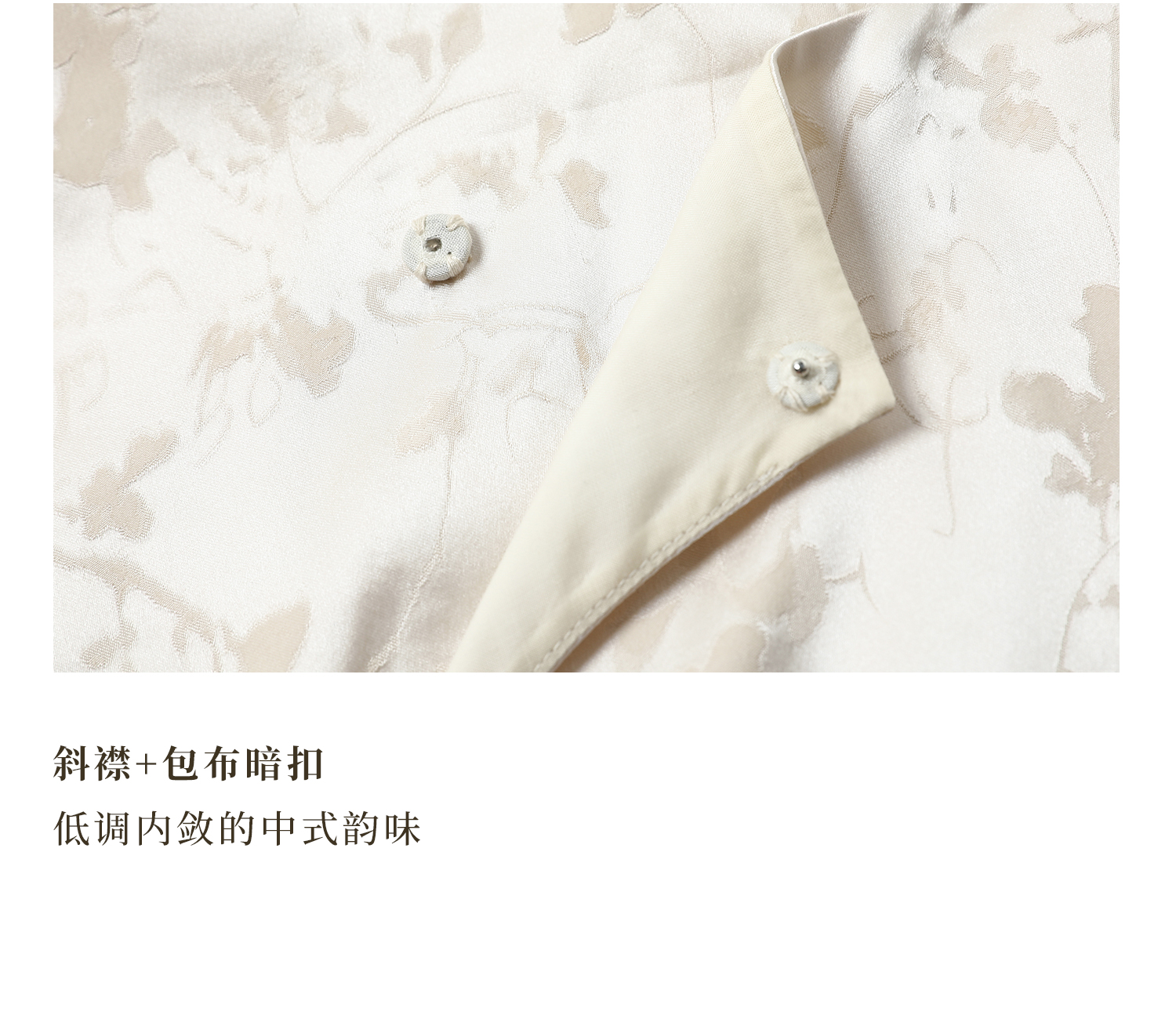ASAYA3373 Chinese Style Beige Satin Jacquard Three-dimensional Slanted Placket Retro Shirt