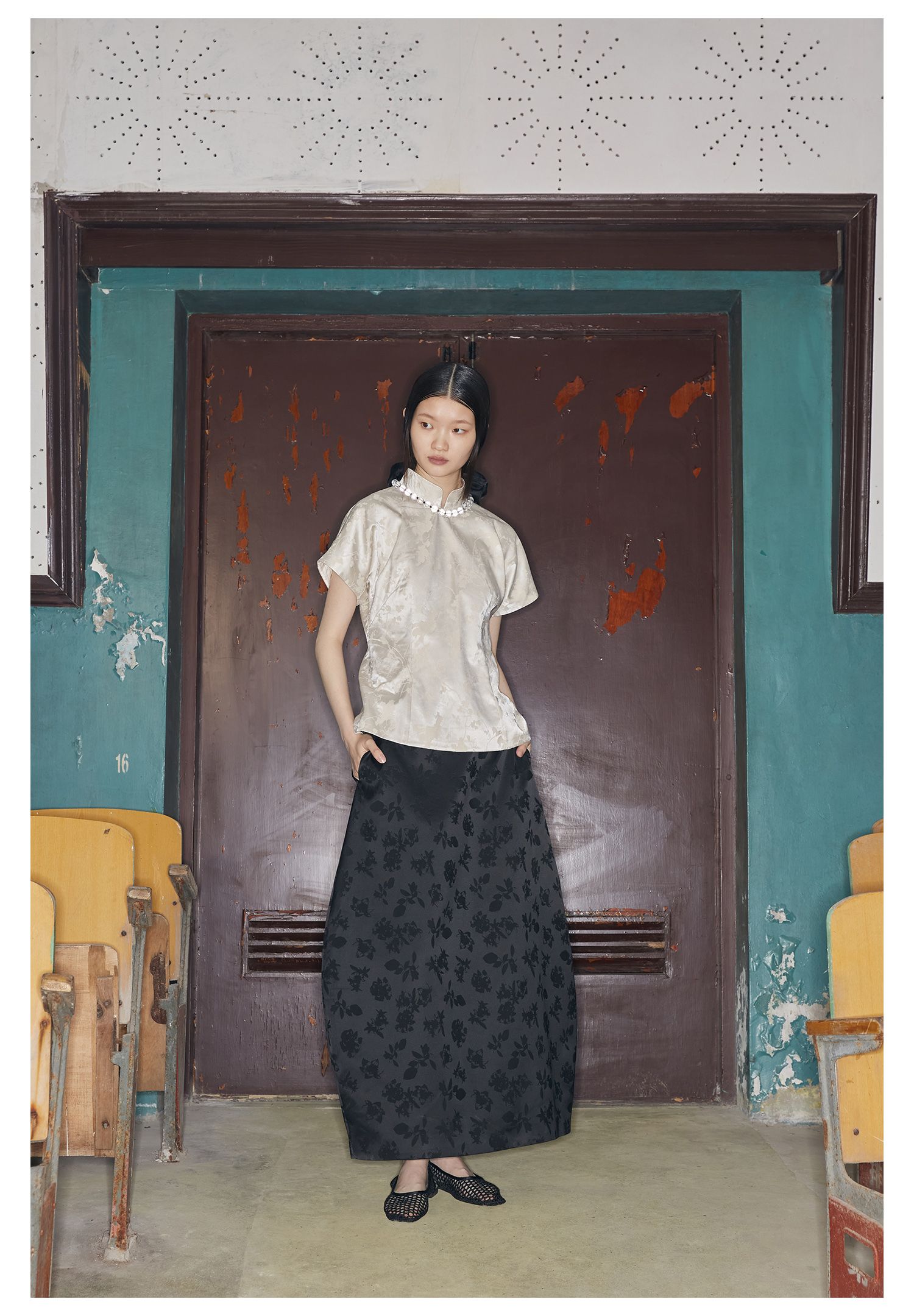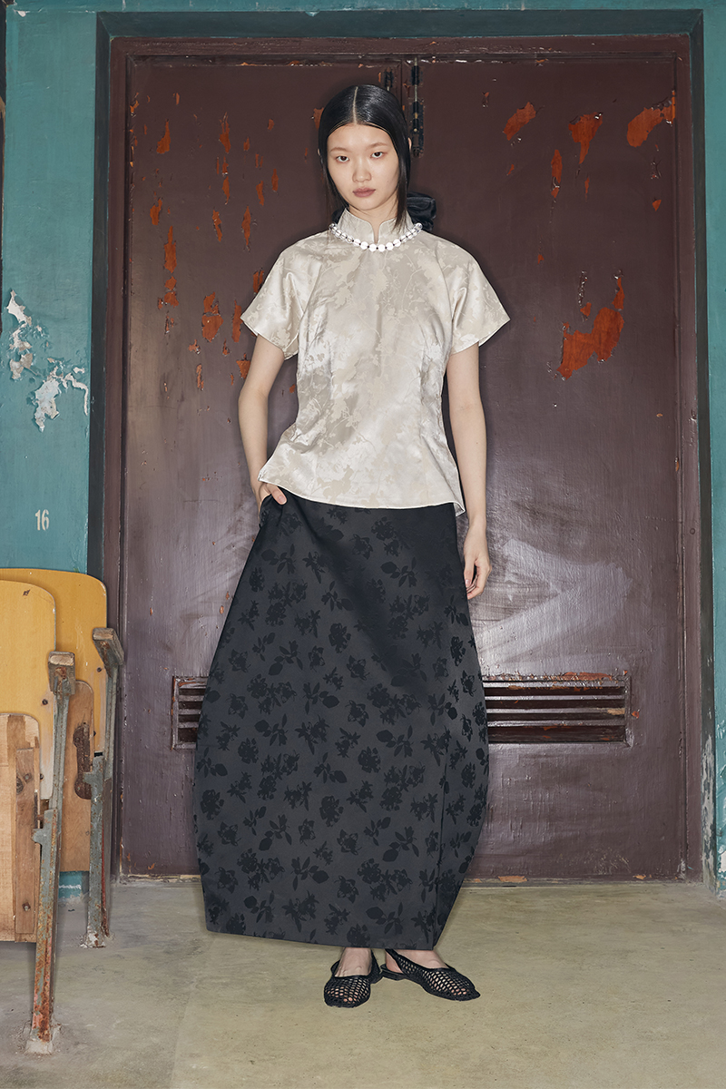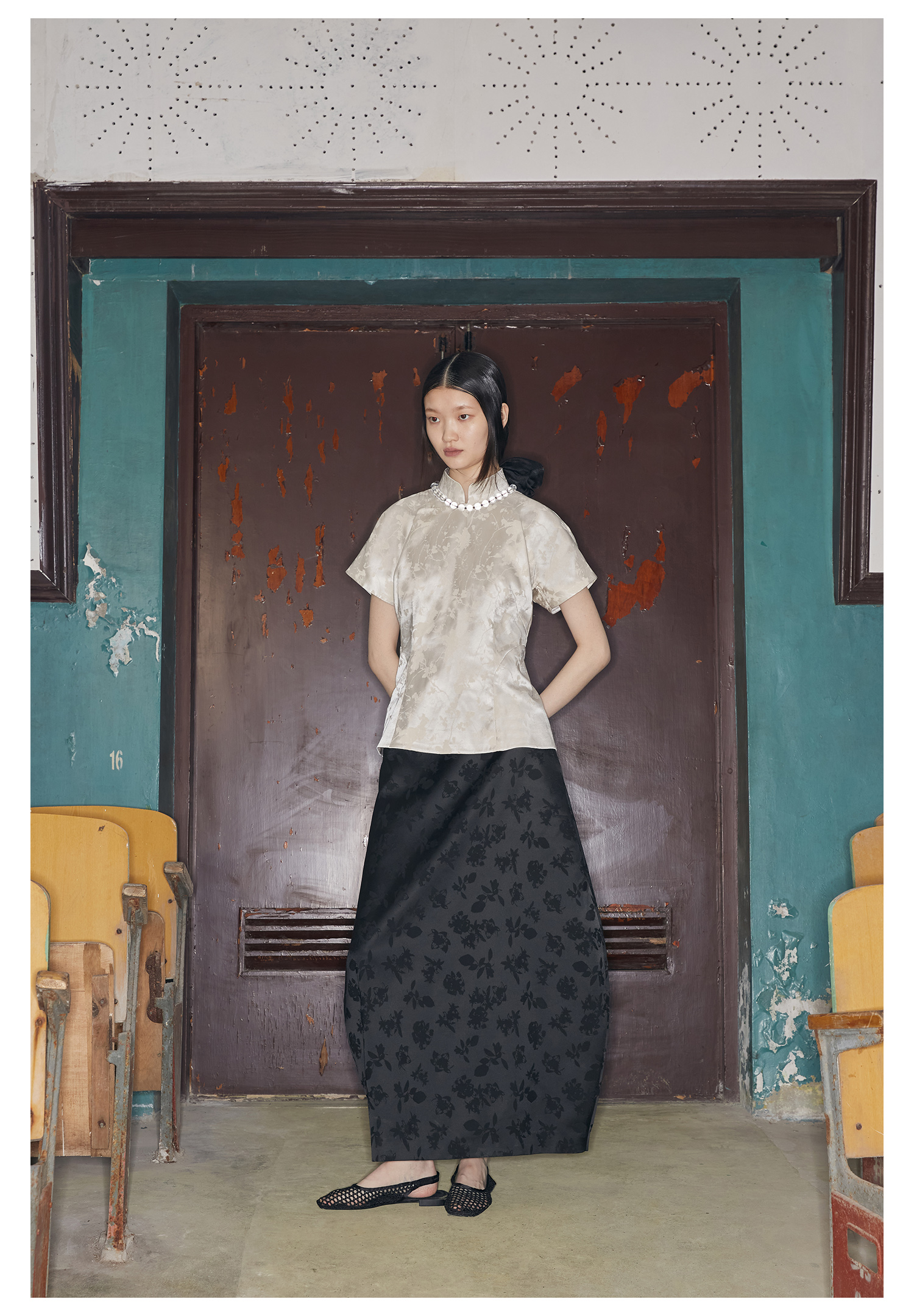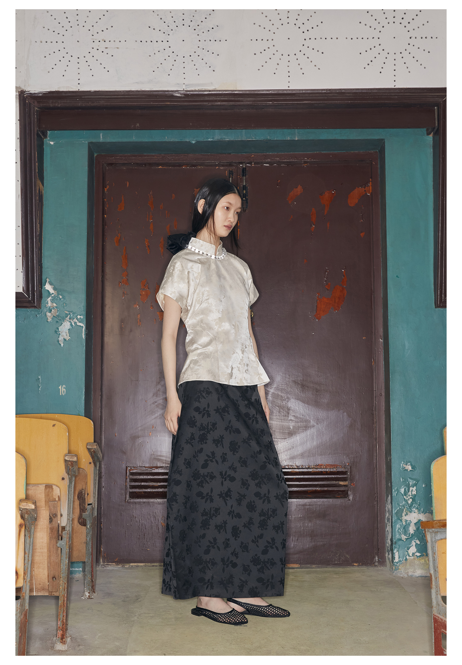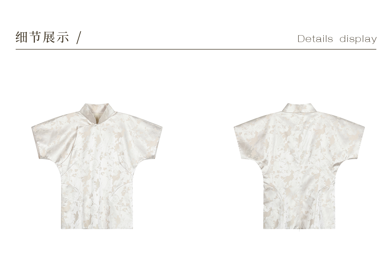 ASAYA3373 Chinese Style Beige Satin Jacquard Three-dimensional Slanted Placket Retro Shirt