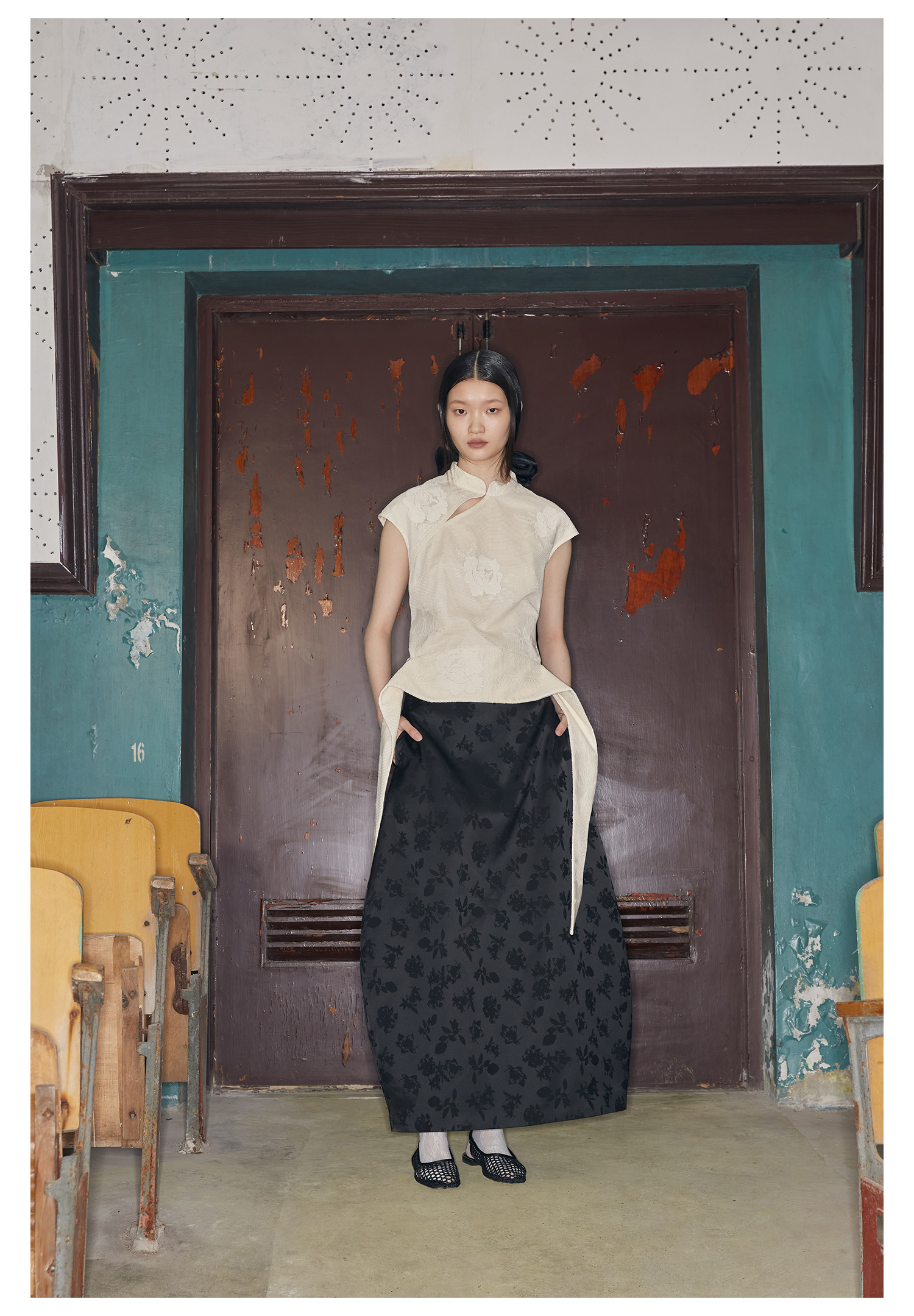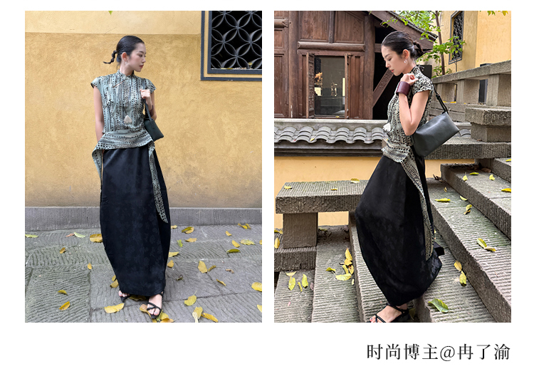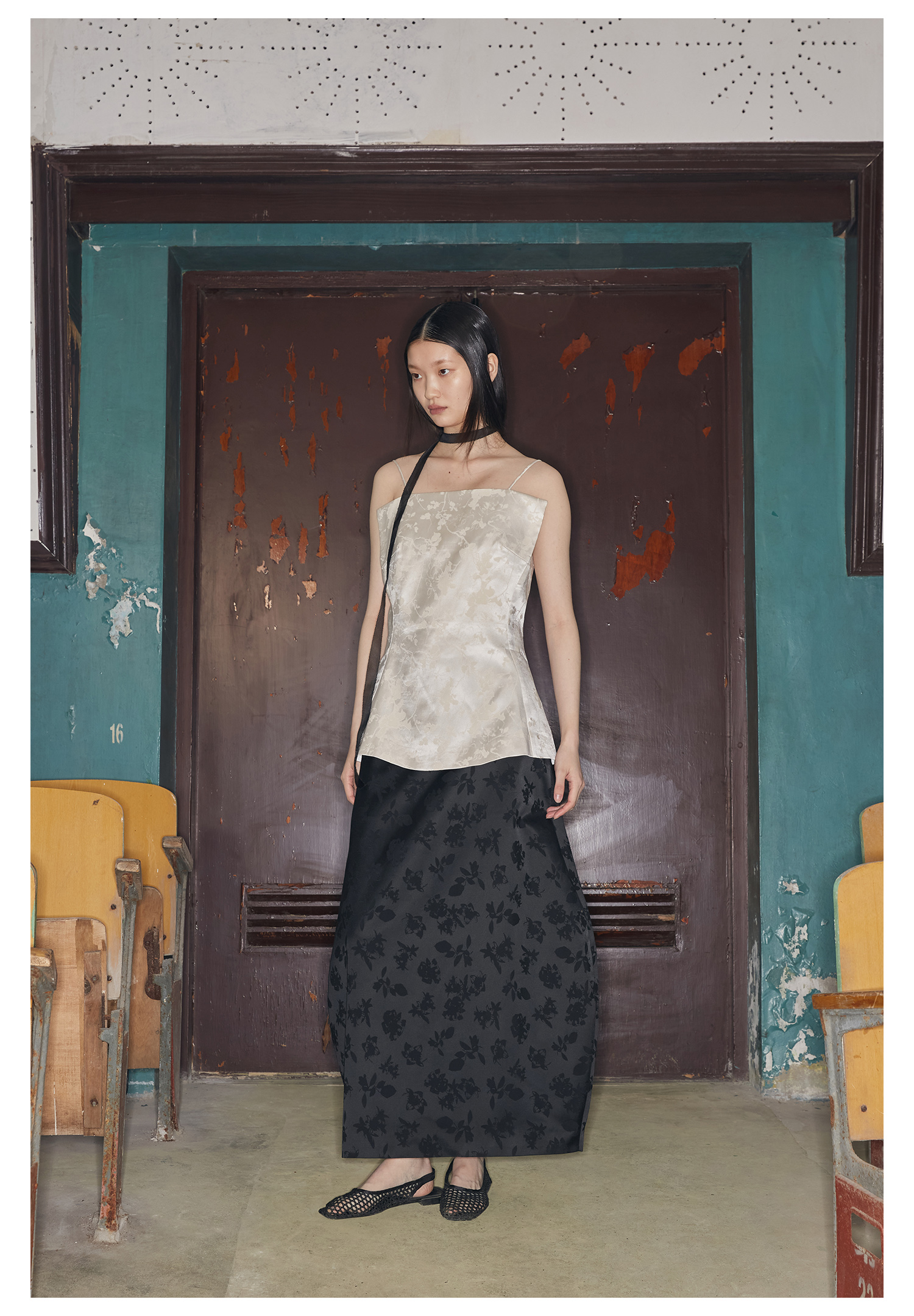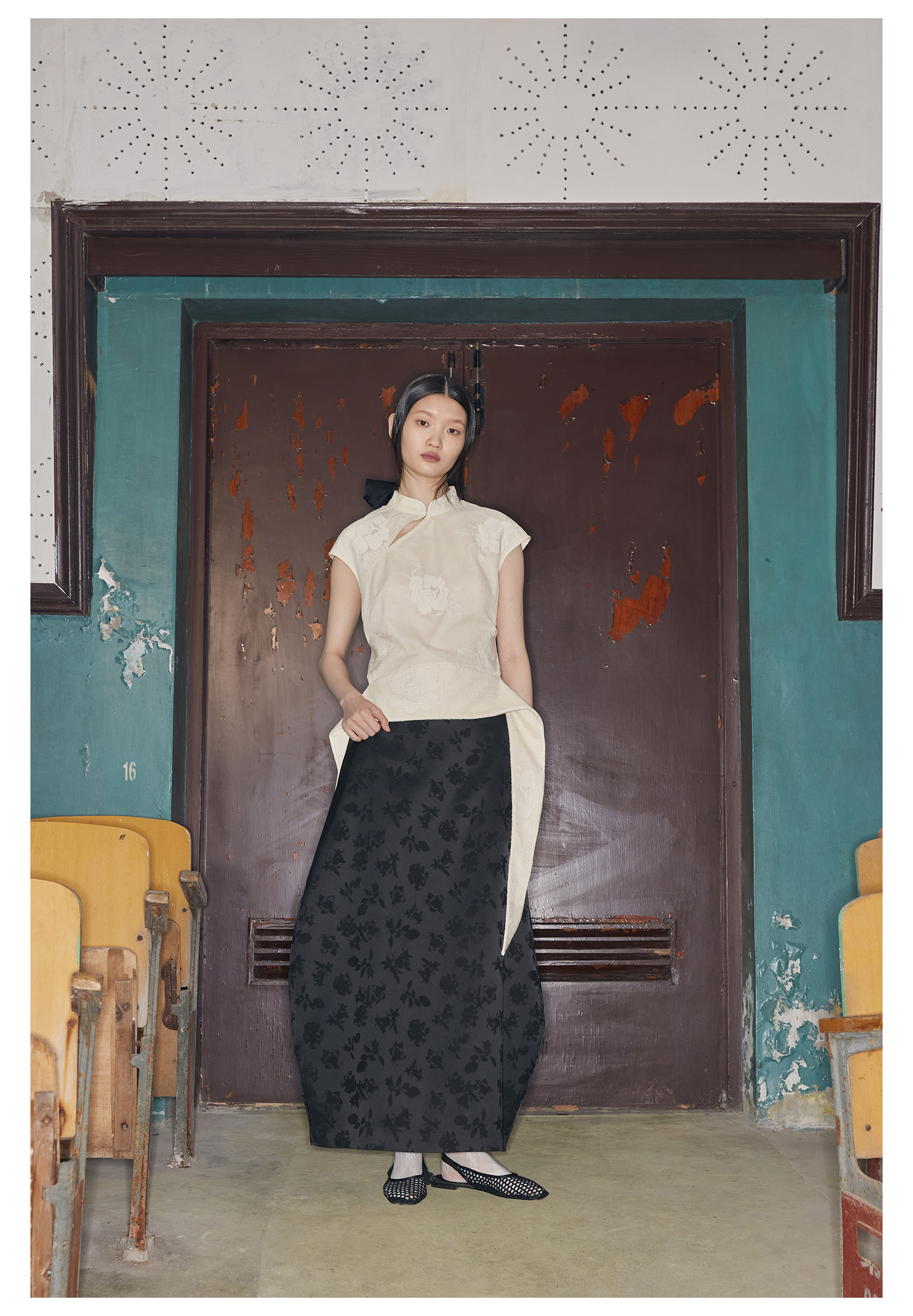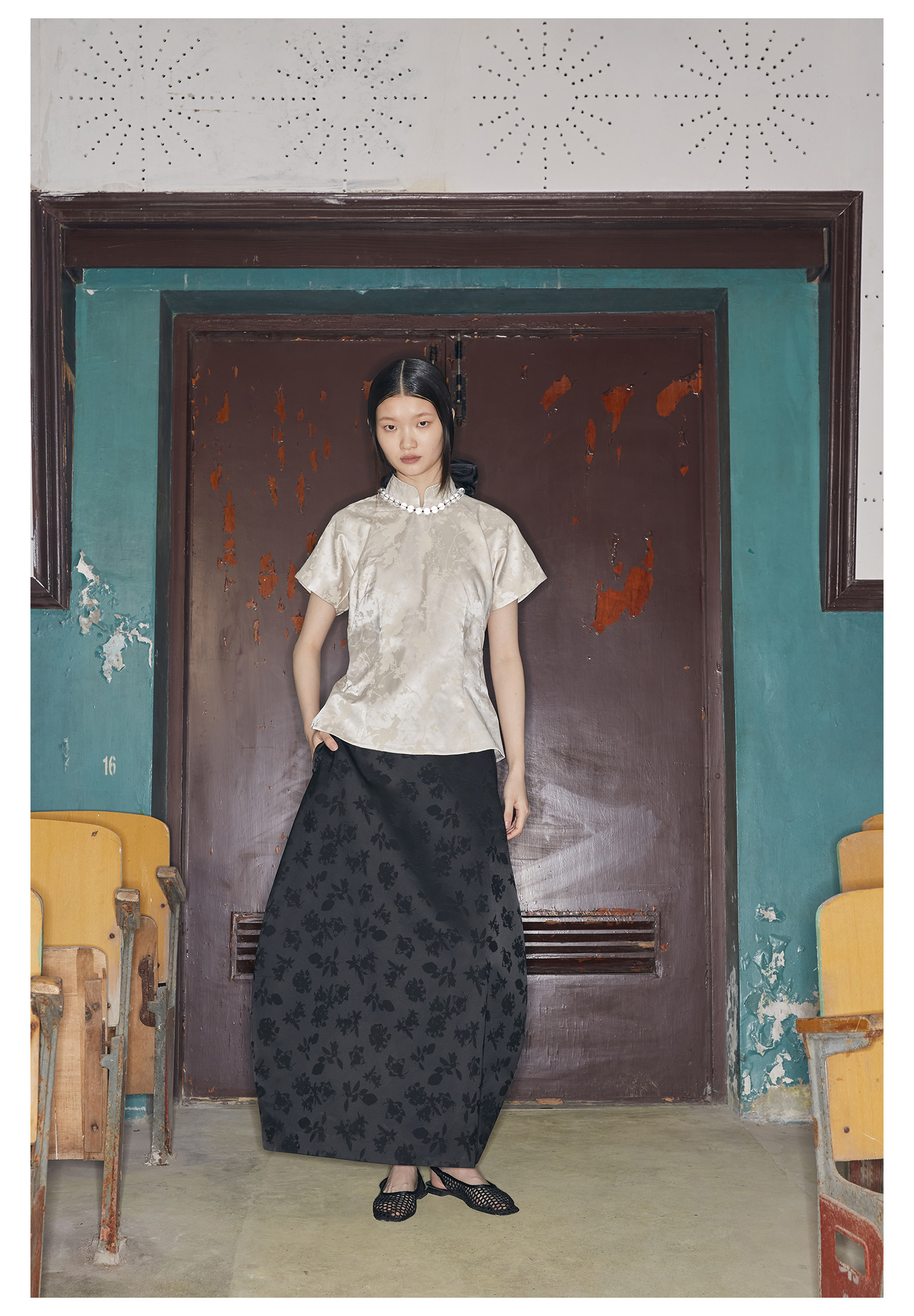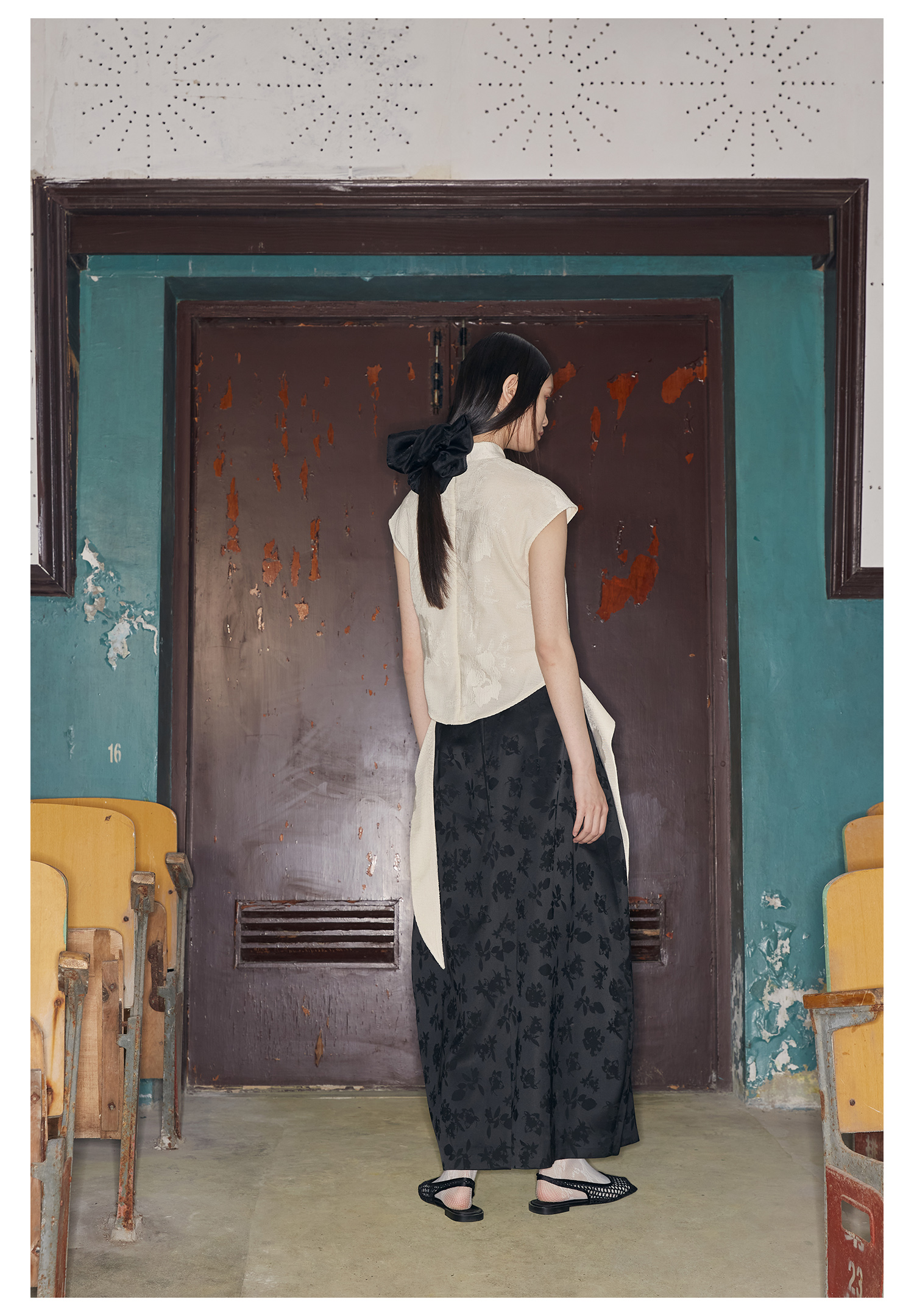ASAYA3374 Chinese Black Satin Jacquard Design Flower Bud Skirt