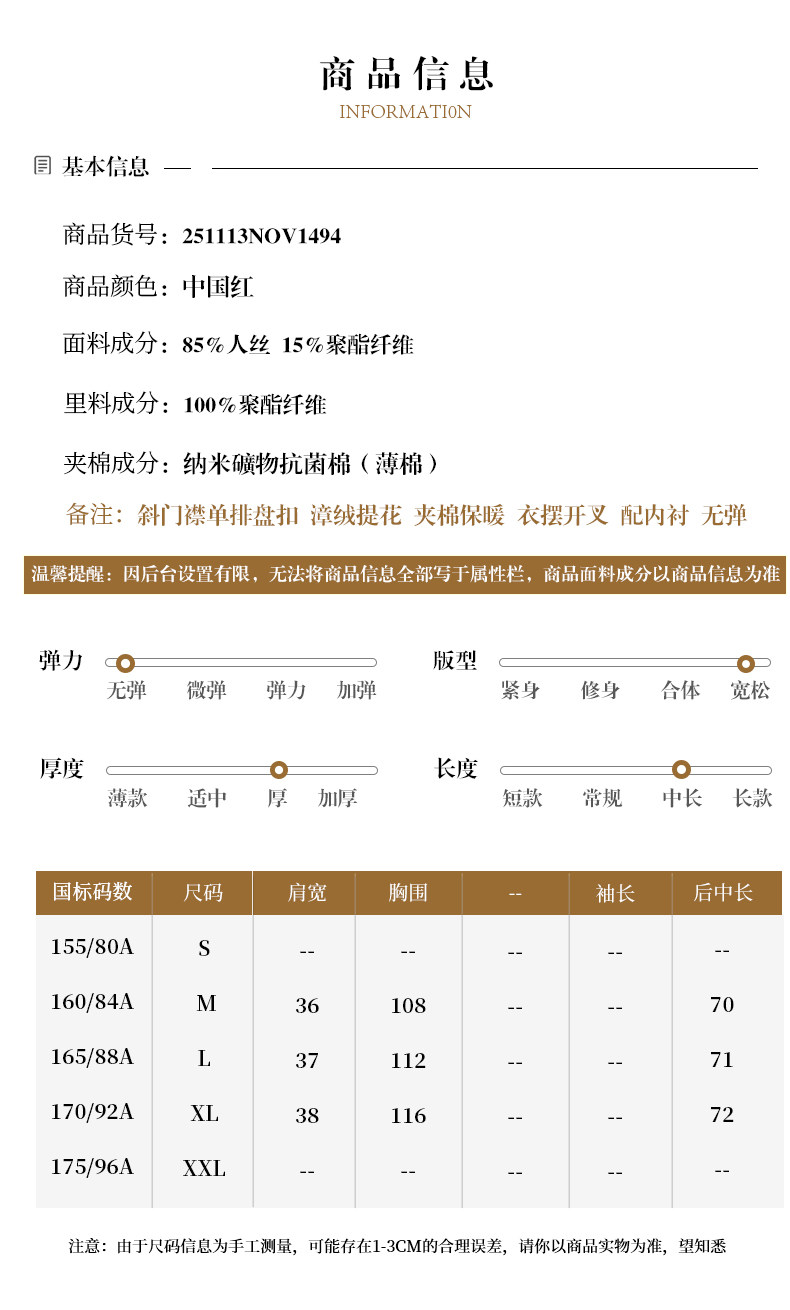 | Clothing placket | Single Breasted |