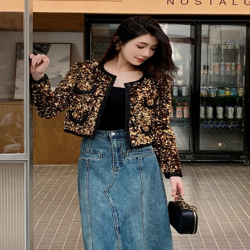 ASAYA2826 Dopamine outfit retro sequined long-sleeved round neck short top