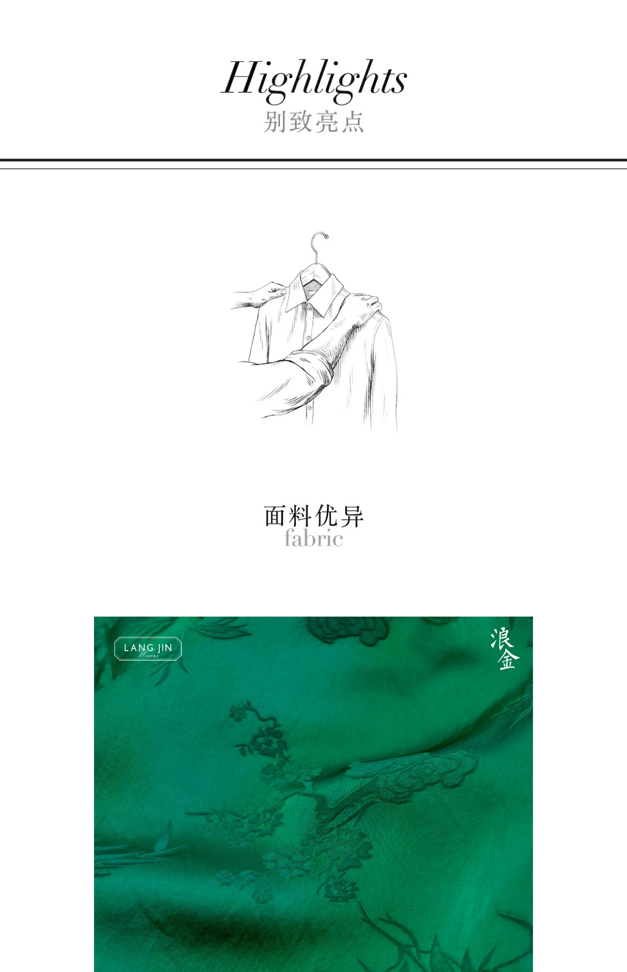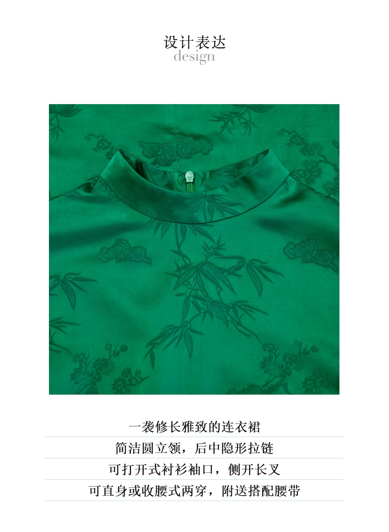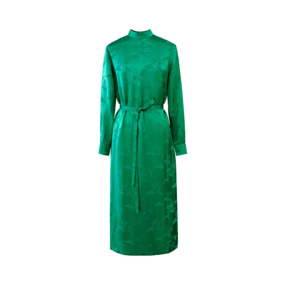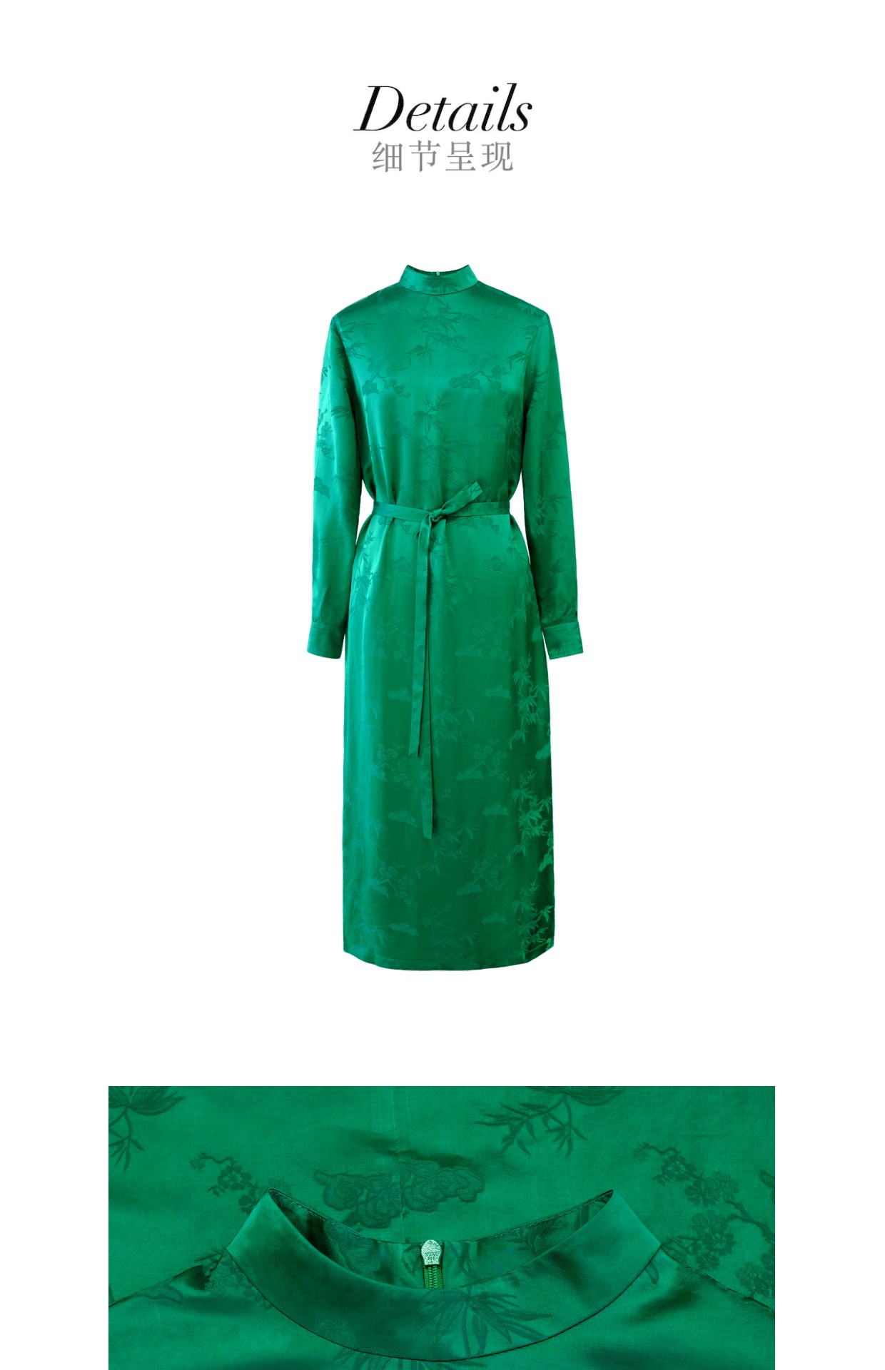 Asaya1349 - Stand up collar side slit dress silk jacquard long sleeved waist cinching tie H shaped long skirt children s style langjin gold