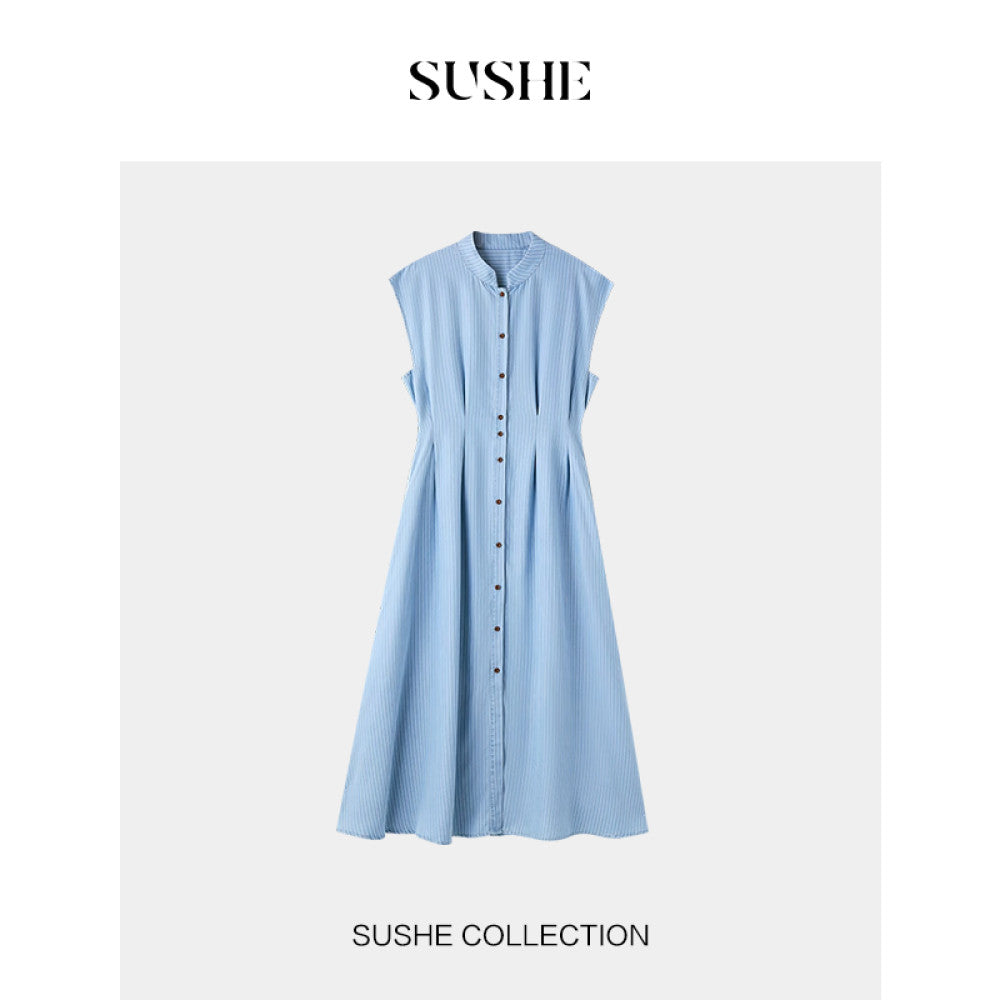 ASAYA3487 Cool Cloud Soft New Tencel Blue and White Striped Shoulder Sleeve French Waist A-Line Dress