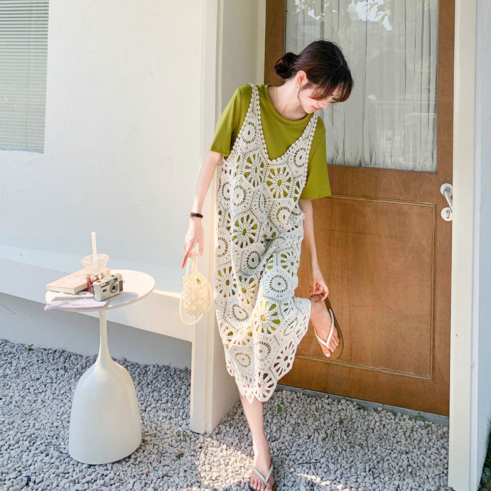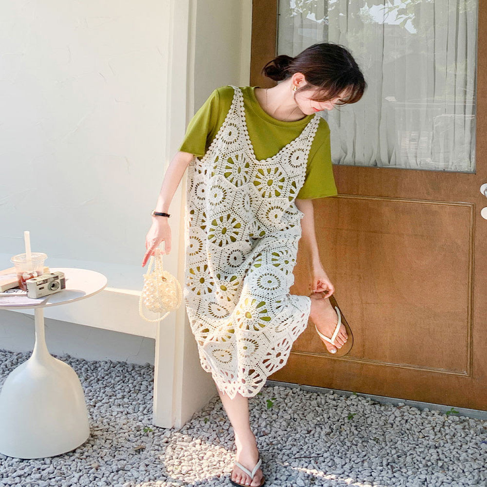 ASAYA3664 T-shirt dress with layer knitted suspender dress (two-piece suit)