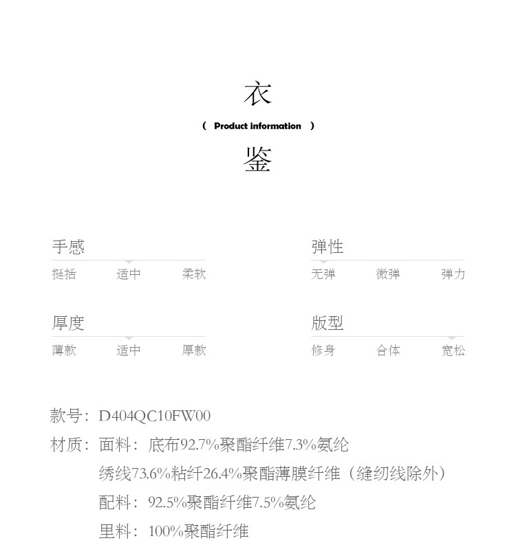 | Material composition | Polyester fiber 92.7% polyurethane elastic fiber (spandex) 7.3% |