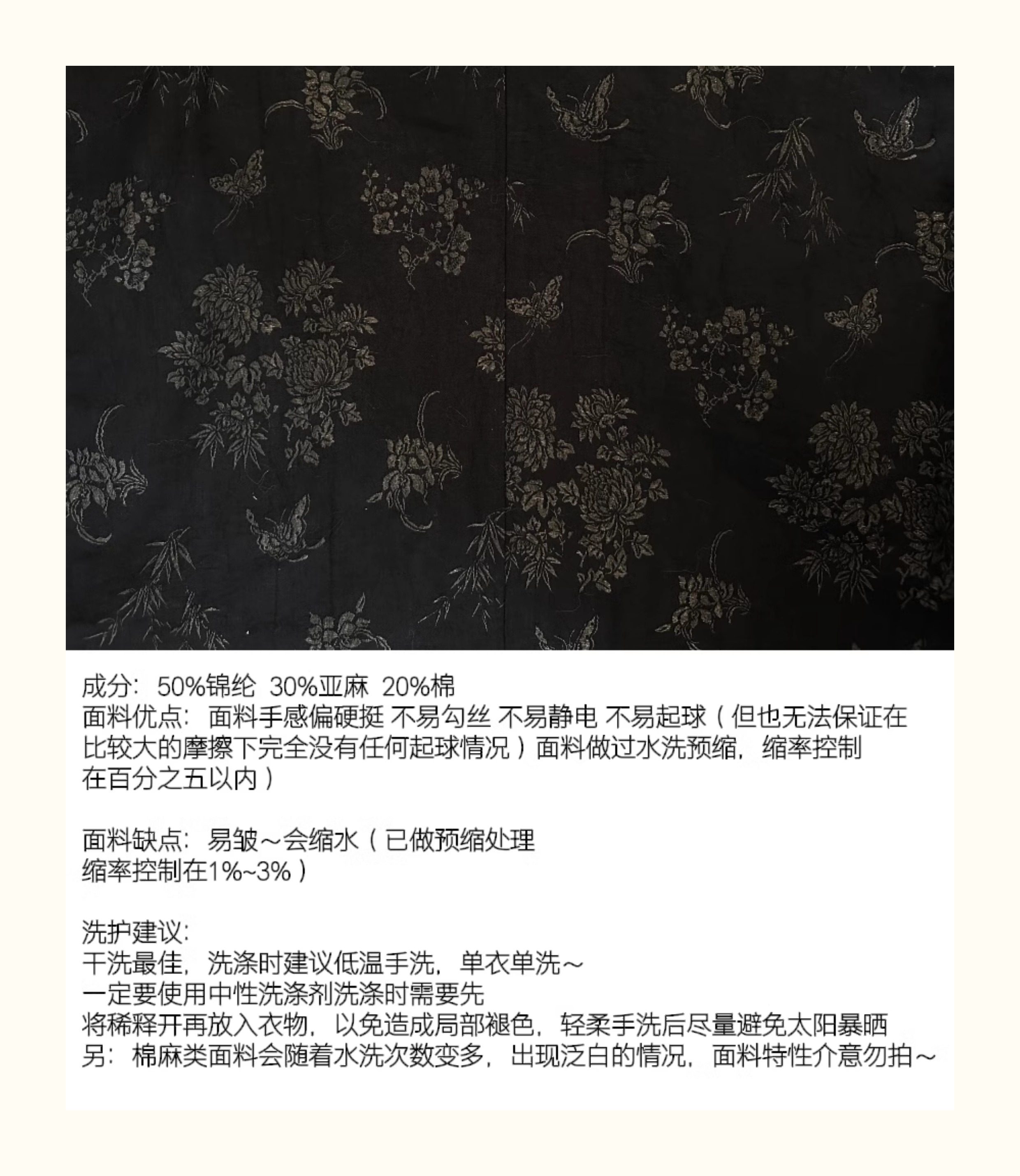 | Material composition | Polyamide fiber (nylon) 50% linen 30% cotton 20% |