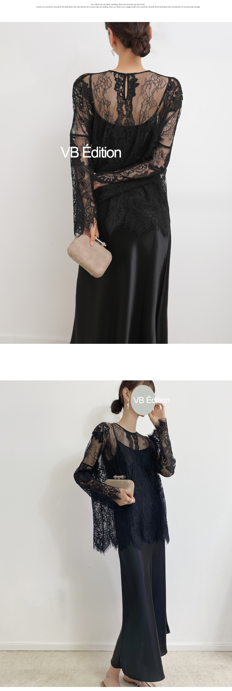 圆领设计,简单大方,领后一粒暗扣,穿脱随意时尚,下摆与袖口“睫毛”样式,与蕾丝取得微妙的平衡感。