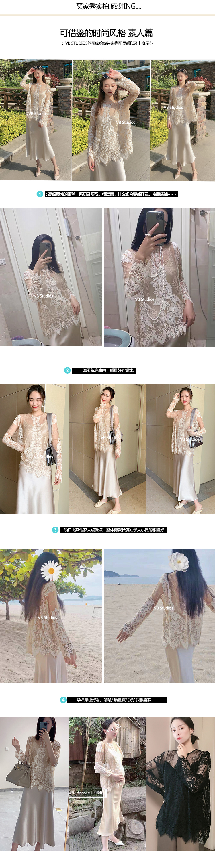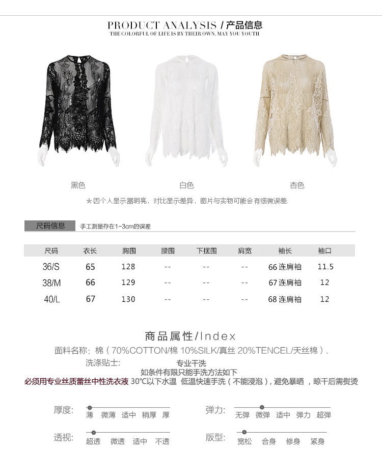所以整件蕾丝,虽然面料柔软细腻。但是因为整体的工艺制作给了它灵魂,使其有筋骨感。不会是软趴趴的附着在身体上。所以才会有很多买家觉得为什么这件蕾丝上身很显瘦。孕妇穿,体型丰满点的女生穿都很好看。