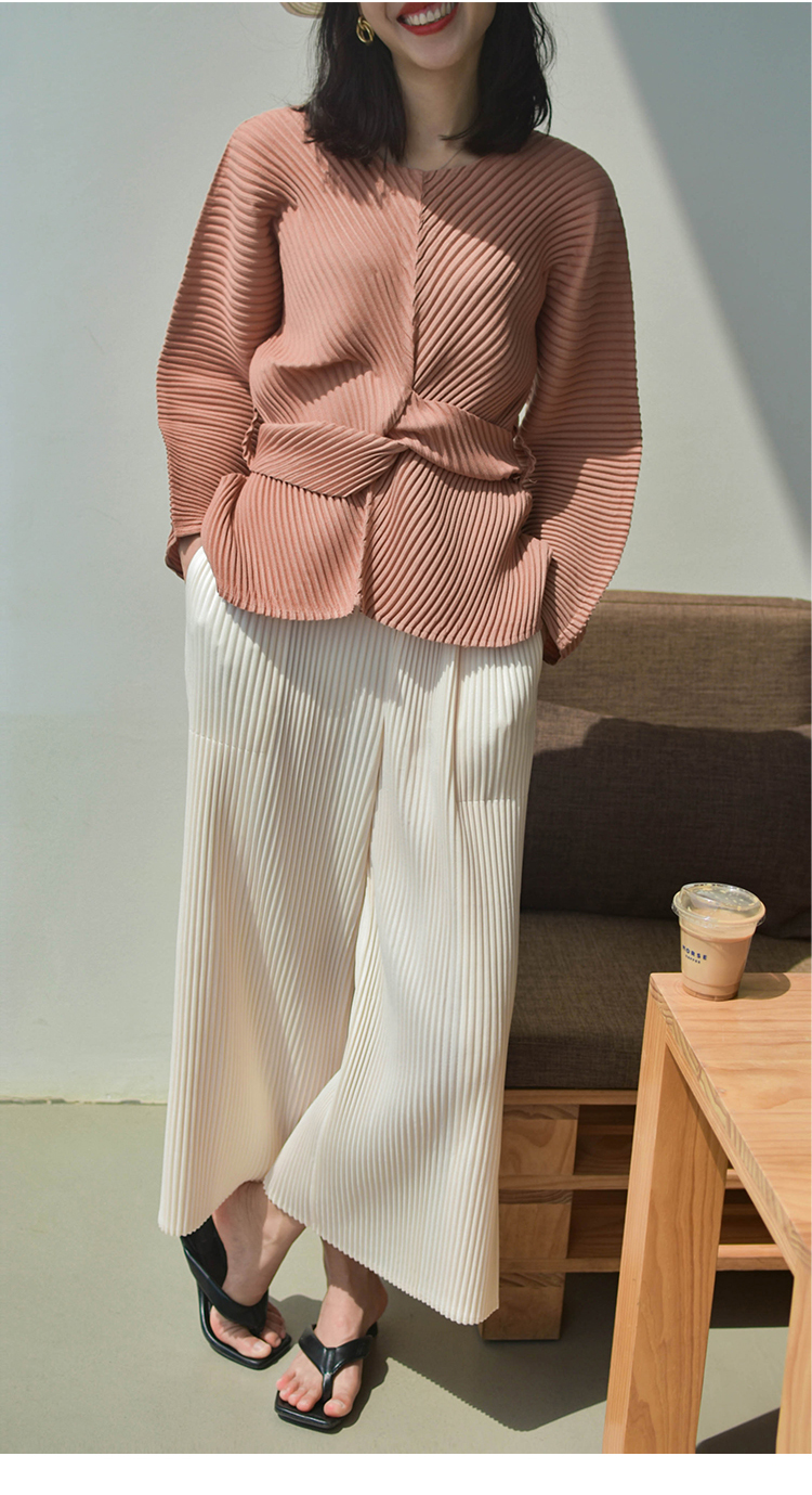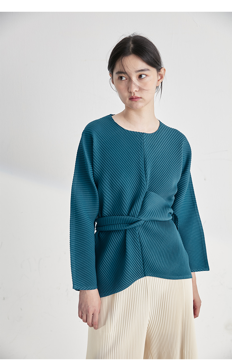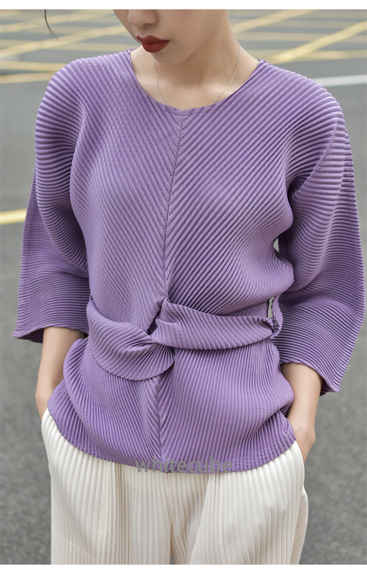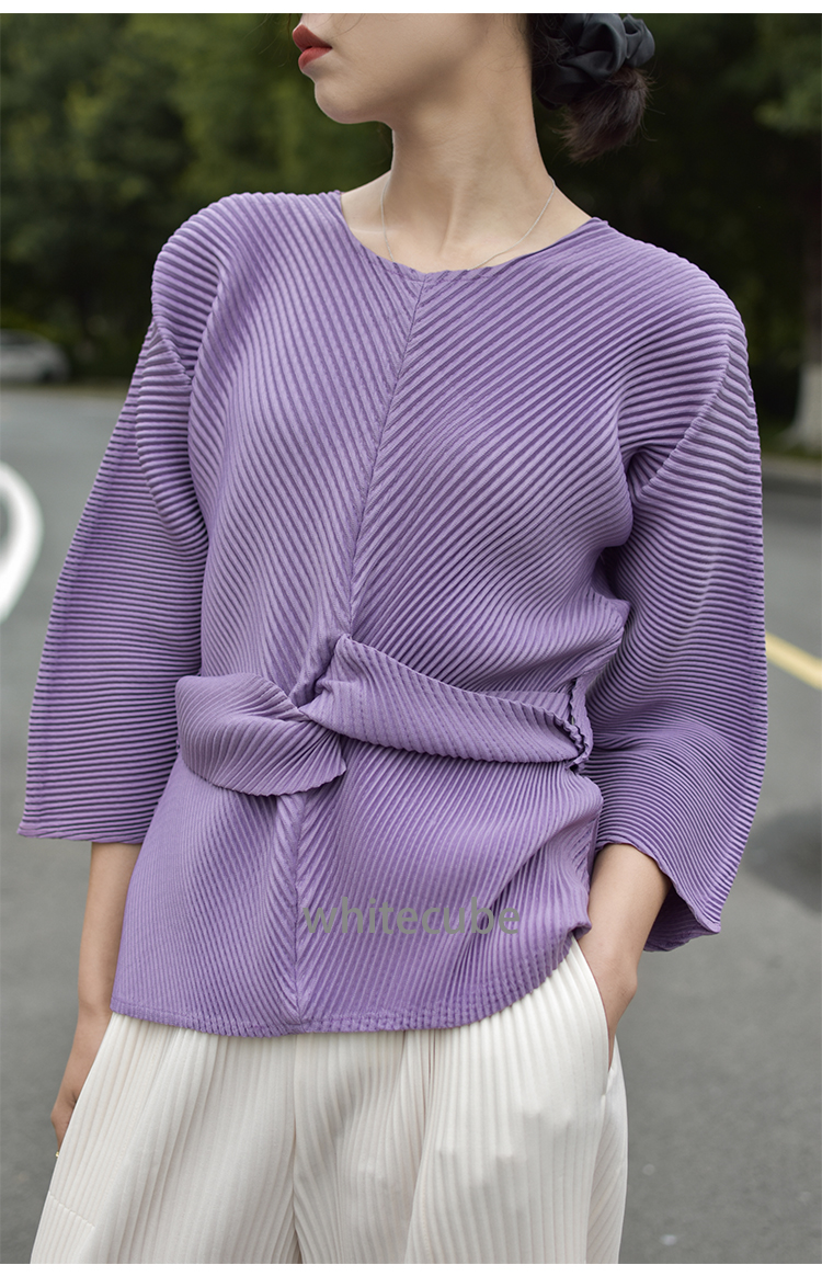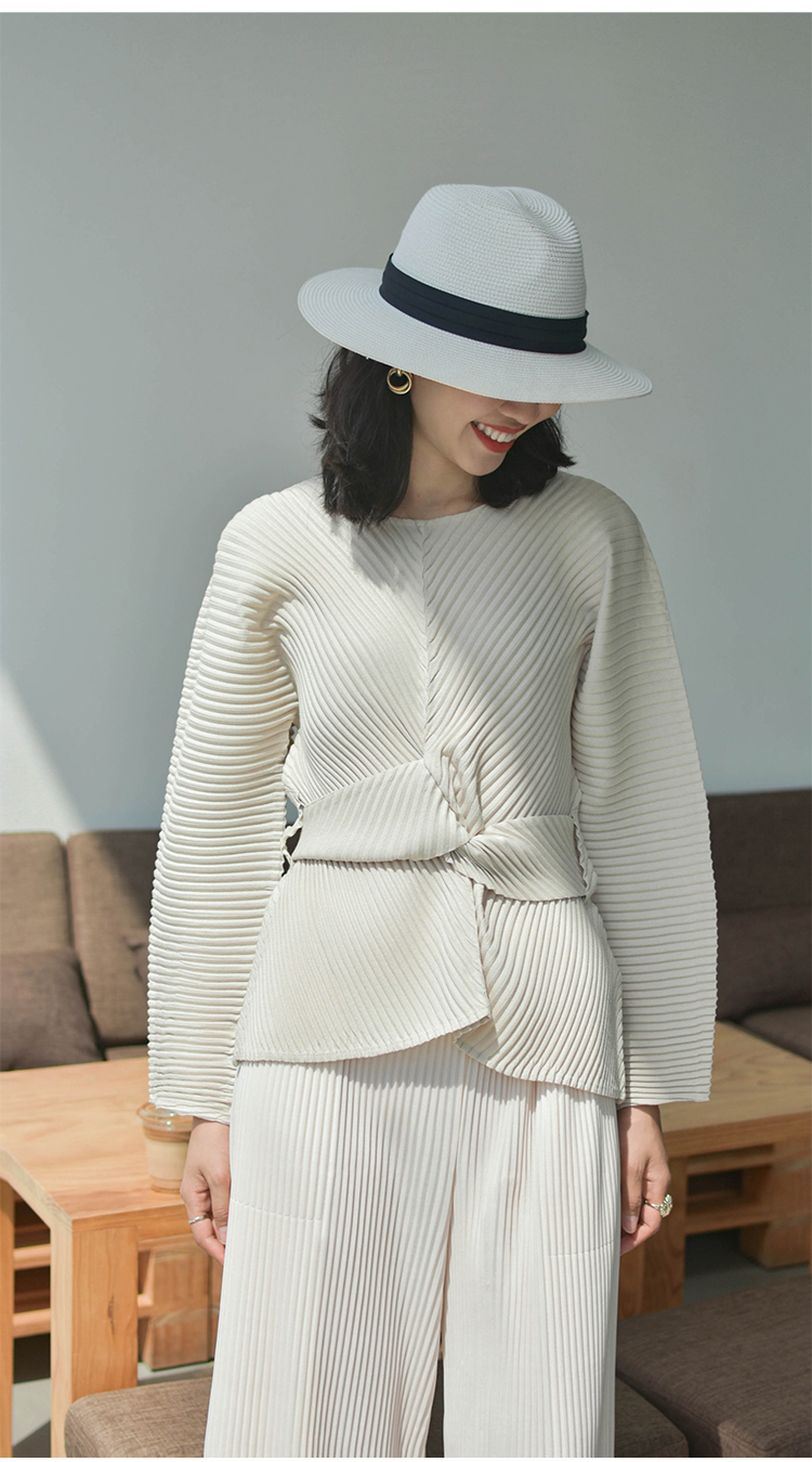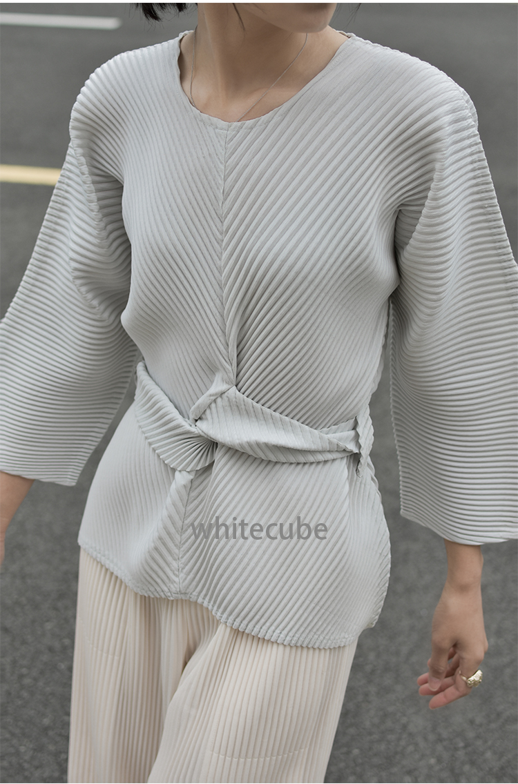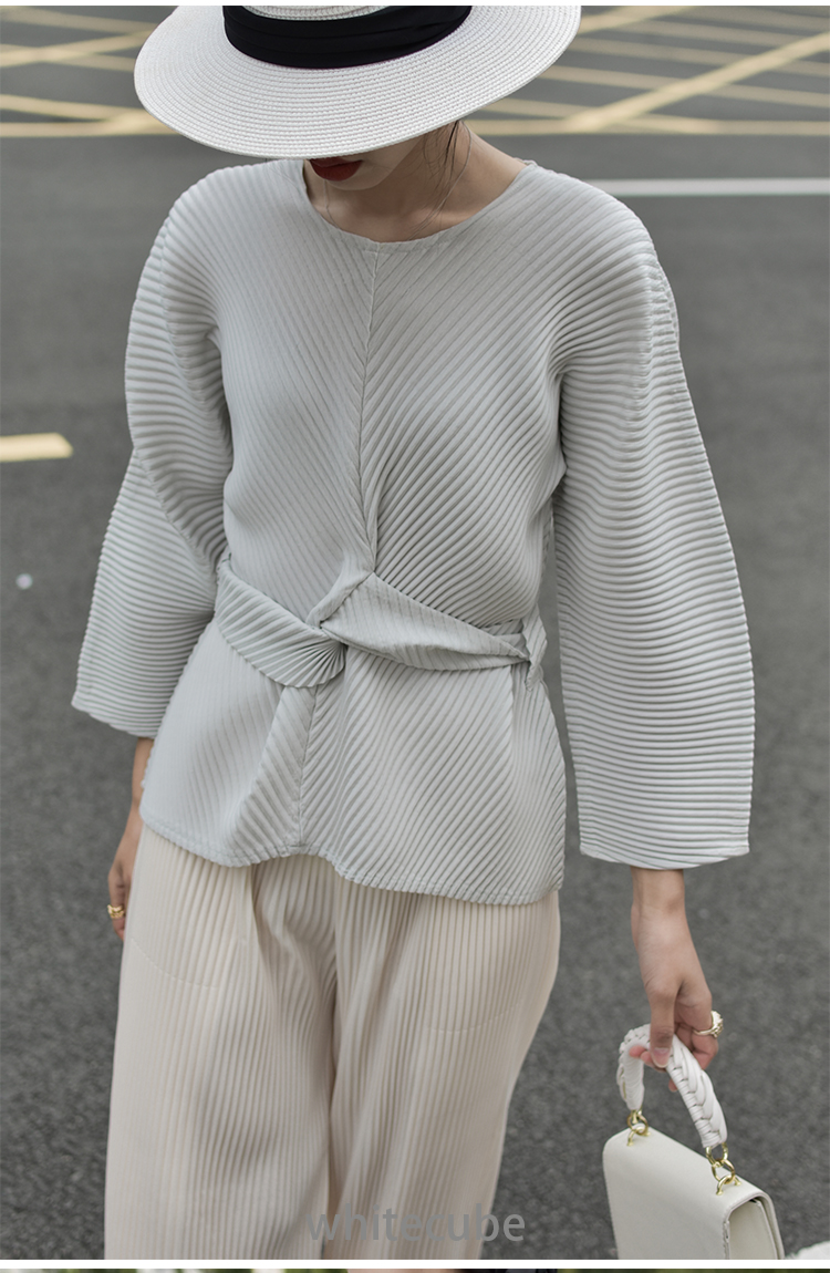 Asaya704 - Whitecube2024 Spring Miyake style pleated round neck tied waist shirt loose hanging shirt top for women